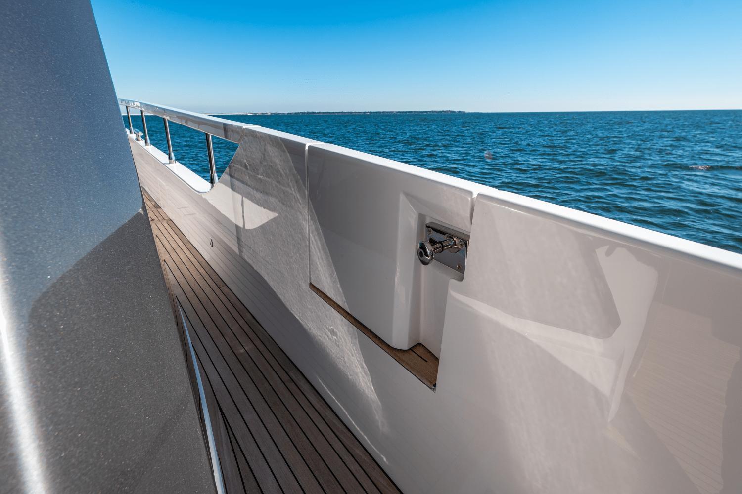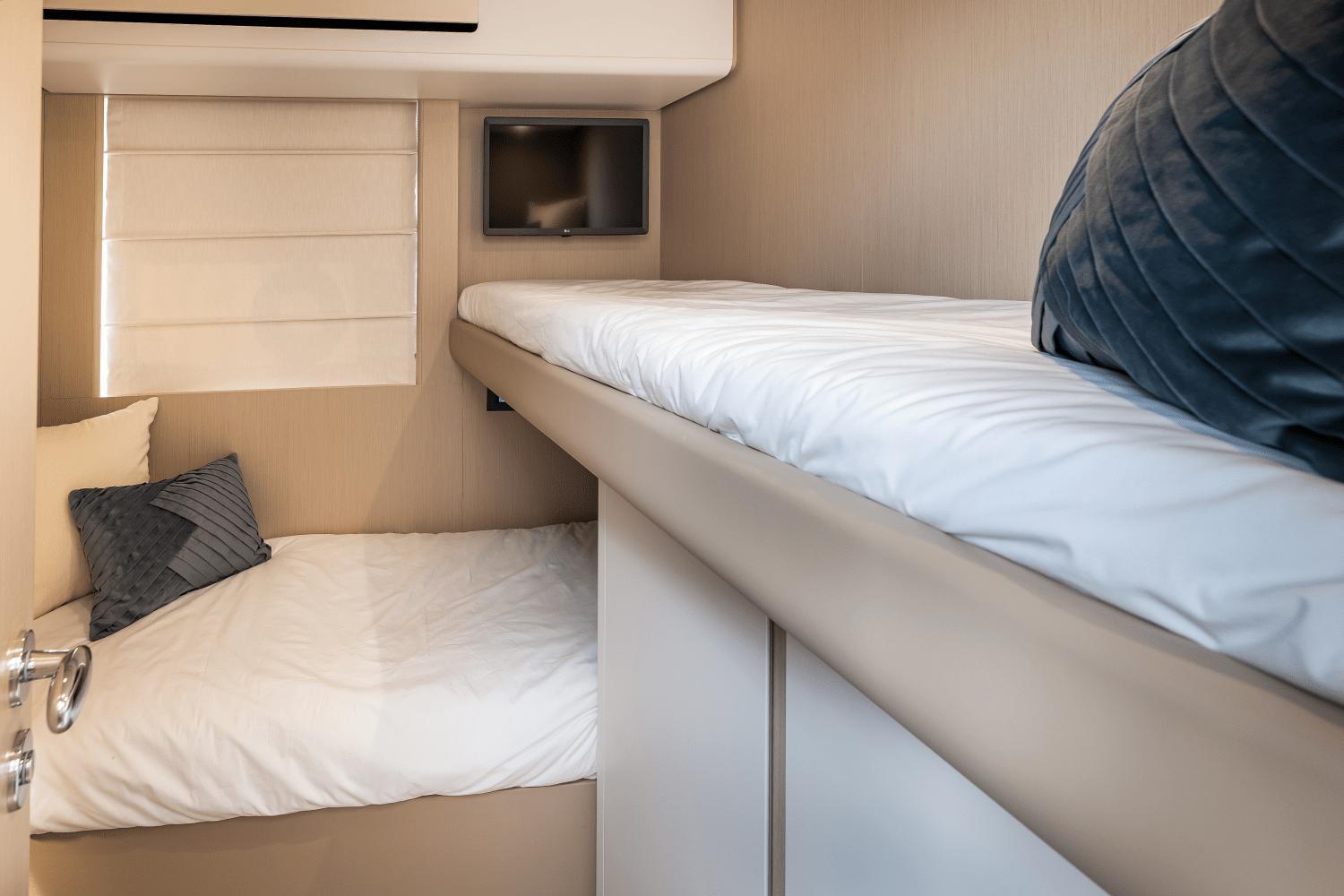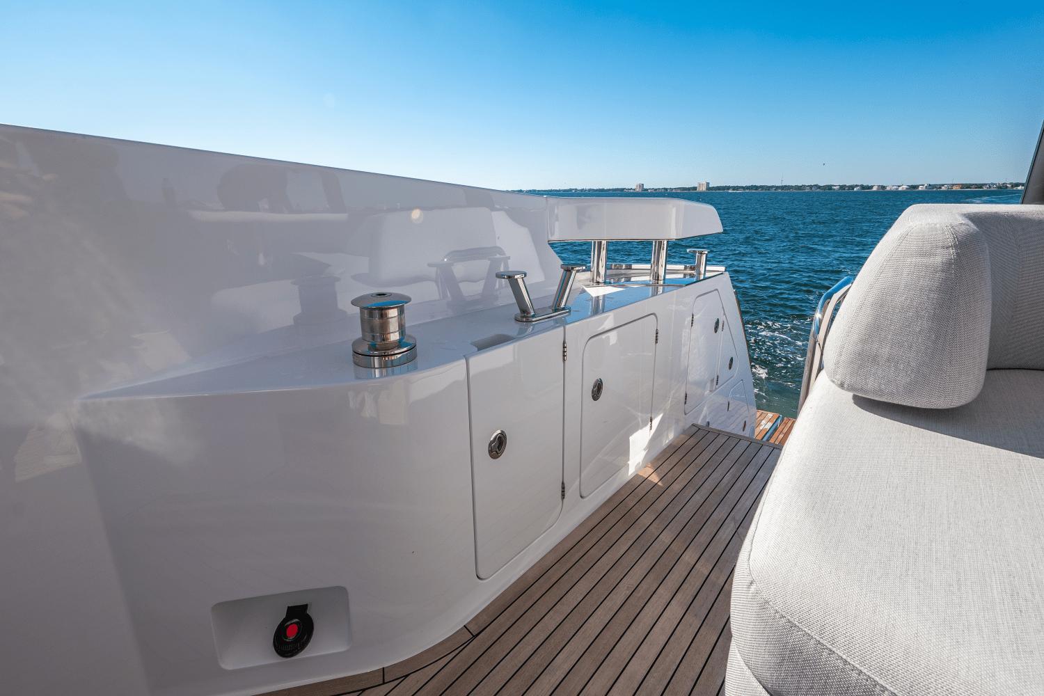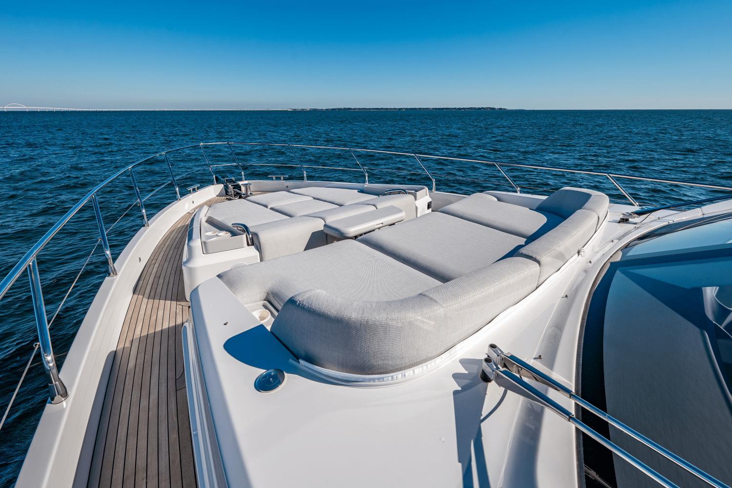- FOREDECK LOUNGE W/CONVERTIBLE BENCH/SUNBED IN BATYLINE FABRIC & CORIAN LATERAL TRAYS
