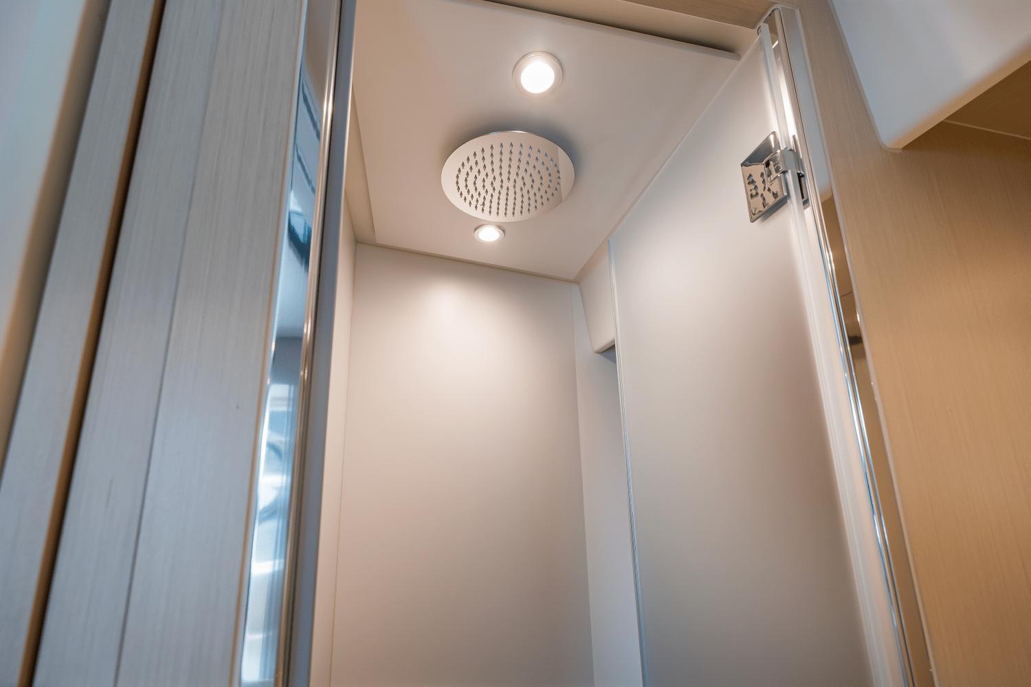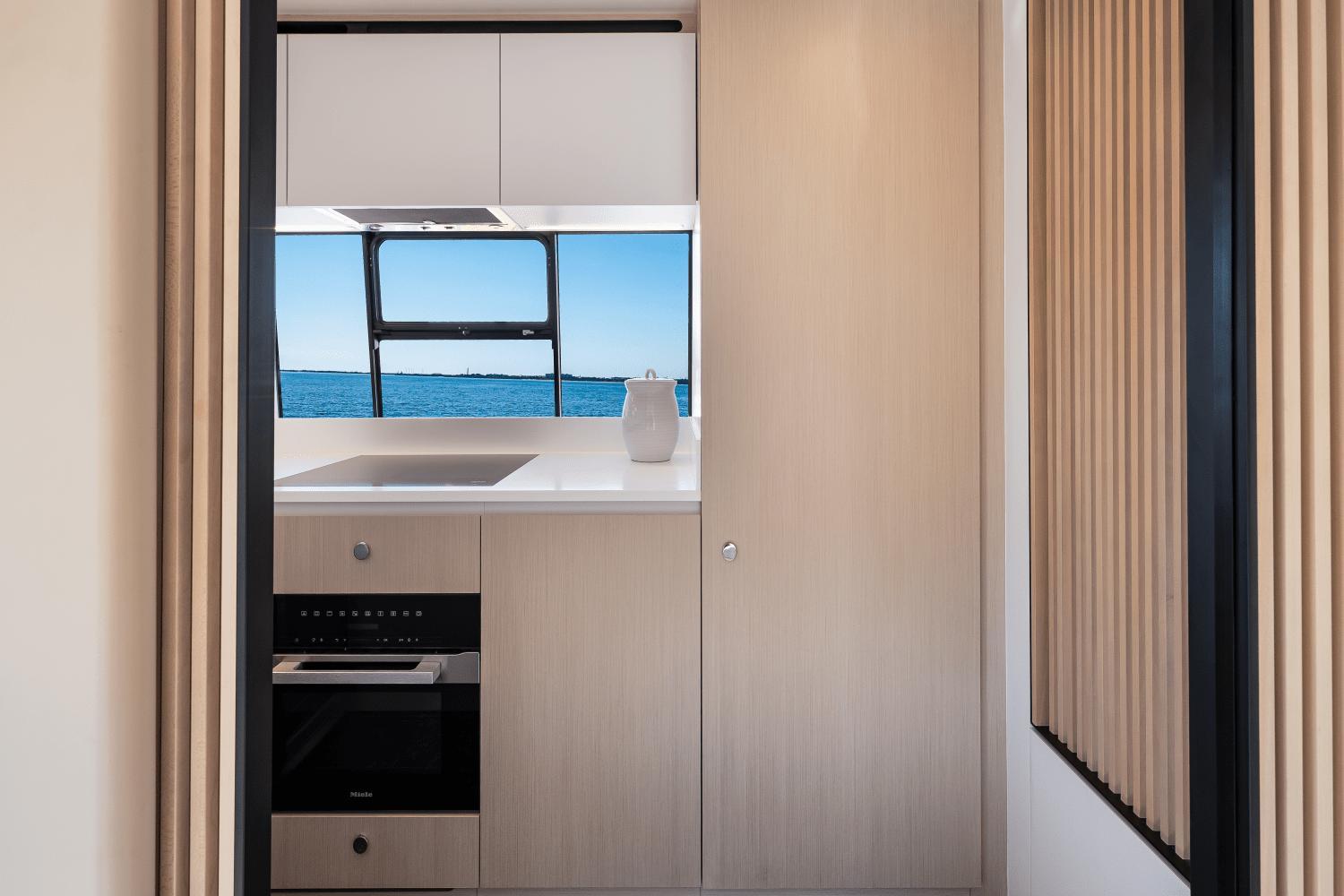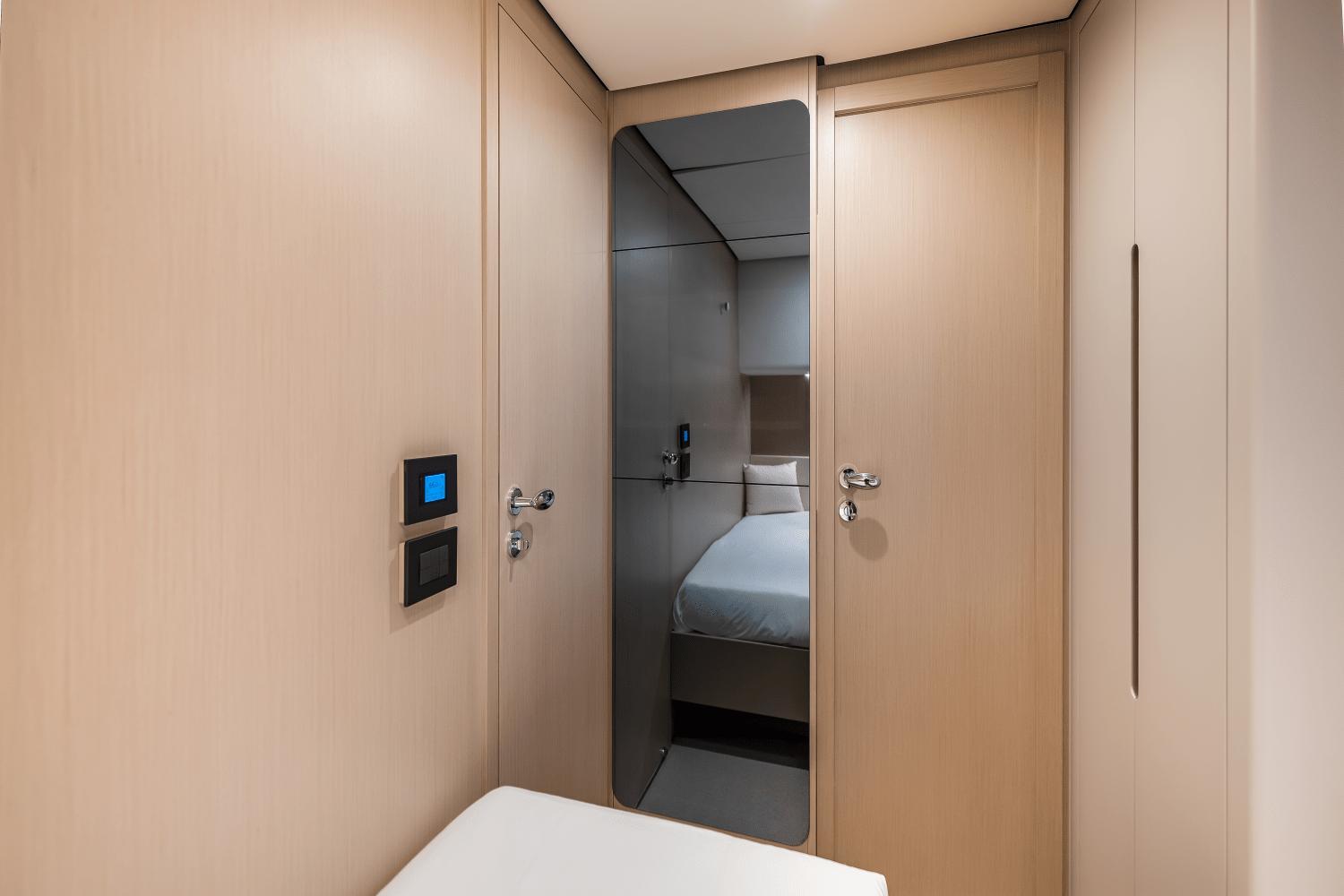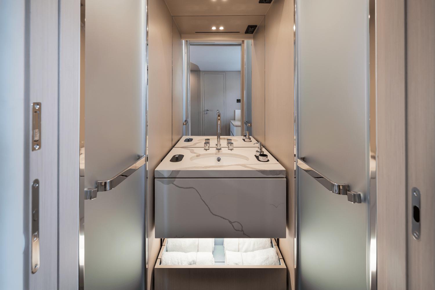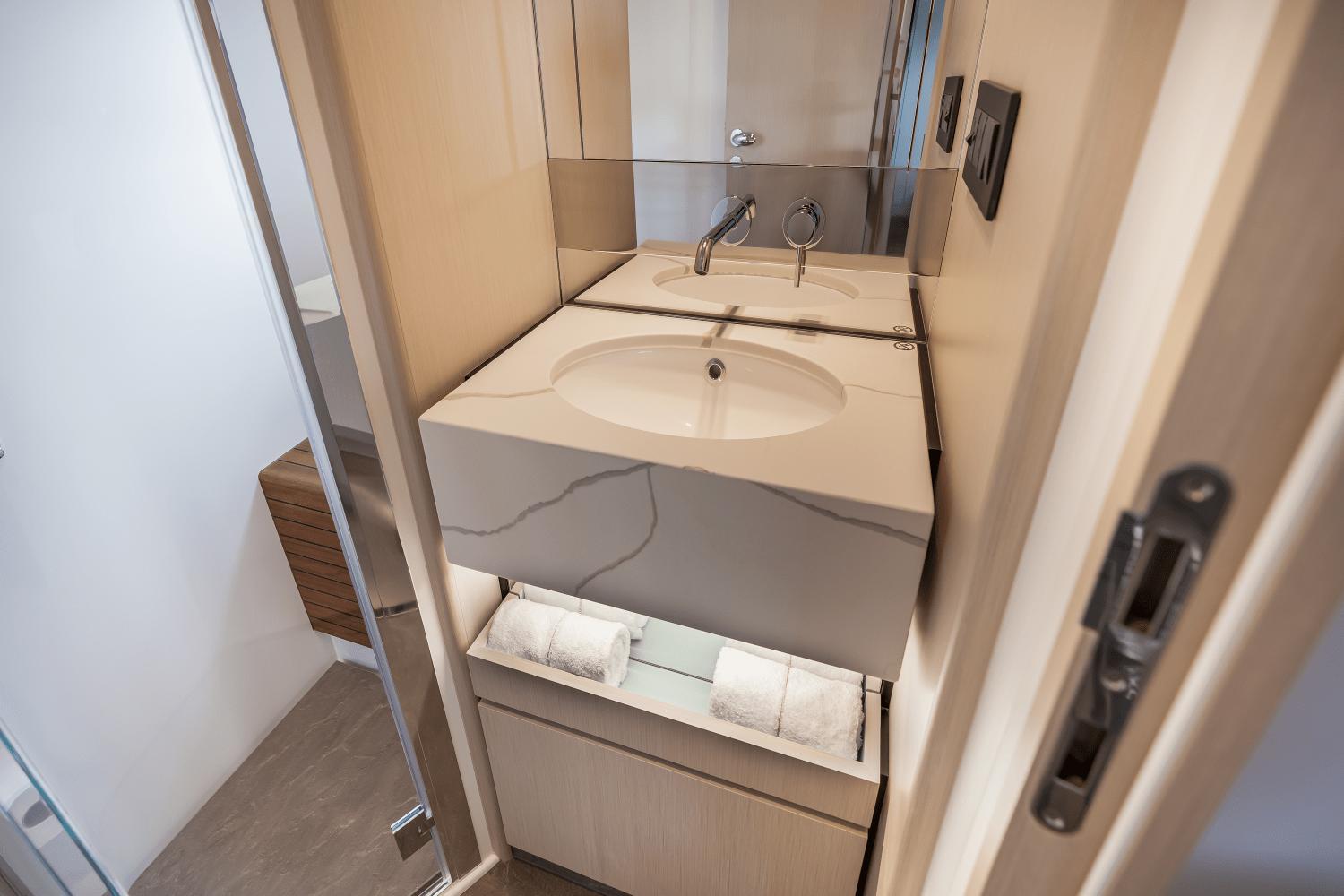 - FOREDECK LOUNGE W/CONVERTIBLE BENCH/SUNBED IN BATYLINE FABRIC & CORIAN LATERAL TRAYS