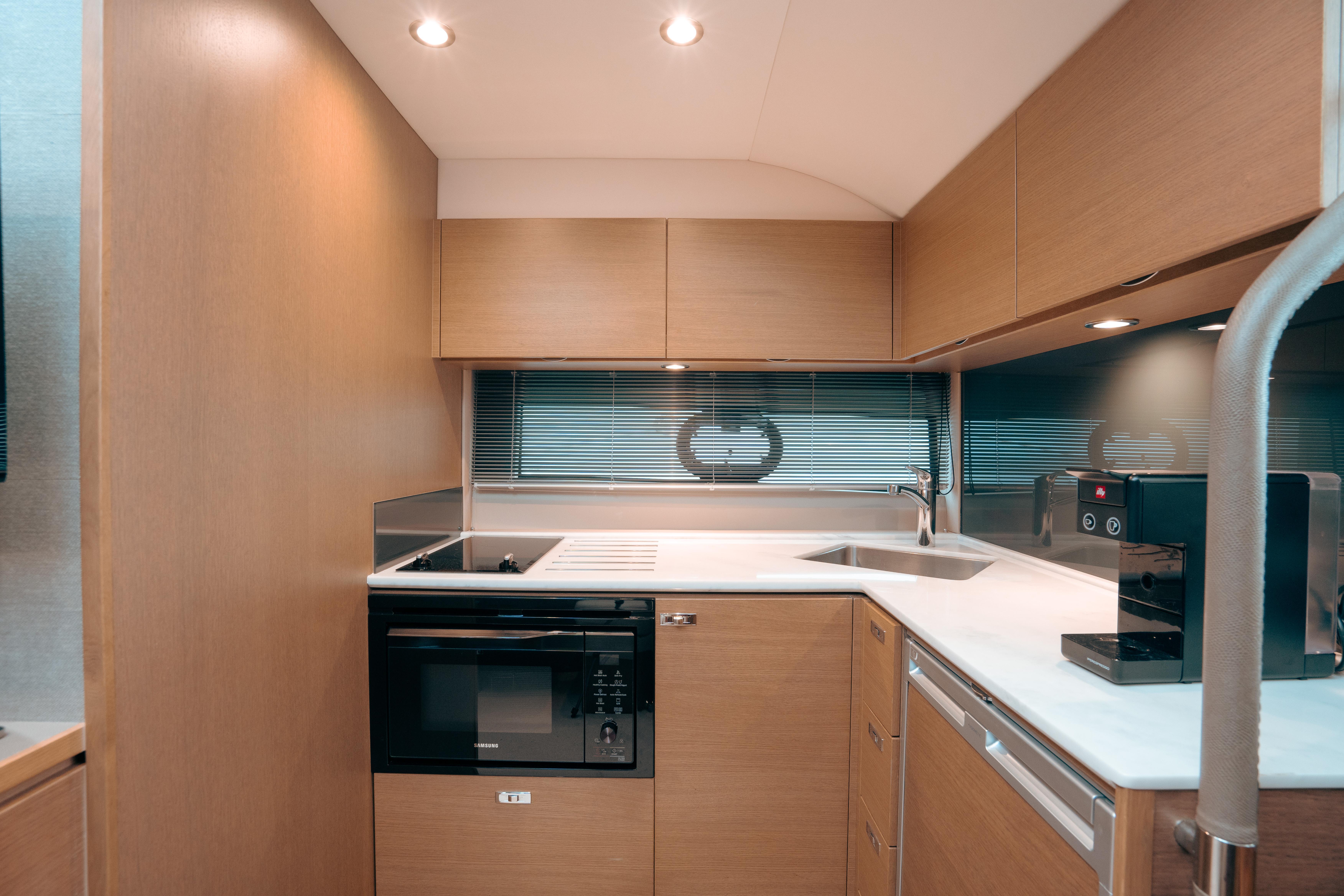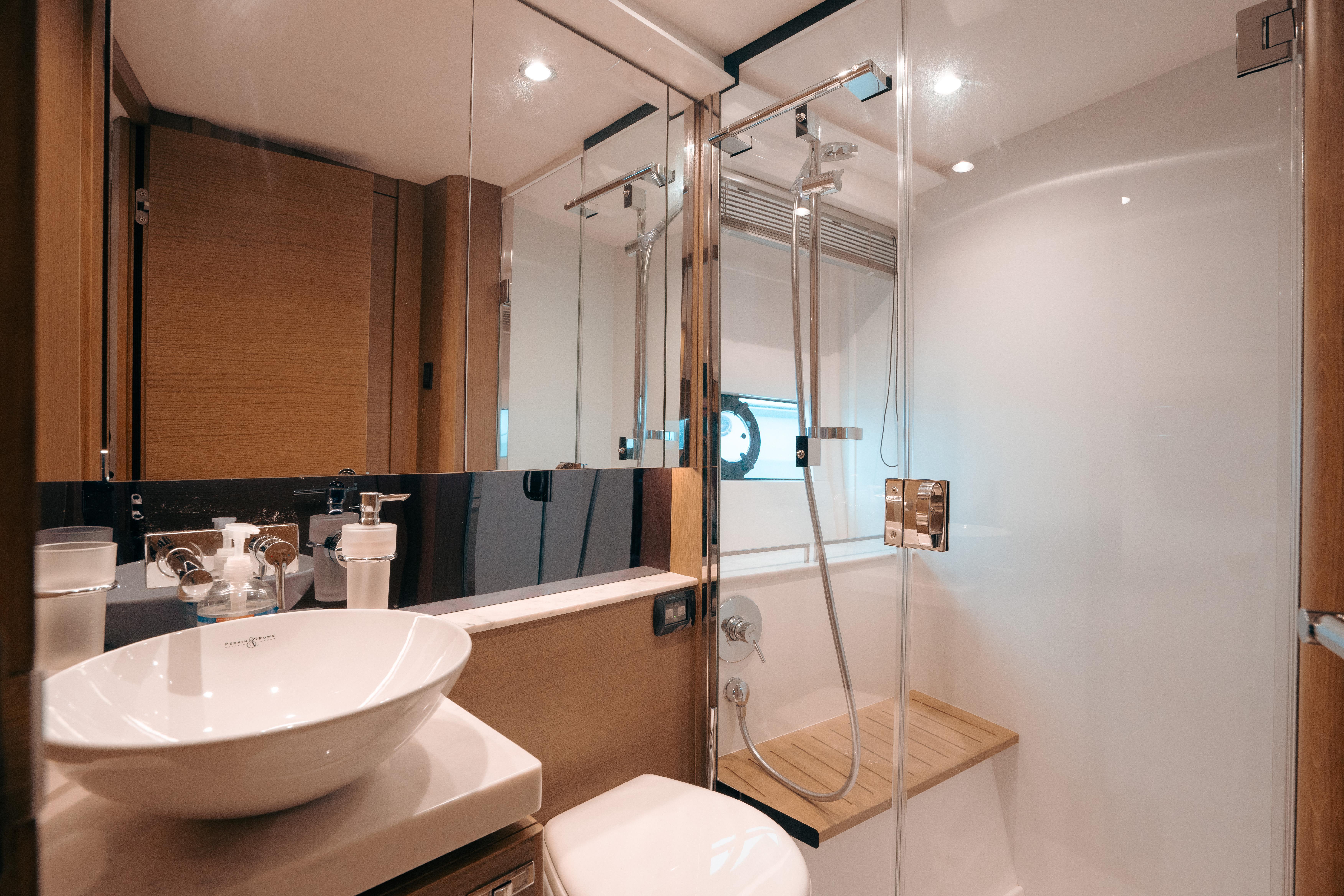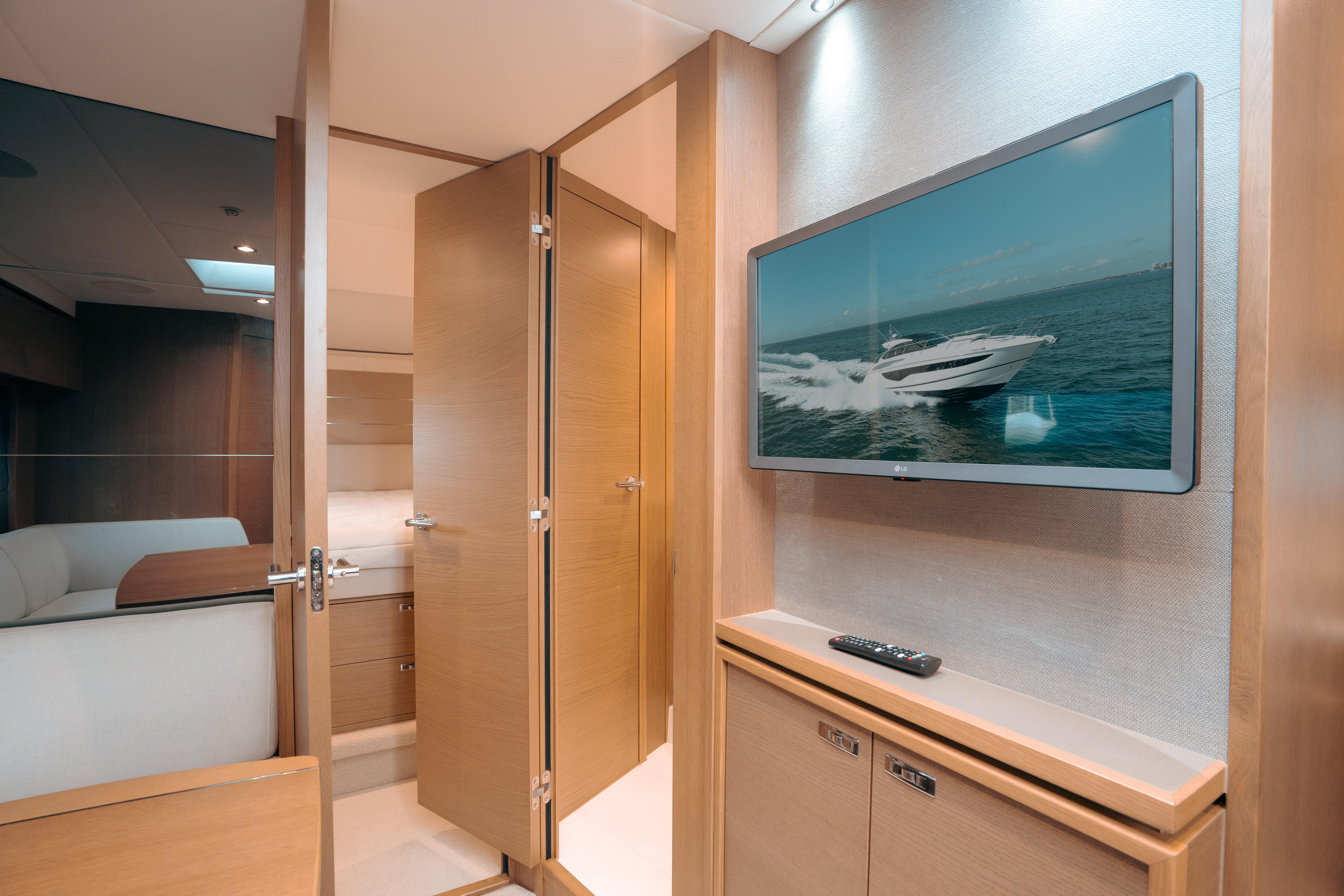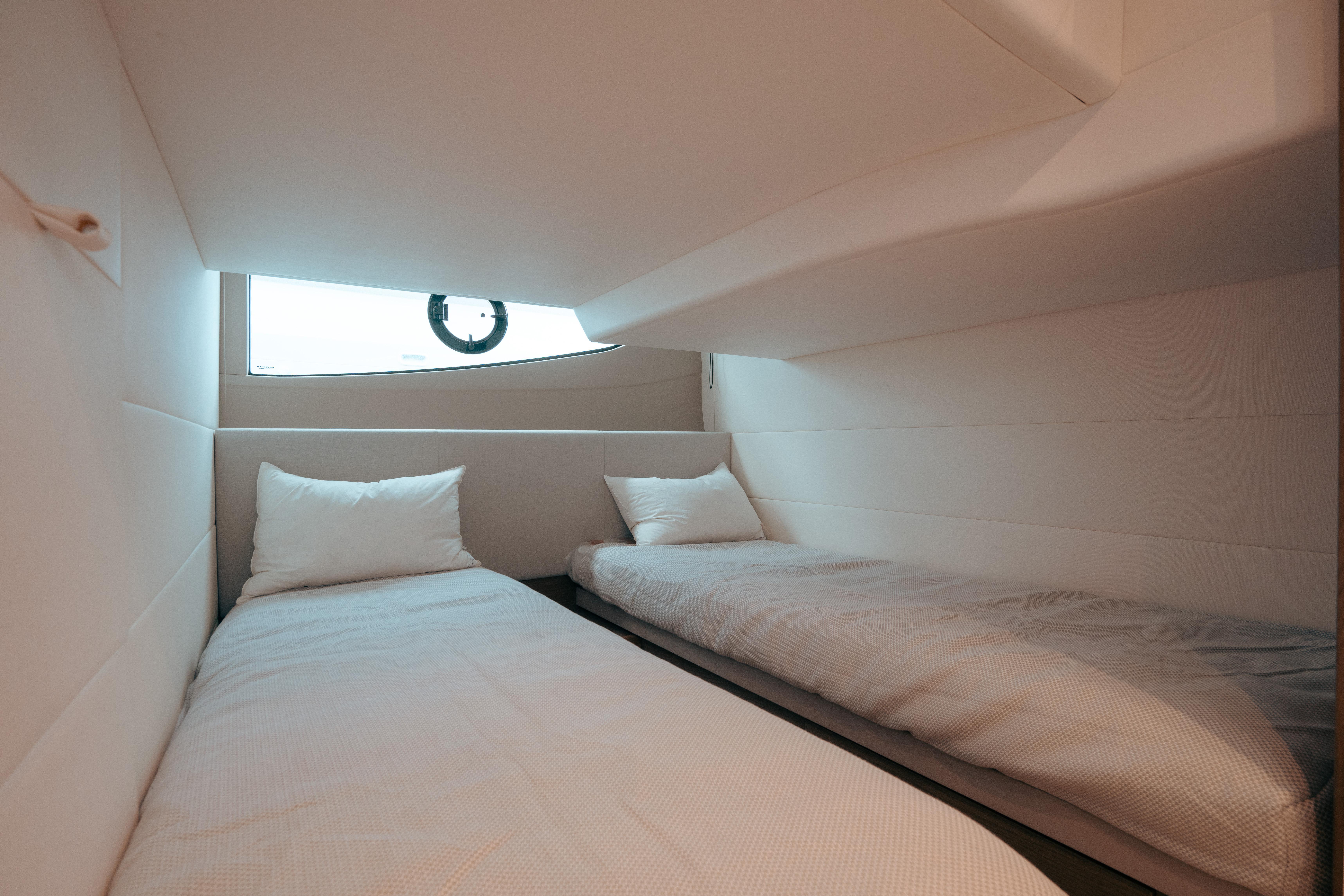 Below deck, her pewter grey and off-white colour palette depict the modern V Class look throughout. Her spacious saloon and well equipped galley combine for a highly sociable entertaining space, while both cabins exude contemporary style and generous proportions. The forward cabin has an en-suite bathroom with secondary access to the saloon whilst the aft cabin can be fitted with optional sliding berths to provide easy conversion to a double when required.