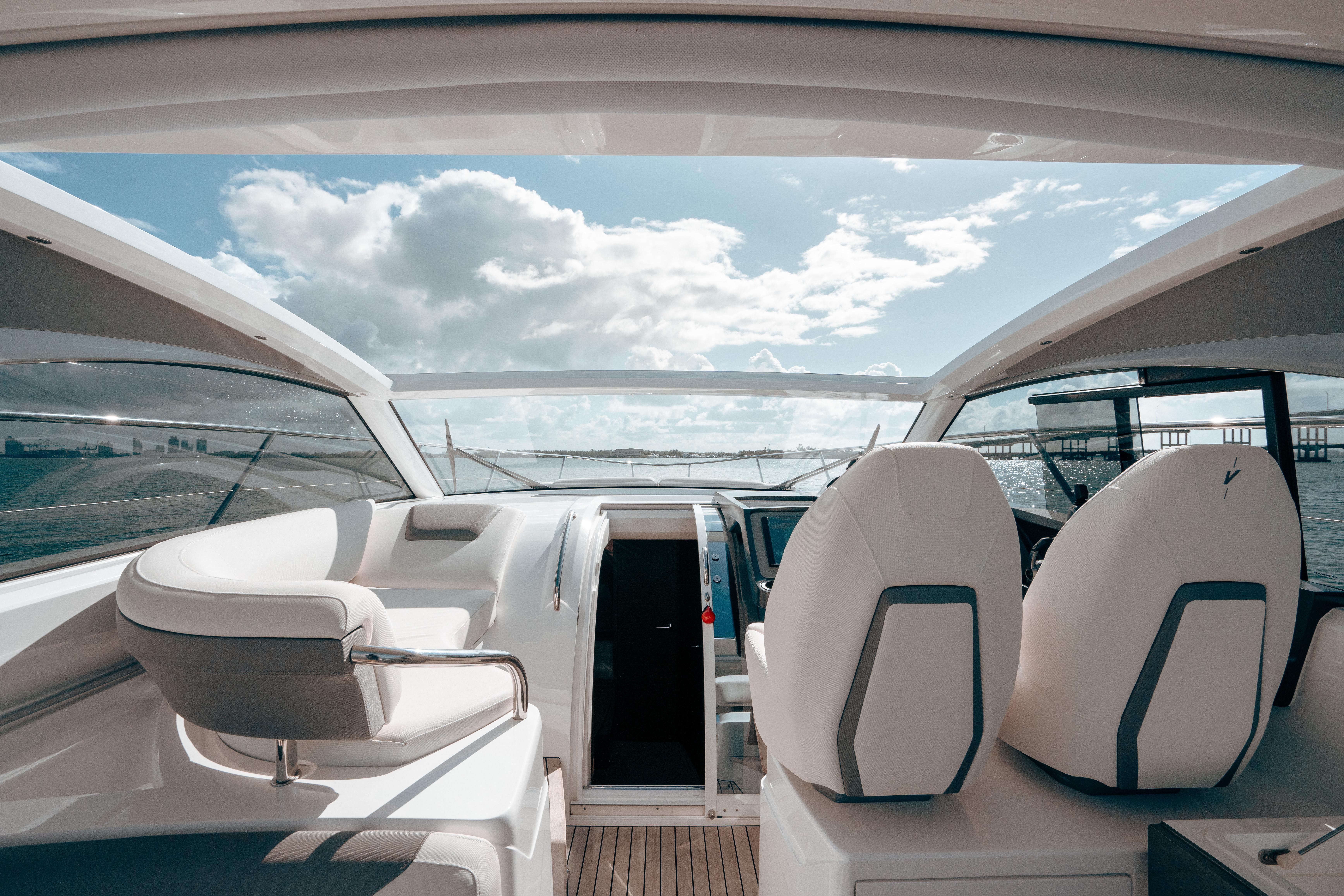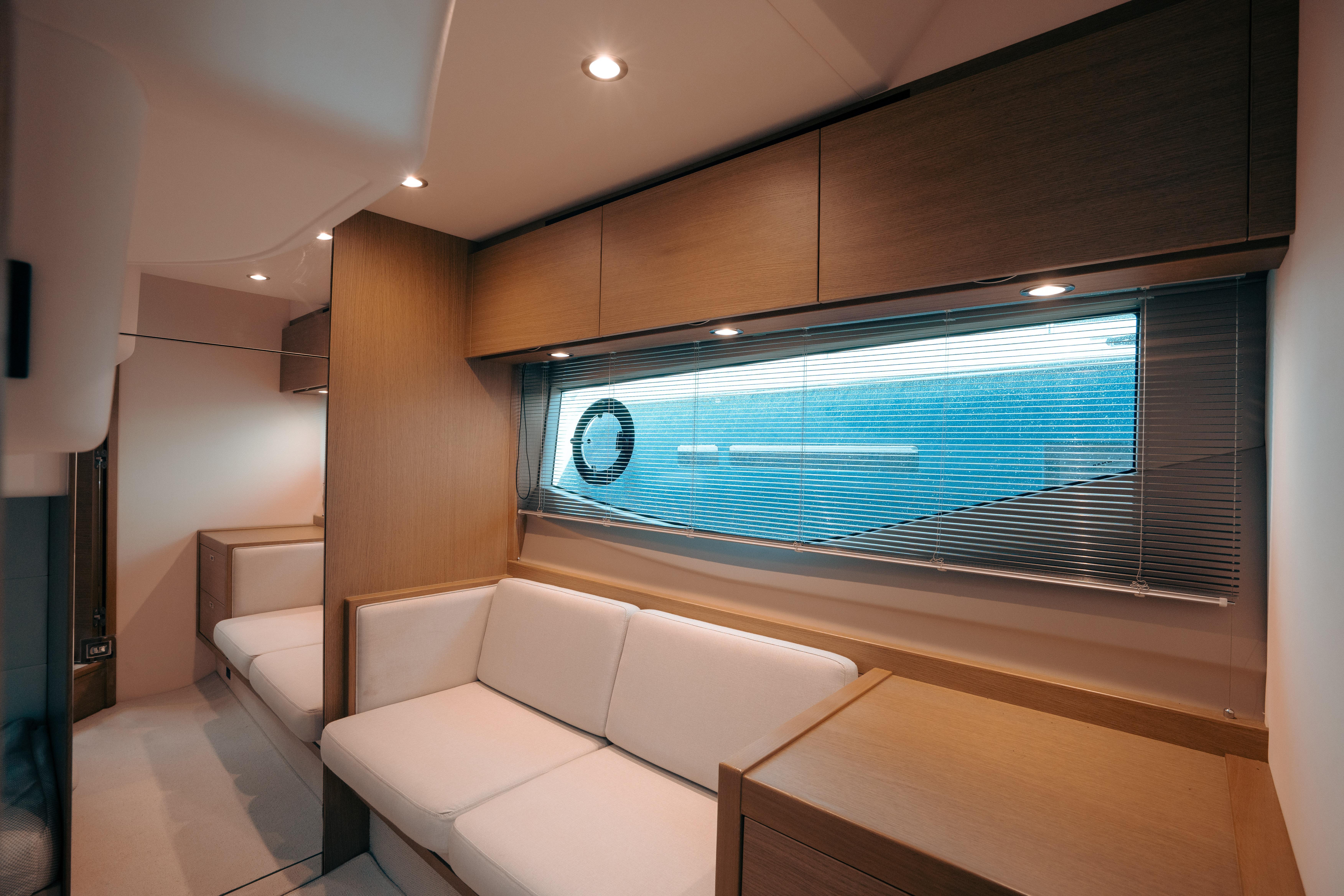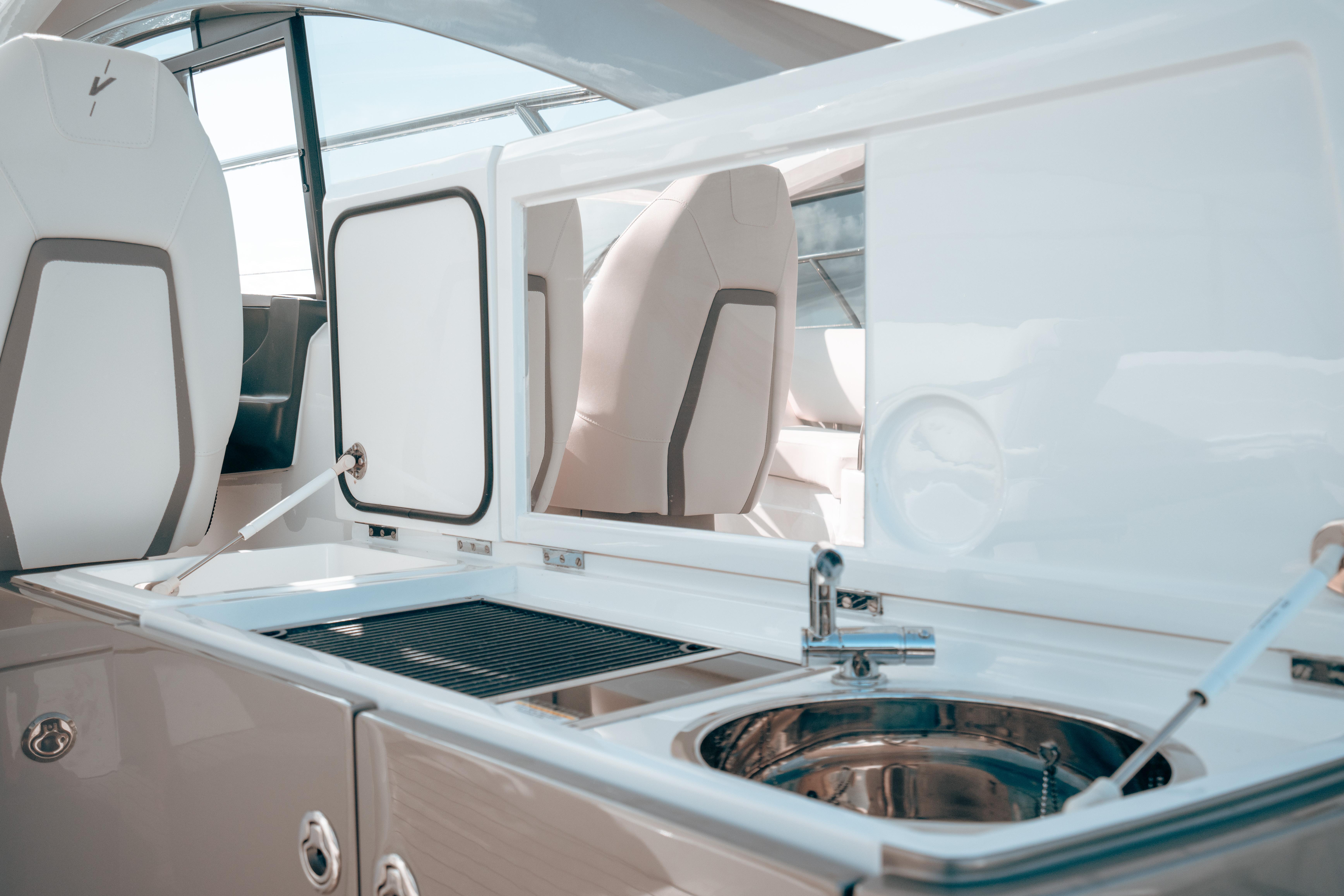The new V40 quintessentially showcases the dynamic exterior, exceptional seakeeping and voluminous space of our V Class. Her port light windows cascade across the length of her deep-V hull, flooding the saloon and cabins with light. When entertaining, her spacious cockpit enjoys a beautiful teak table and well-equipped wetbar in a striking oyster grey with an option to specify a convertible sunbed aft.