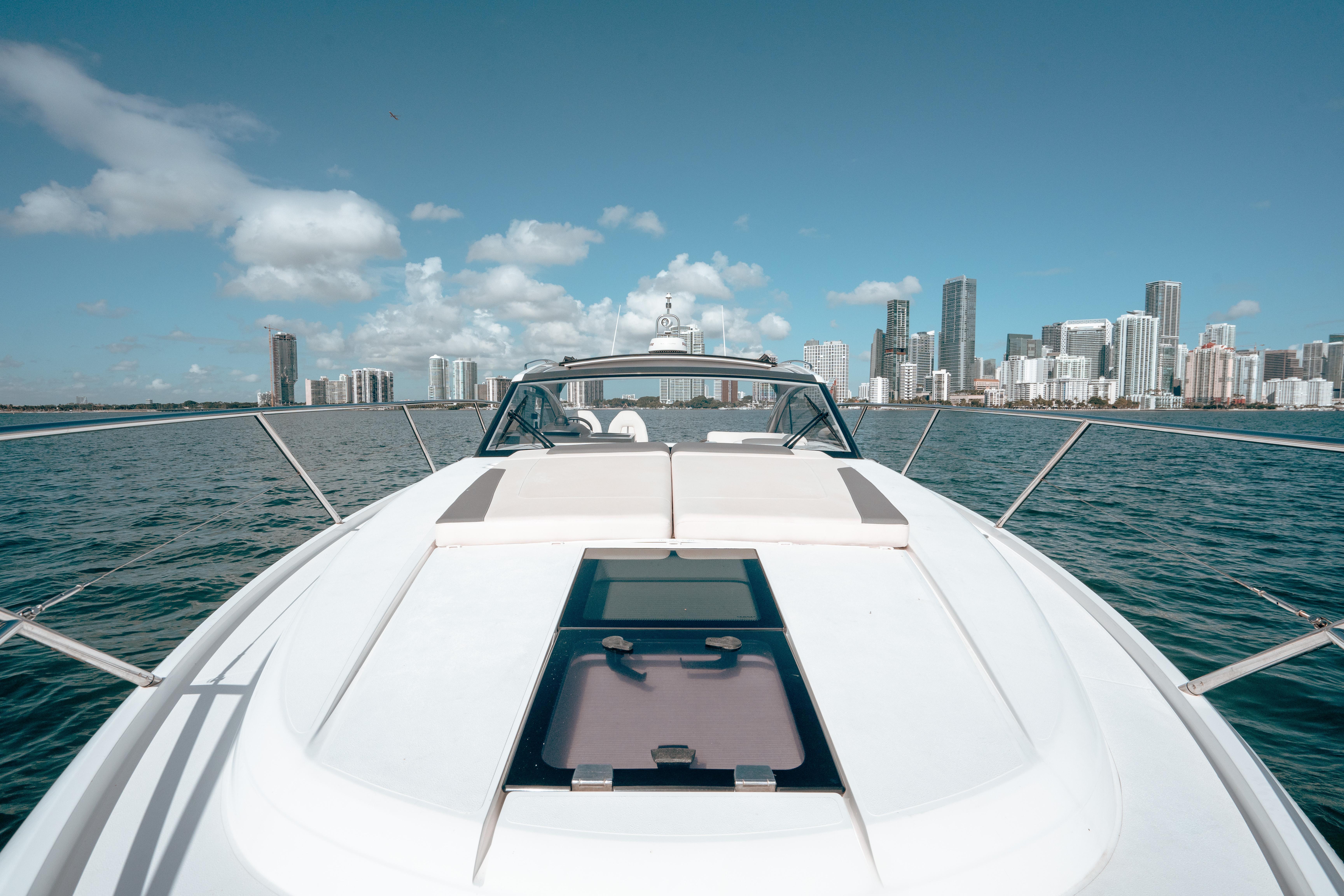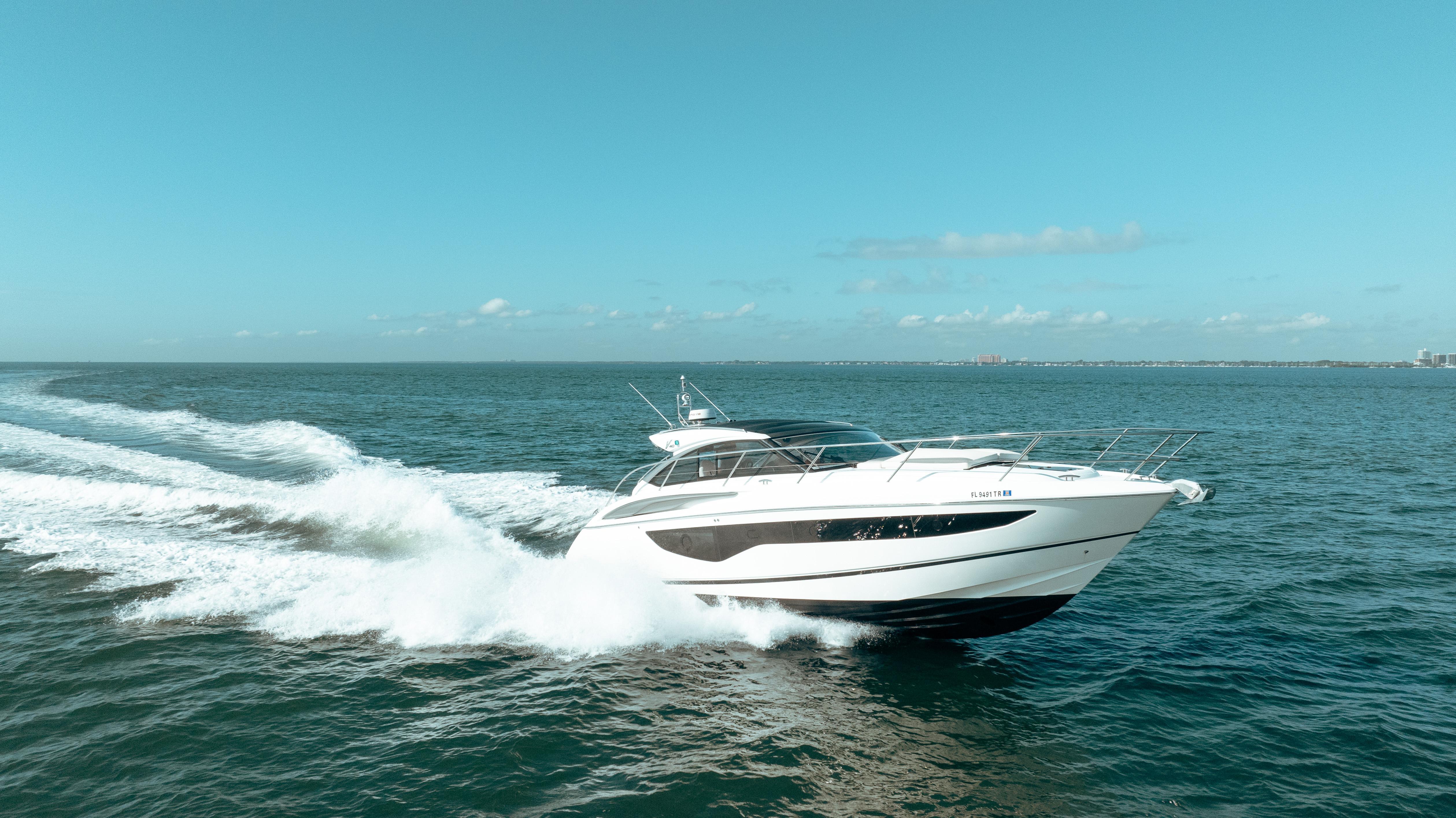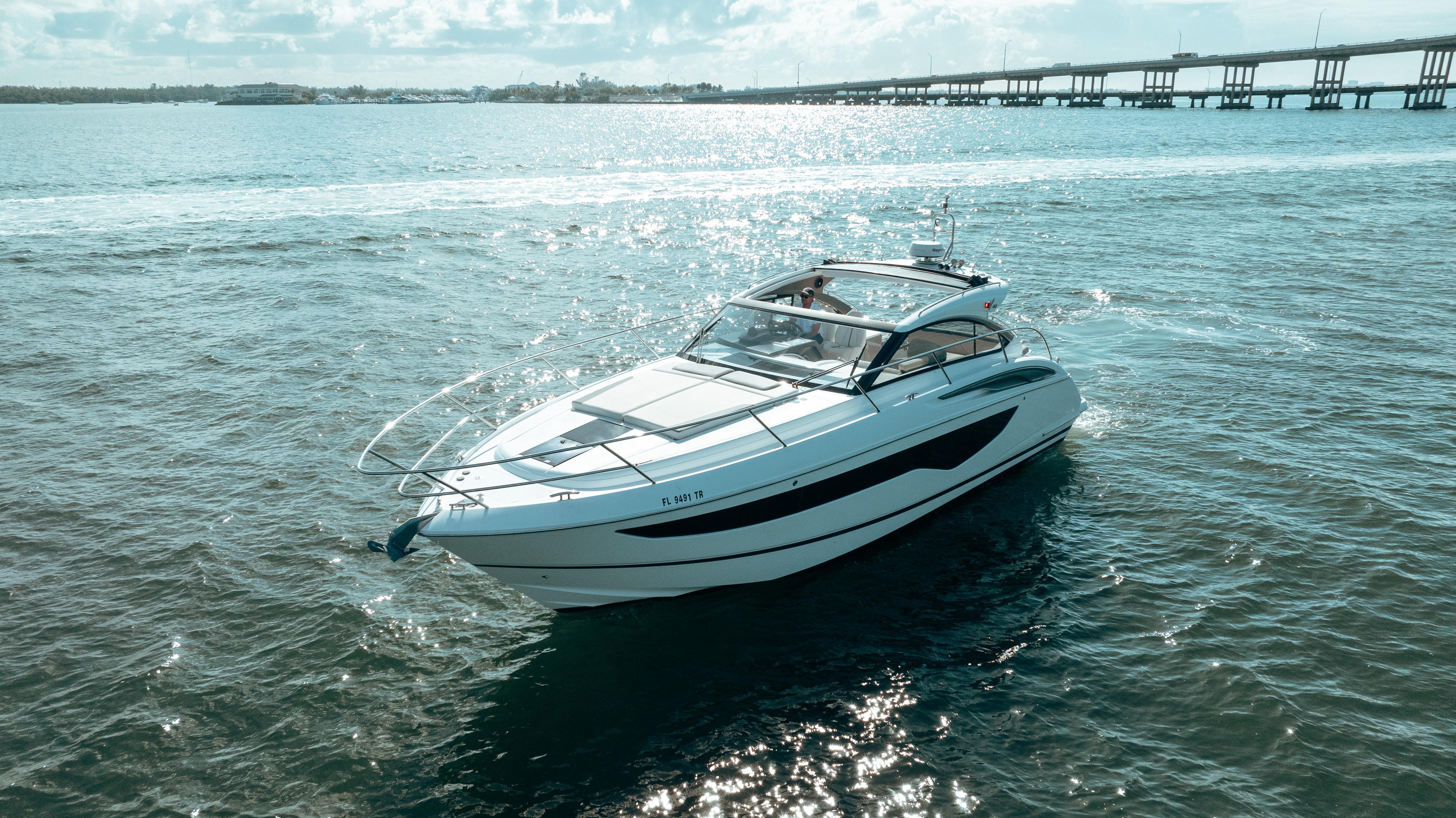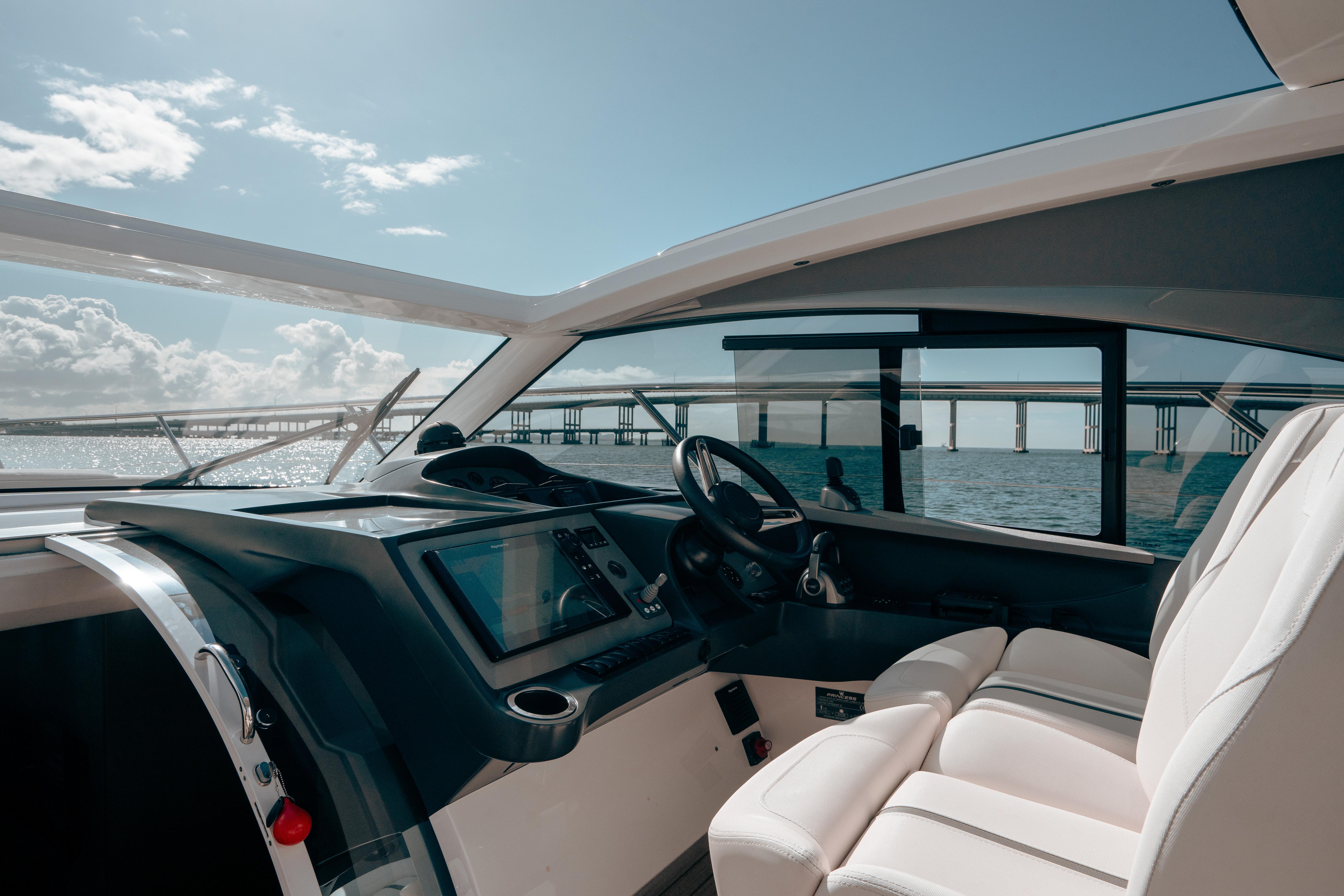 The new V40 quintessentially showcases the dynamic exterior, exceptional seakeeping and voluminous space of our V Class. Her port light windows cascade across the length of her deep-V hull, flooding the saloon and cabins with light. When entertaining, her spacious cockpit enjoys a beautiful teak table and well-equipped wetbar in a striking oyster grey with an option to specify a convertible sunbed aft.
