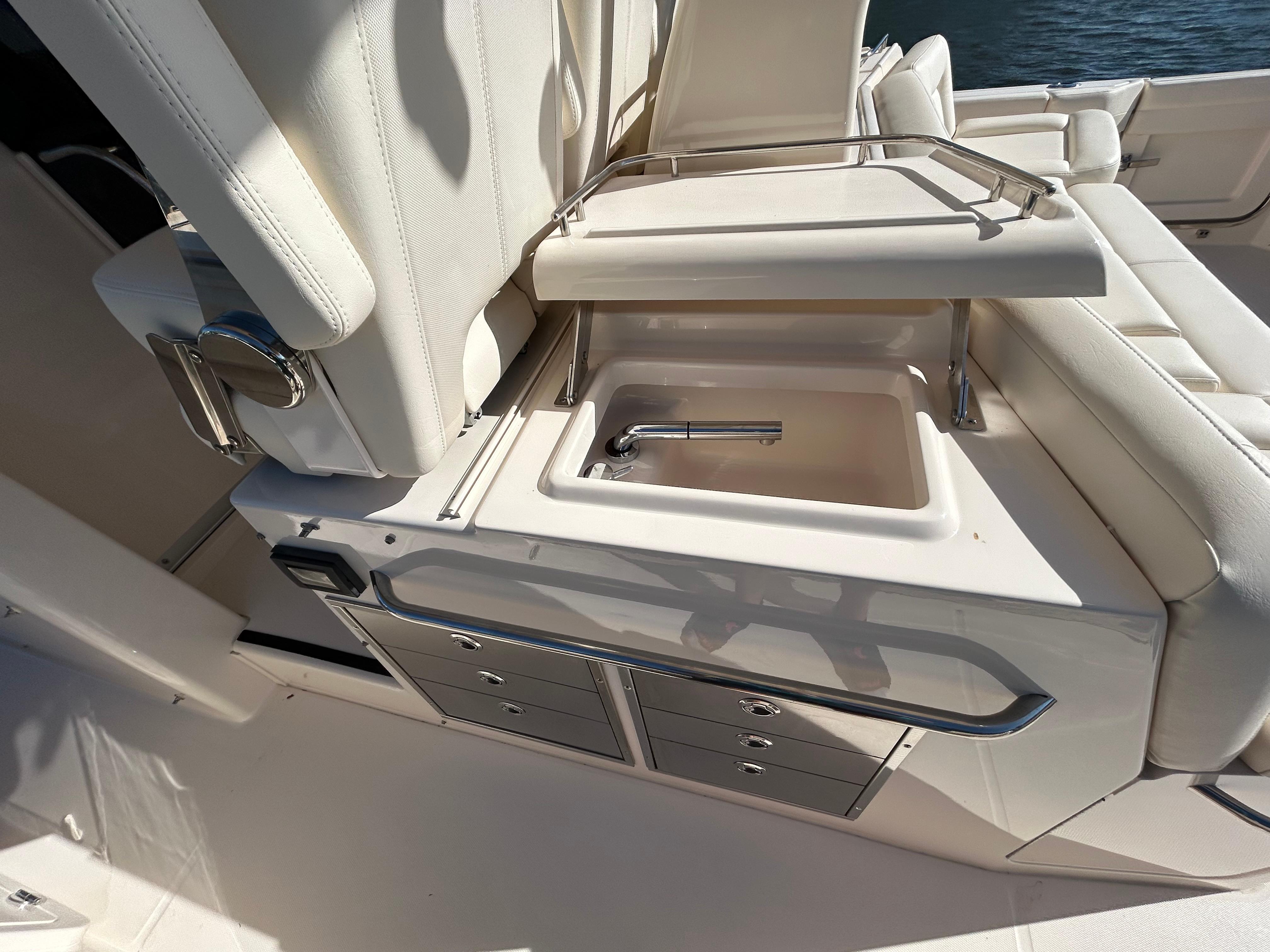 Rigging station - port freshwater sink w/up-down swivel faucet & pull-out spray handle, tackle & bulk storage