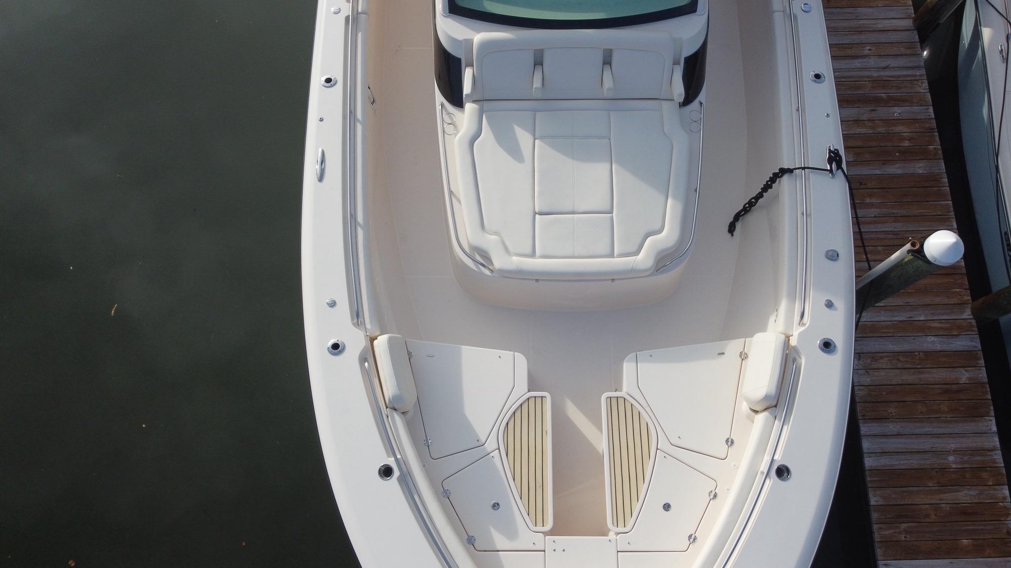 T-top - fiberglass AV²® enclosure w/painted aluminum frame, electrically sliding sunroof w/screen & shade, storage net, LED spreader lights (3), tri-colored (red, blue, white) LED recessed lights (6), aft mounted rod holders (8), outrigger plates, SureShade® electrically retractable shade w/Sunbrella® canvas (oyster)