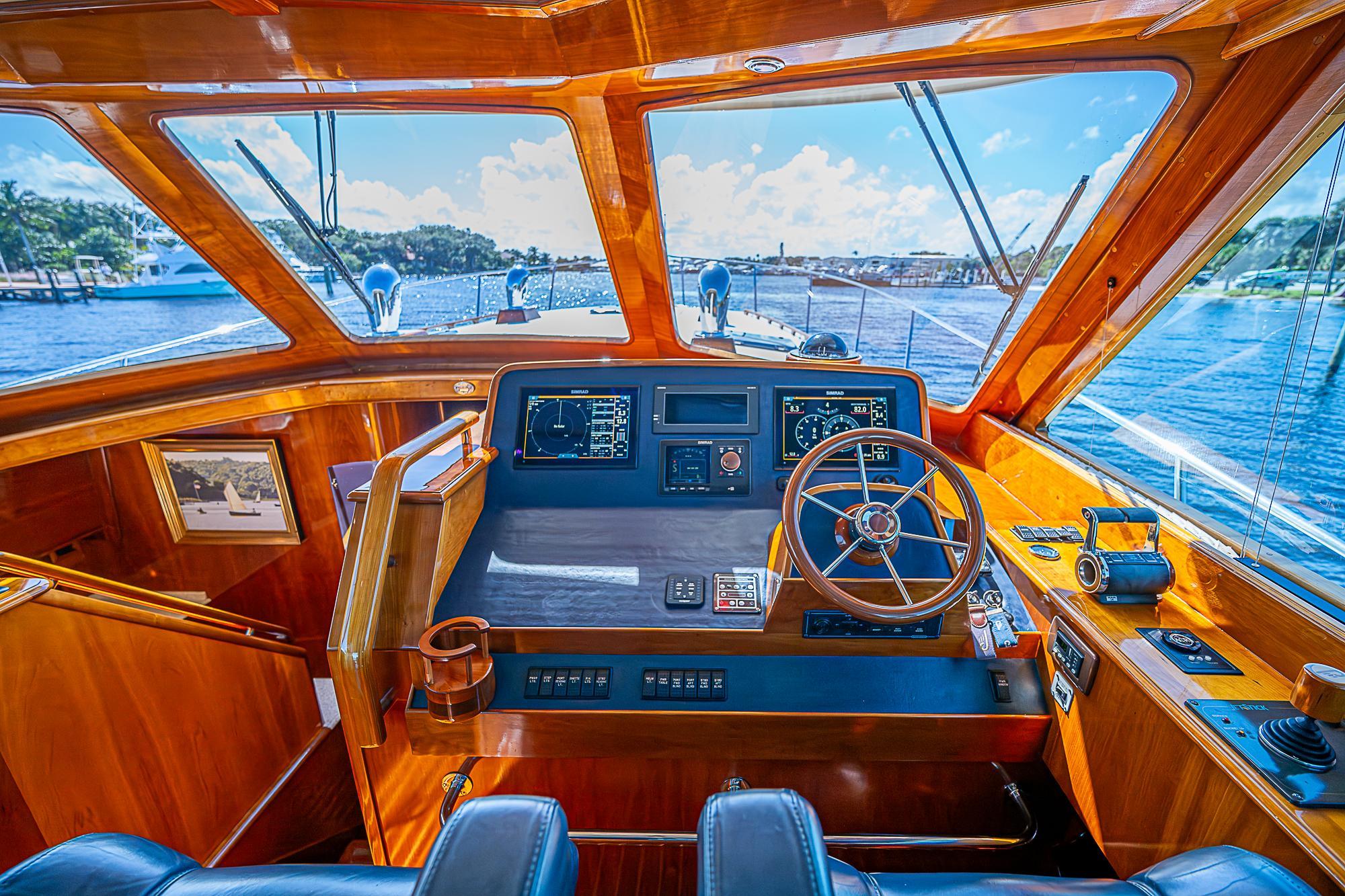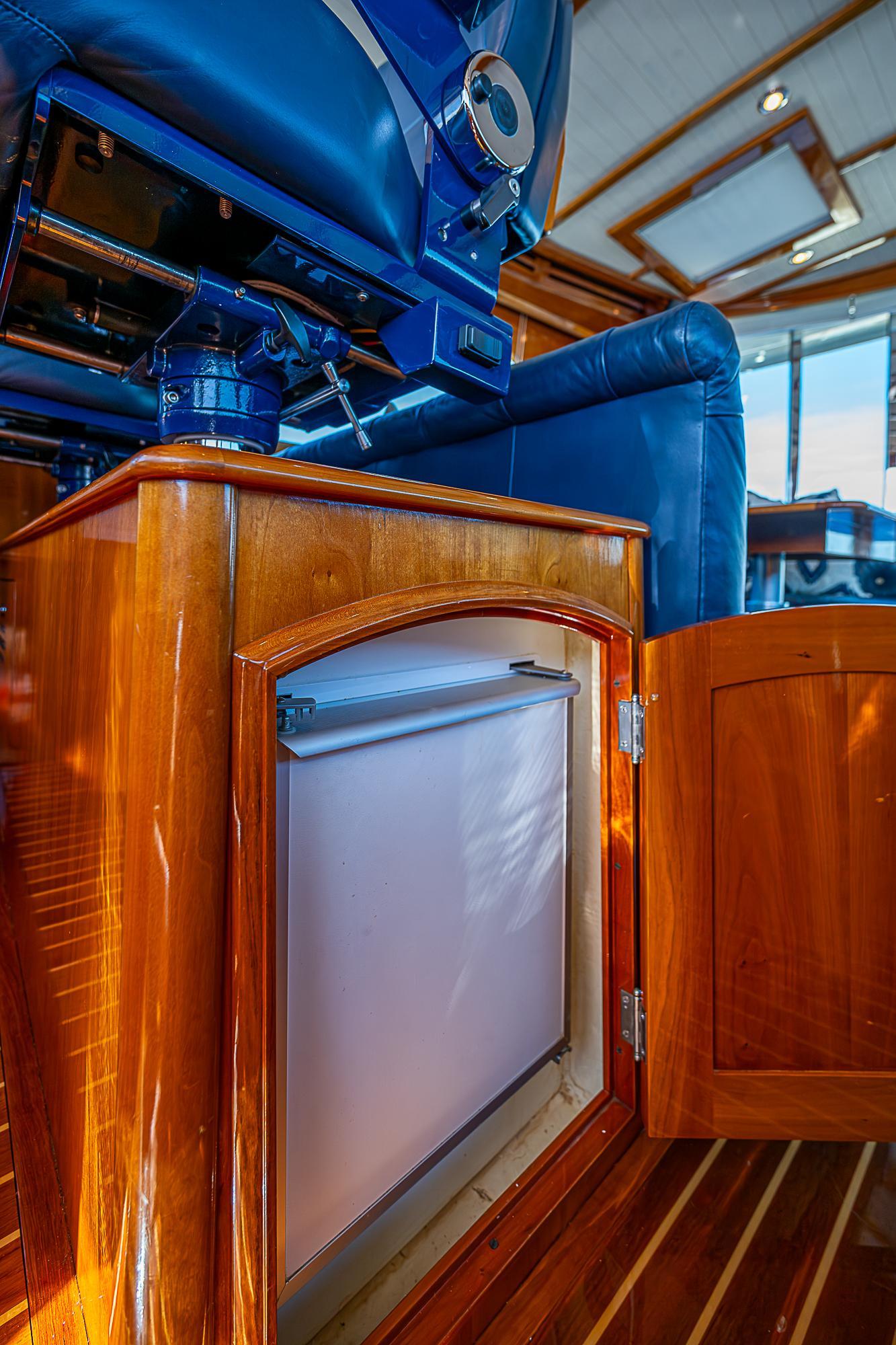 The helm is forward and to starboard, with twin adjustable helm seats. Navigation electronics are installed for ease of use and service. A companionway forward leads below decks to the galley and staterooms. The pilothouse is finished with gloss-varnished cherry including dash and bar area, and the varnished teak and tulipwood pilothouse sole has removable protective covers. Upholstery is tufted Spinneybeck Blue dark leather with custom sliced antler buttons. The twin Moser cherry chairs are upholstered in matching Spinneybeck Blue leather, and there are padded Spinneybeck Blue leather tops on the helm pod, entertainment center and bar top.