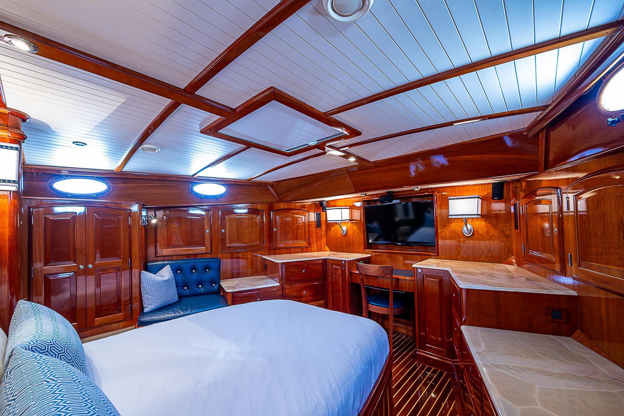 The full width master stateroom all the way forward is quite luxurious. Entered from the companionway through a solid cherry door, this stateroom has a centerline forward-facing queen berth with storage drawers below. A desk is centered on the forward bulkhead, and dressers with Honey Onyx stone countertops are port and starboard of it. A plasma TV is bulkhead mounted over the desk and facing the bed. A custom Thomas Moser desk chair and the padded headboard are covered in tufted Spinneybeck Blue leather. Moving aft there are cedar lined hanging lockers port and starboard and a small settee to port by the bath door.