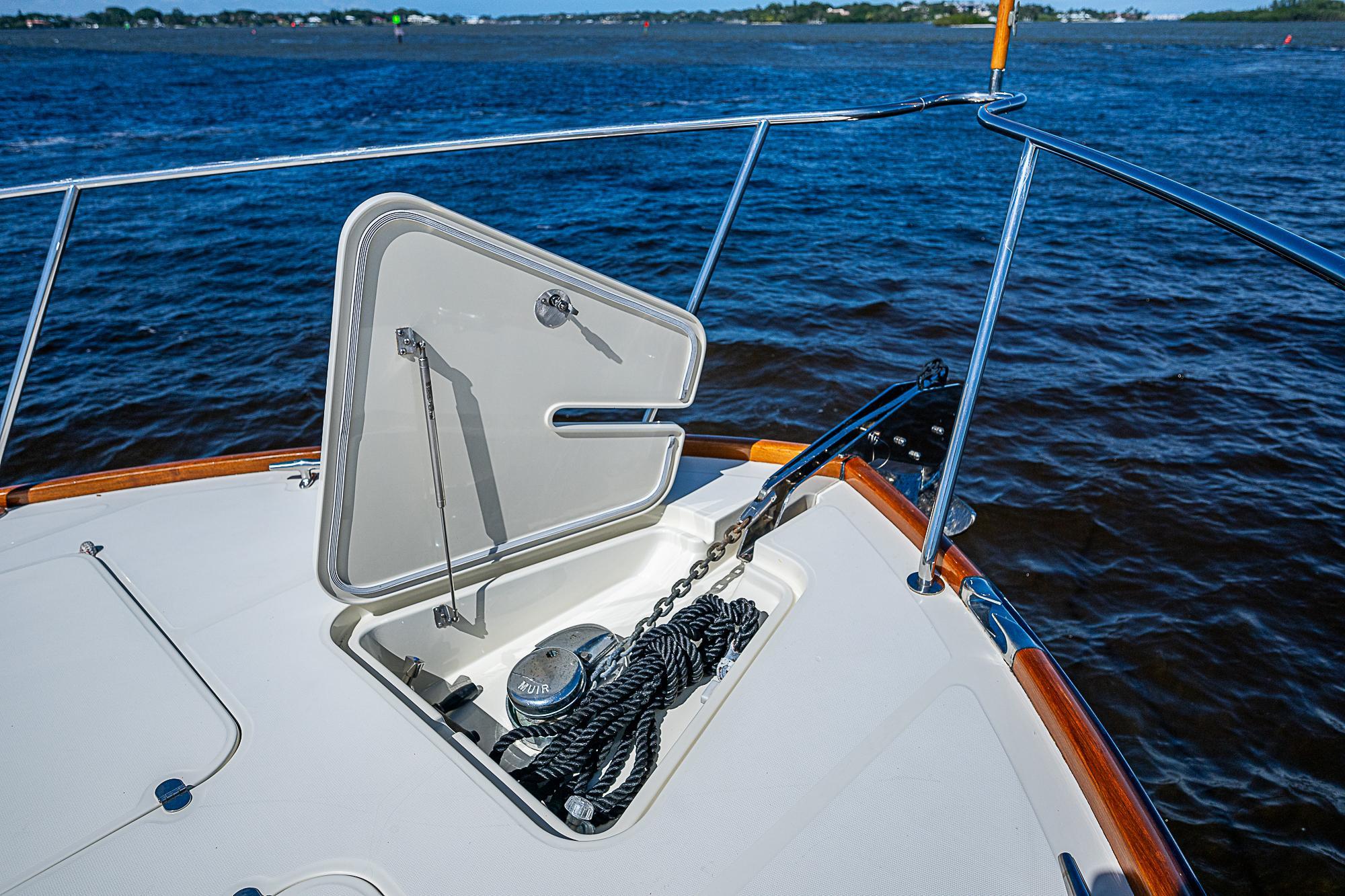 - Anchor locker molded into the foredeck, with hinged and gas-spring assisted hatch.