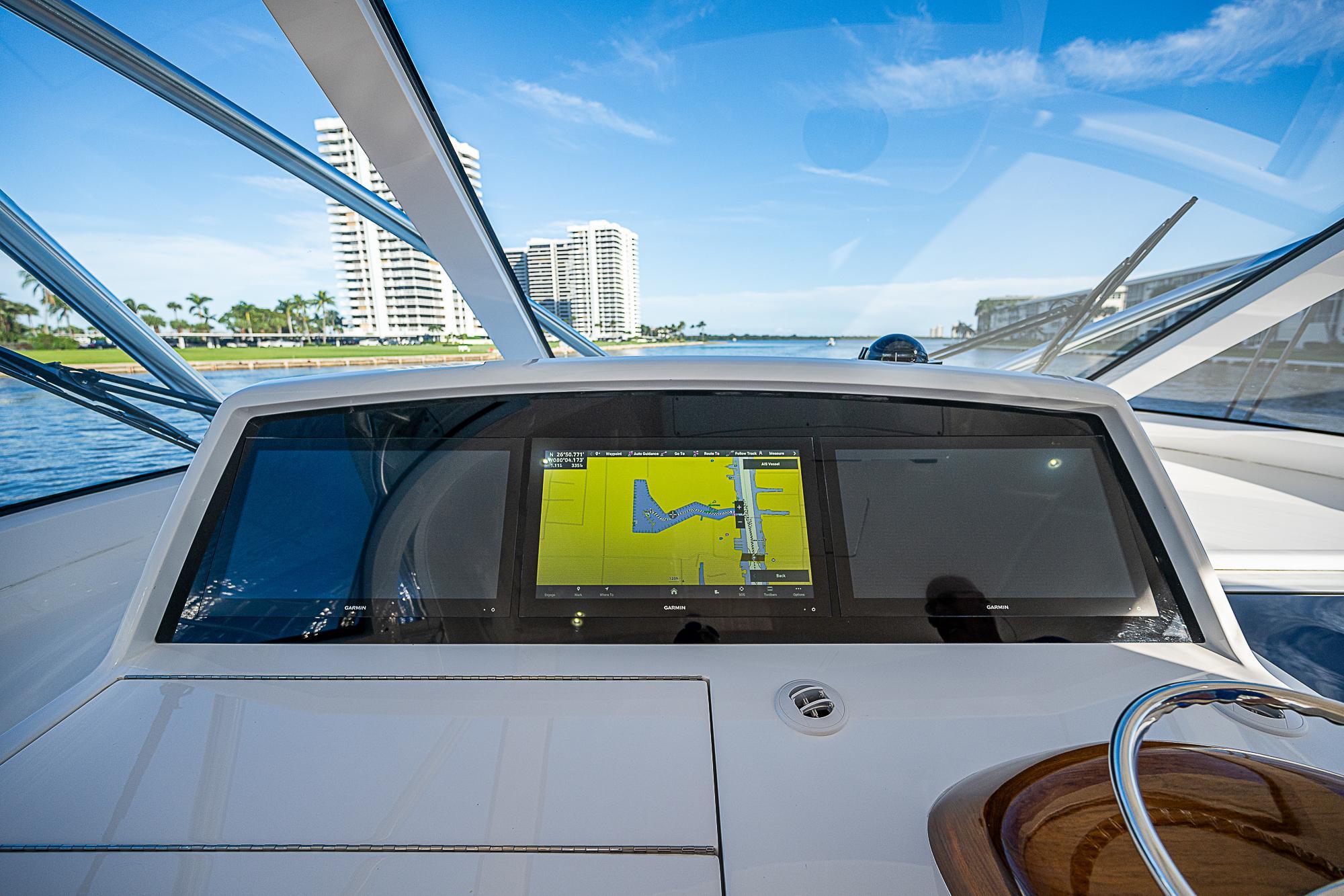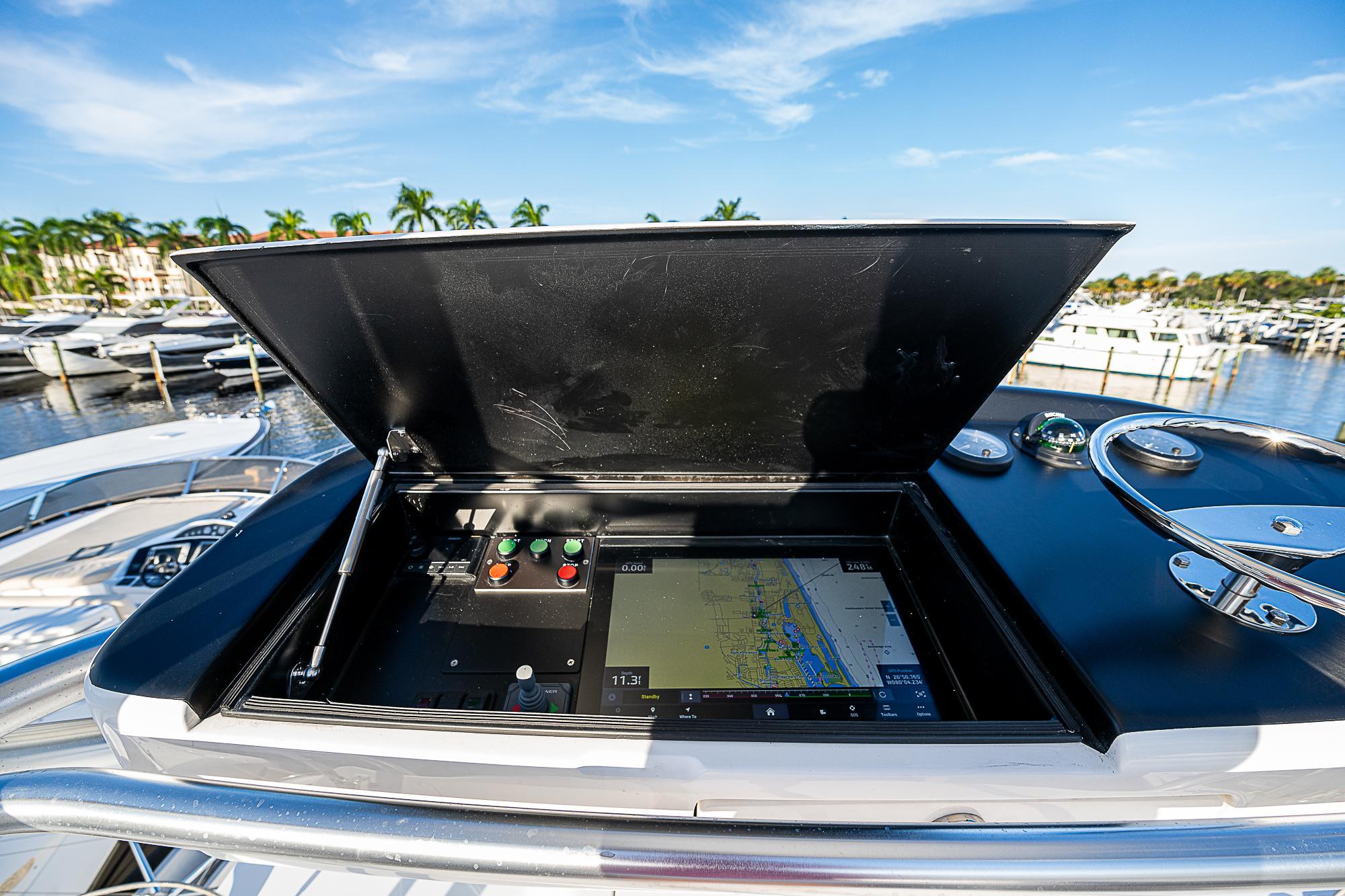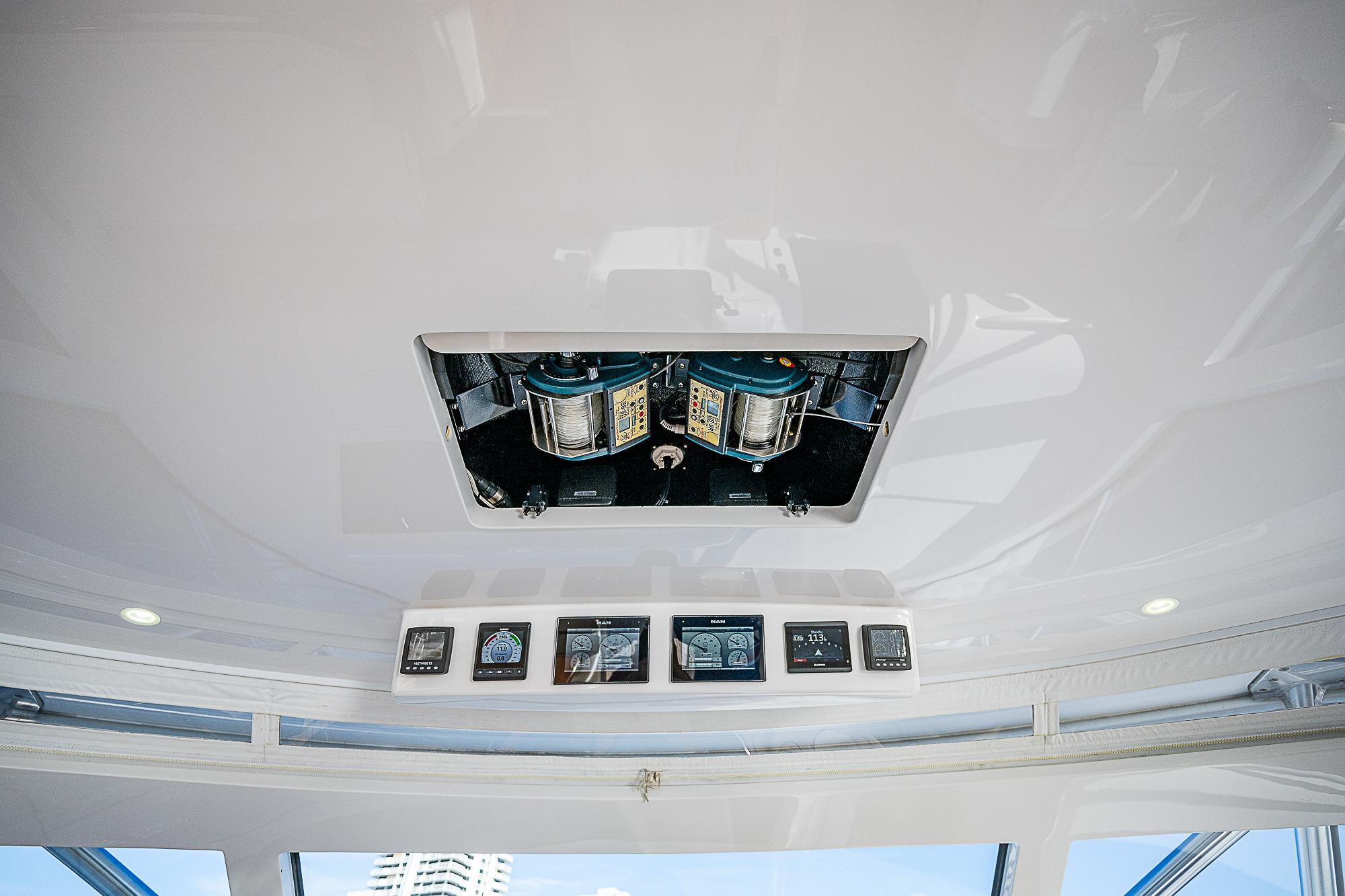 With its open aft bulkhead, the command deck gives you instant access to the cockpit. The centerline helm, with its pedestal seat on a raised platform, provides excellent visibility and is complemented by port (double) and starboard (single) companion seating. Three multi-function displays (up to 22-inches each) are flush mounted in a recessed black acrylic panel, contributing to the clean streamlined helm design. Bocatech switches and other operational controls and instruments are located in a large radio box to port of the raised helm pod. The MAN engine displays, autopilot and VHF radios are nested in a recessed area molded into the hardtop underside.