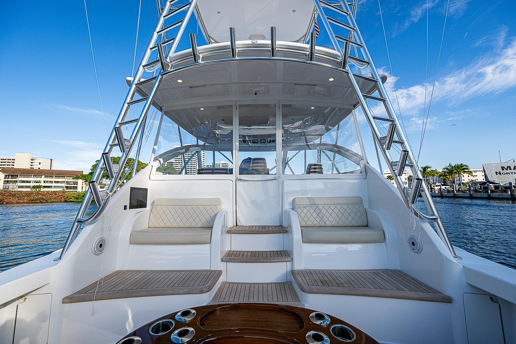 The Open, Sport Coupe and Sport Tower share cockpit and command deck layouts, providing an excellent use of space for fishing, diving, cruising and entertaining. The 154-square-foot cockpit boasts twin mezzanine seating with cooler storage below (easily converted into optional freezer space), along with drink coolers, in-deck fish and storage boxes, a transom live well and a transom door with lift gate. A single centerline lazarette hatch (available with power actuation) opens nearly 90 degrees for full viewability and access to the available Seakeeper 9, 16 or 18 as well as the steering, trim tabs and drain pumps.