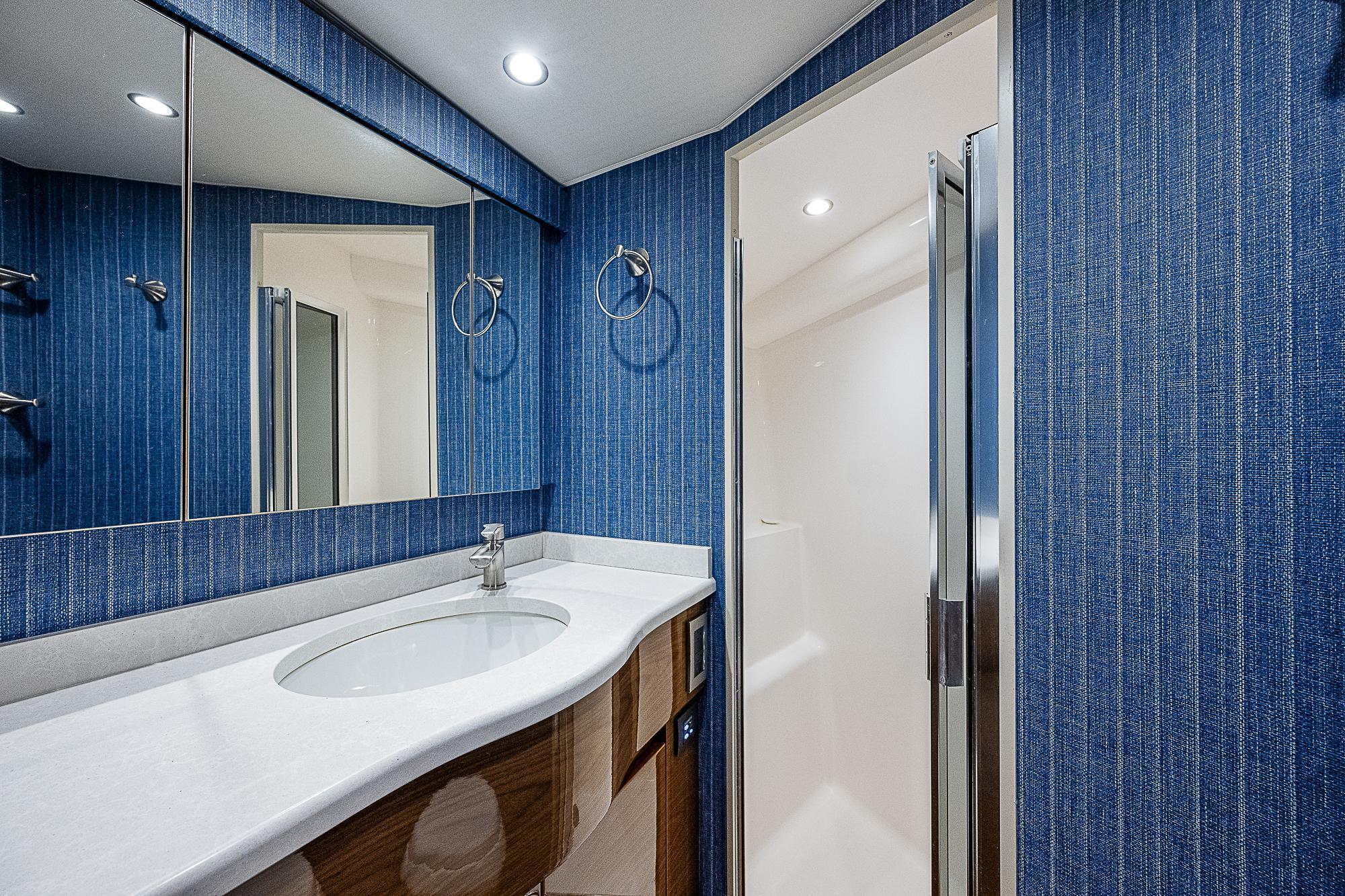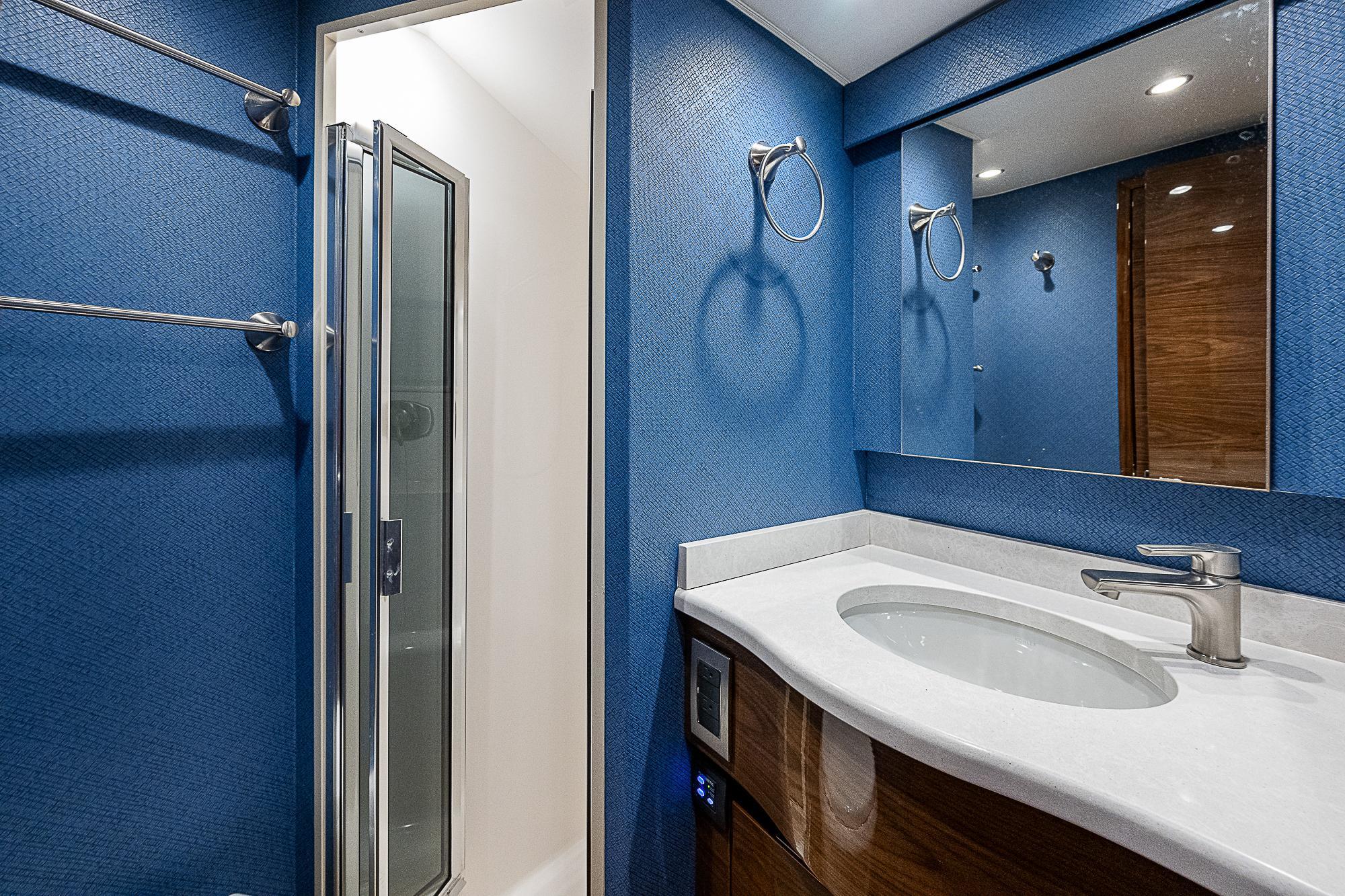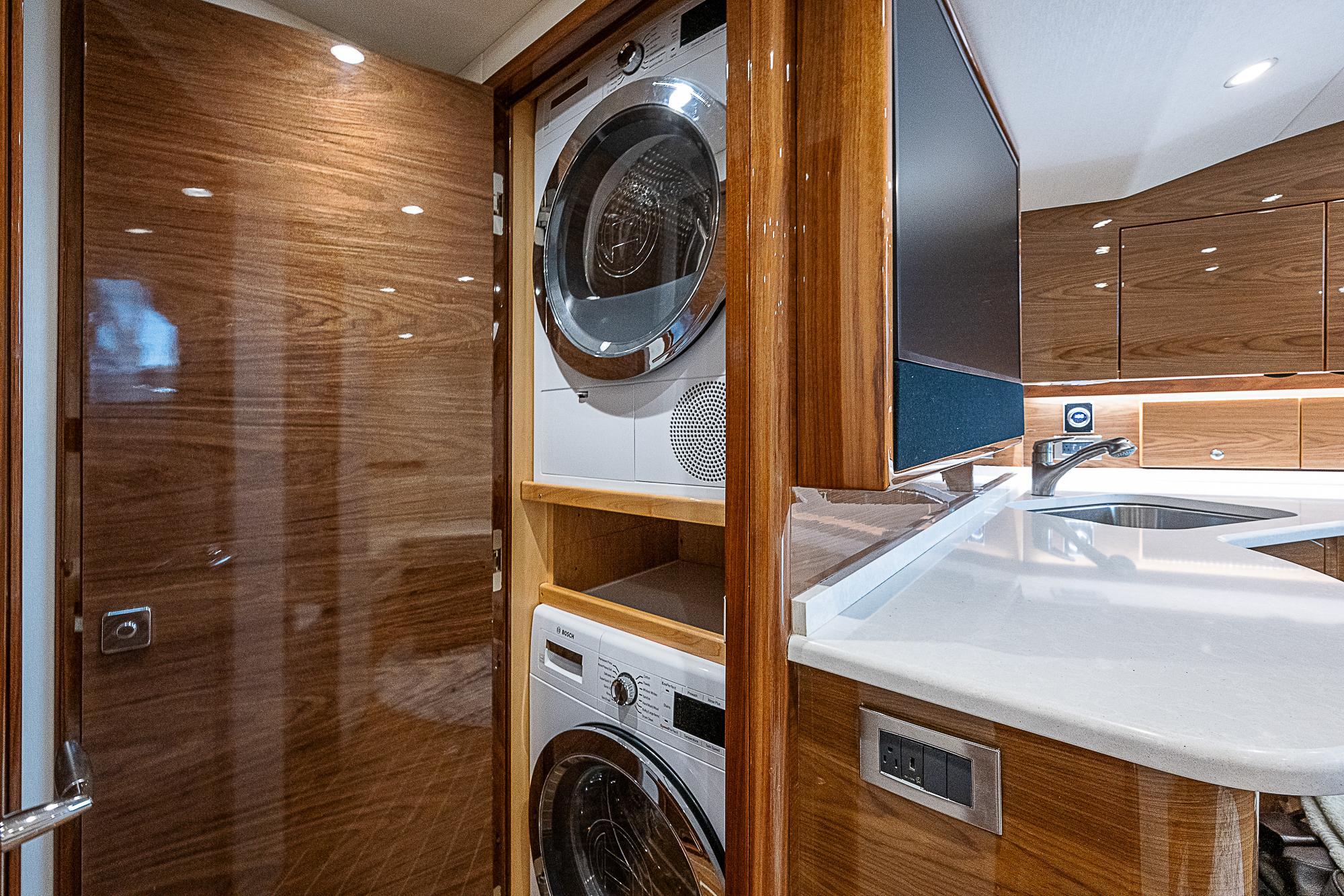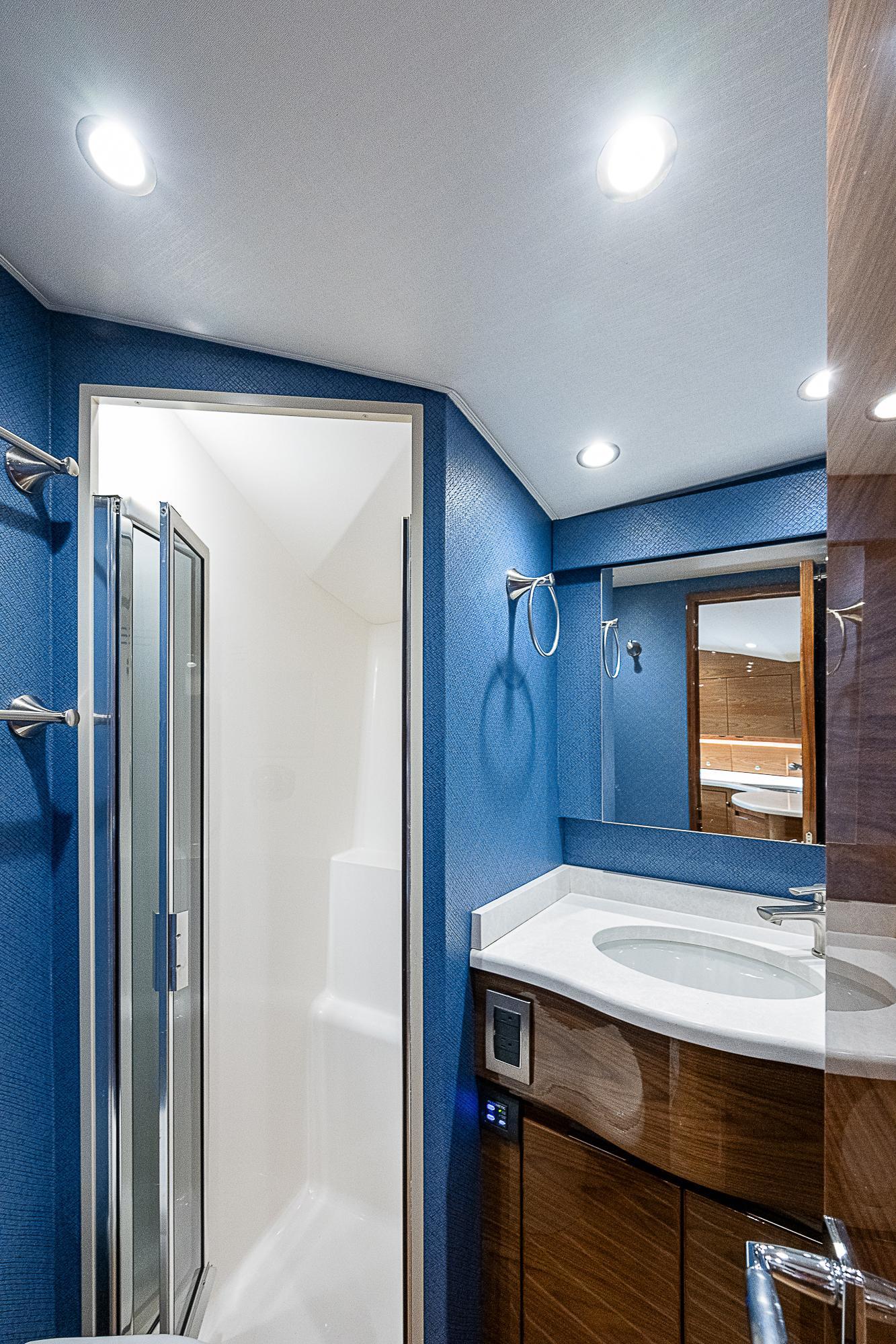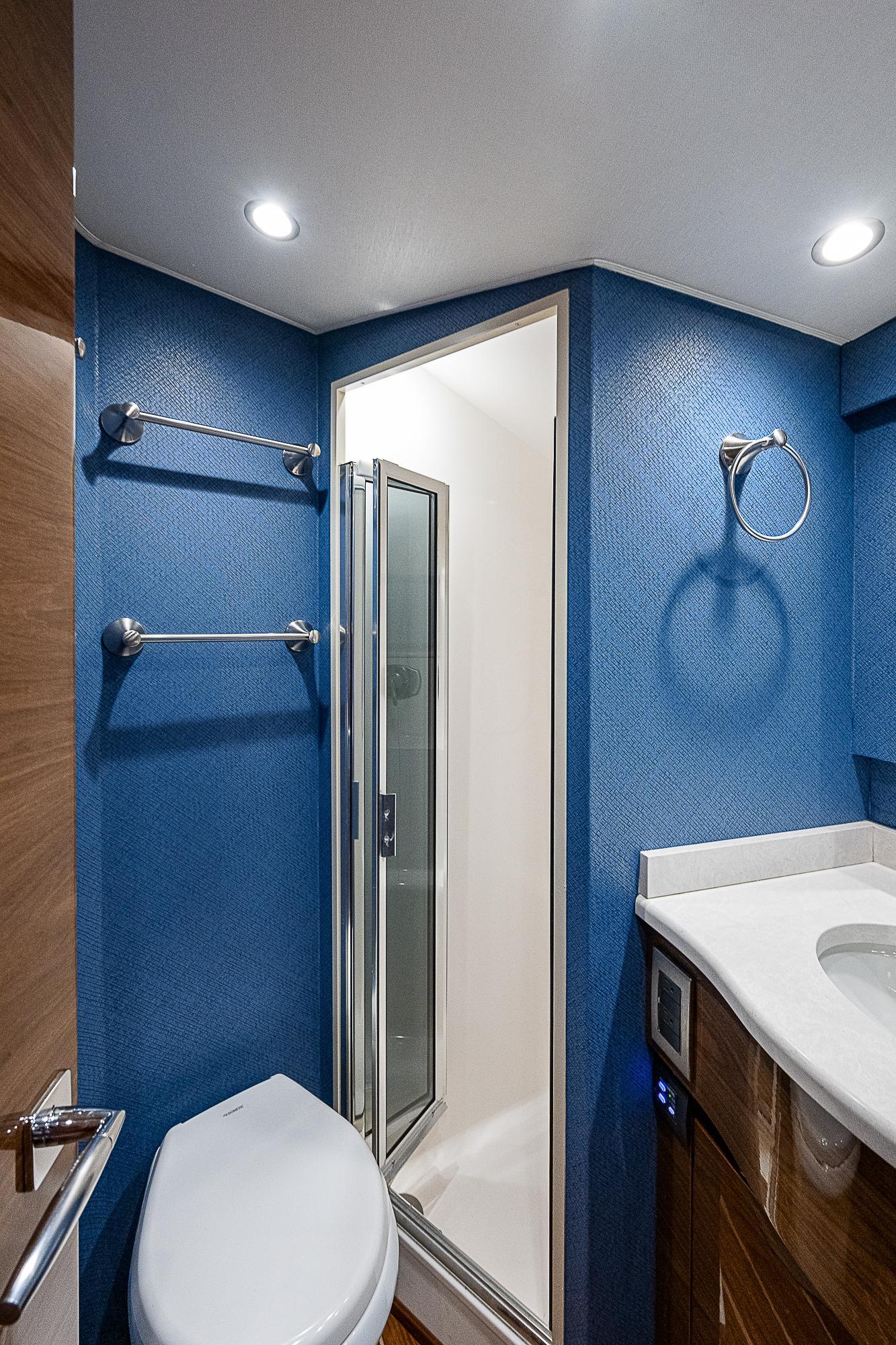 The engineroom, easily reached through lift-up steps built into the mezzanine, houses the twin powerplants. A pair of MAN V12 1400CRM (1400 MHP) engines serve as the standard propulsion package. Hull No. 1 – a Sport Tower model – will be powered with the optional MAN V12 1550CRM (1550 MHP) engines.