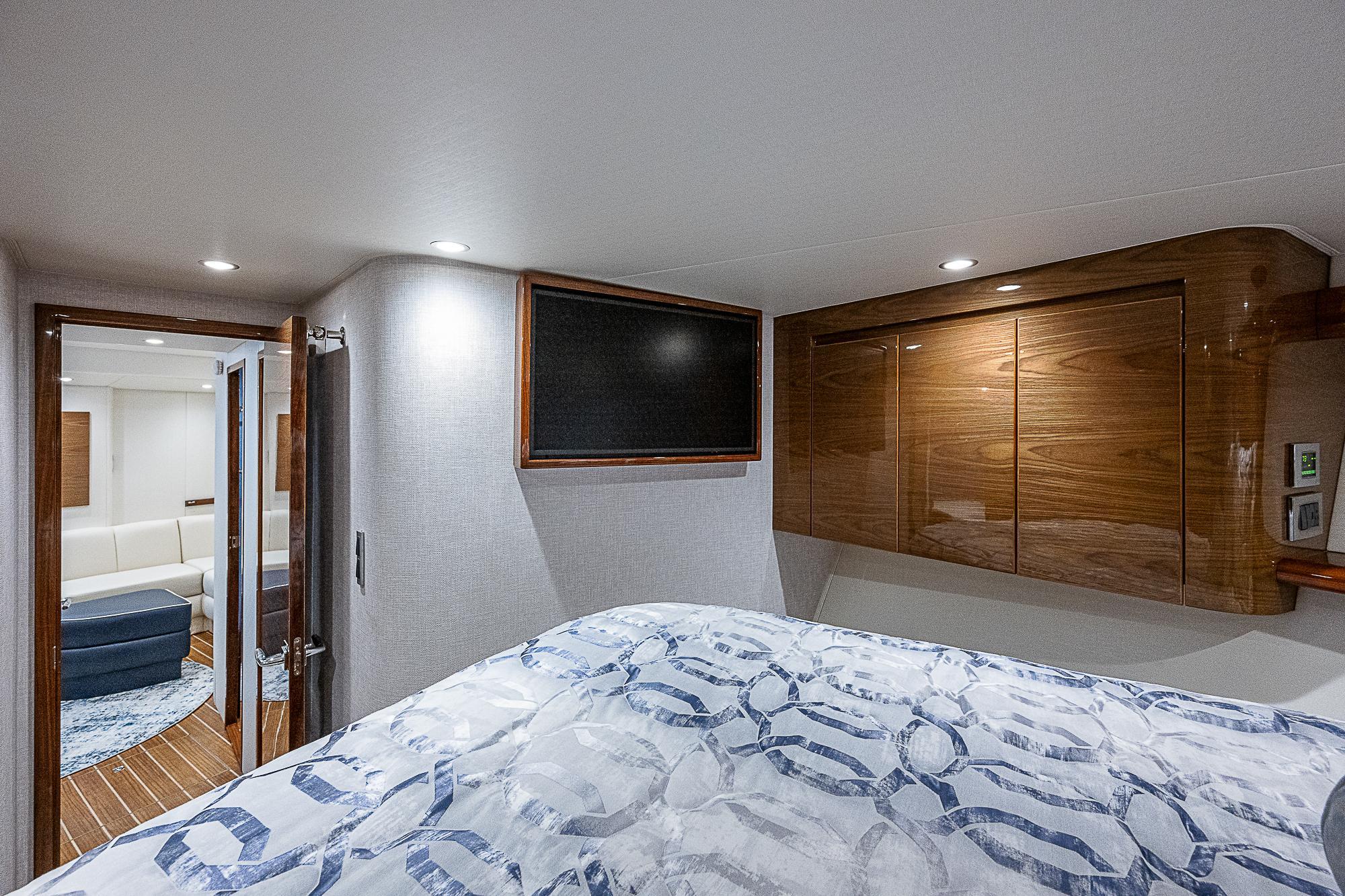 Below, the 17 ft. 8 in. beam offers volumes of interior space including a choice of two- or three-stateroom layouts. With either, the forward master stateroom is large and fitted with a queen-size bed, plenty of storage behind the horizontal grain walnut cabinetry and served with a private head. Additional staterooms are found on the port side, each with upper and lower berths. The head has private access in the two-stateroom layout, while guests share the head in the three-stateroom plan. Midship on the starboard side is a well-appointed galley with a full appliance package, walnut cabinetry, an engineered stone countertop and under-counter refrigeration/freezer units (with varnished horizontal grain walnut faces). Opposite the galley in the two-stateroom model is an L-shaped lounge and table. The three-stateroom version utilizes booth seating. Other notable amenities include a 43” HD TV, Amtico flooring in the salon/galley/dinette and premium carpeting in the staterooms.
