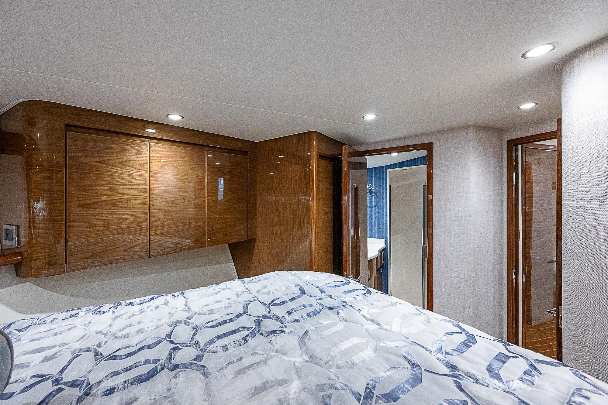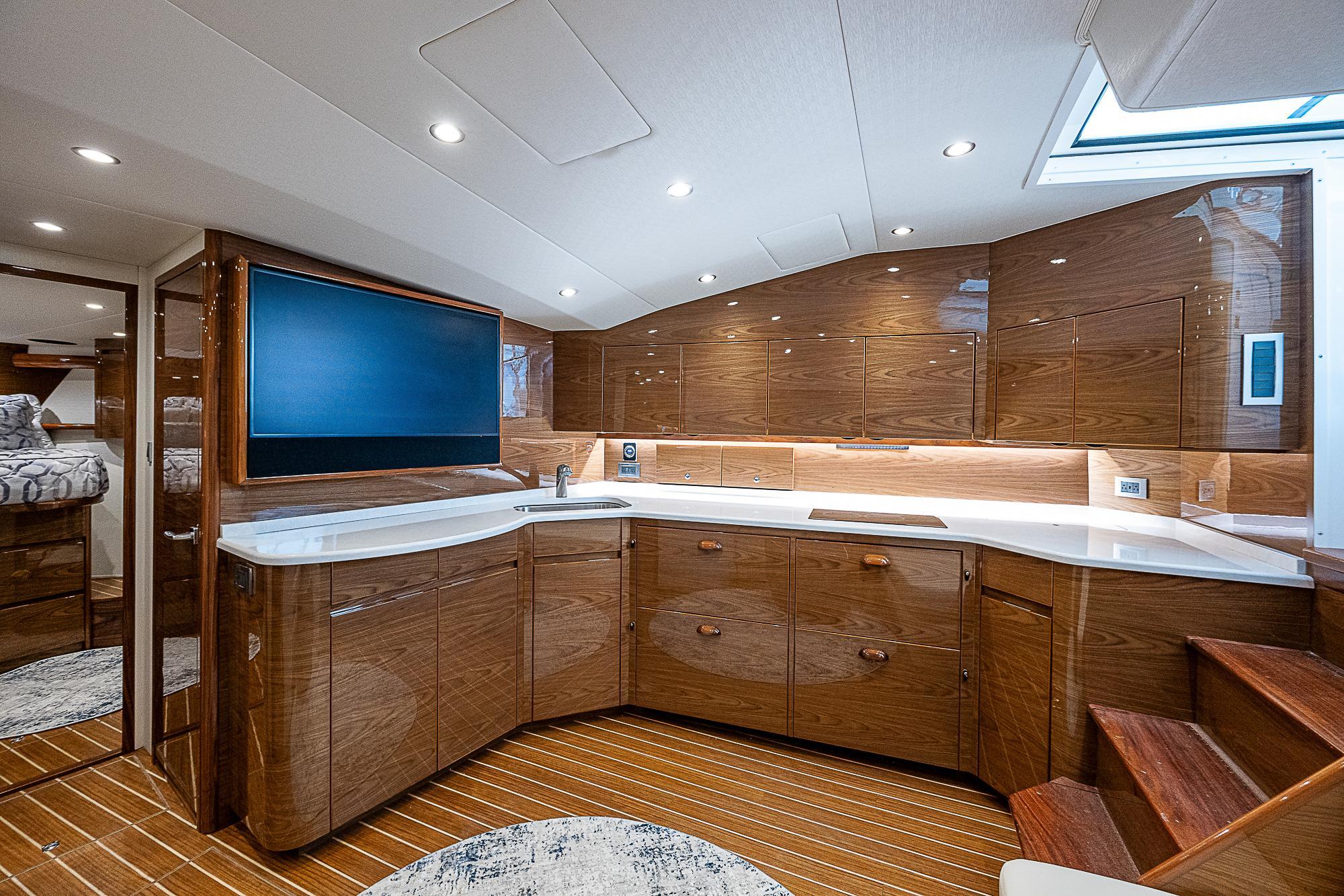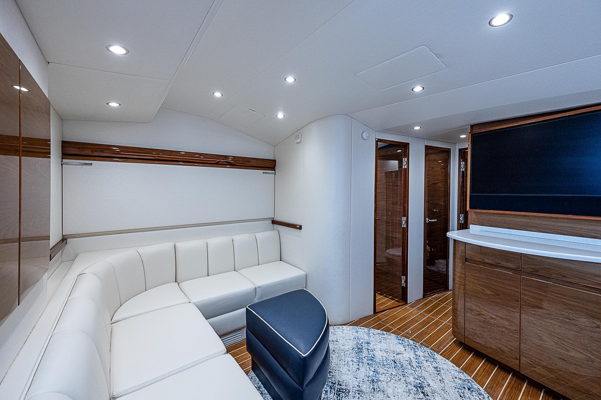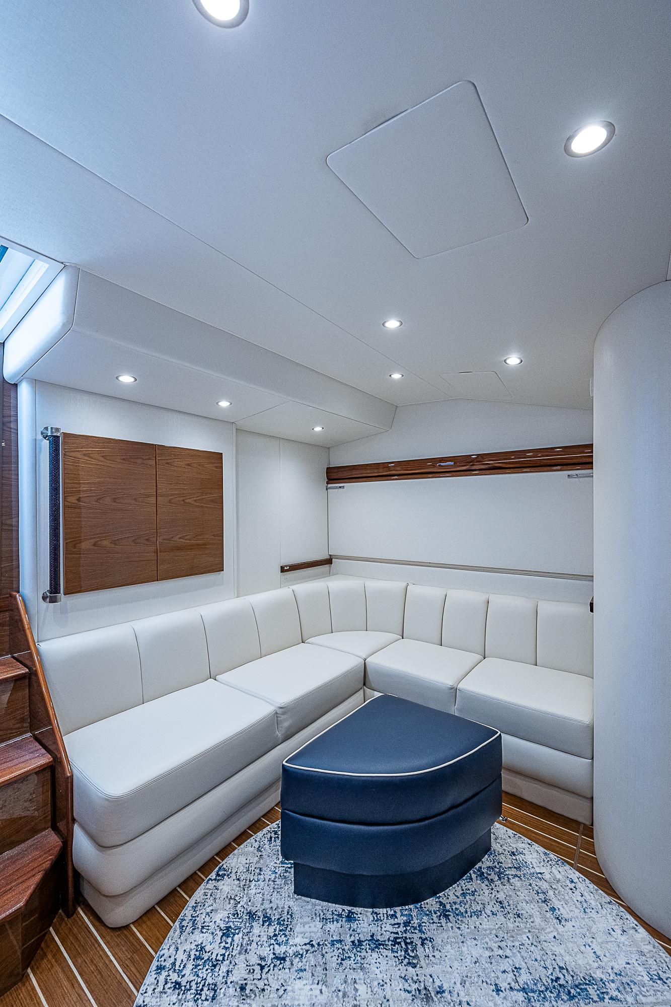 Aft of the helm, there is a convergence of practical and convenience features, including refrigeration and tackle and gear storage compartments. Plump cushions topping the port-side U-shape lounge, which surrounds a walnut table, will cradle your guests in comfort while providing ample height to take in the surroundings. To port, you’ll also find an L-shaped lounge with storage underneath.