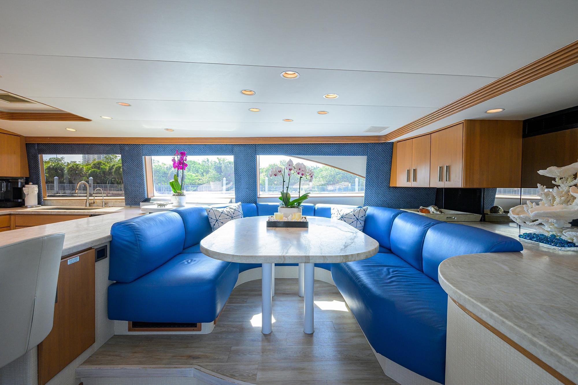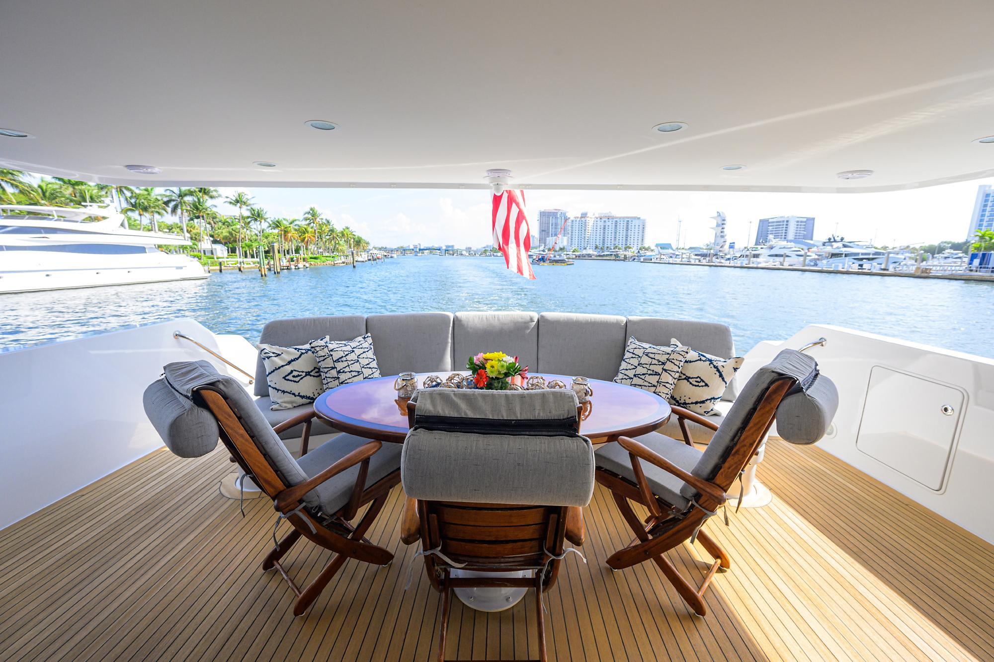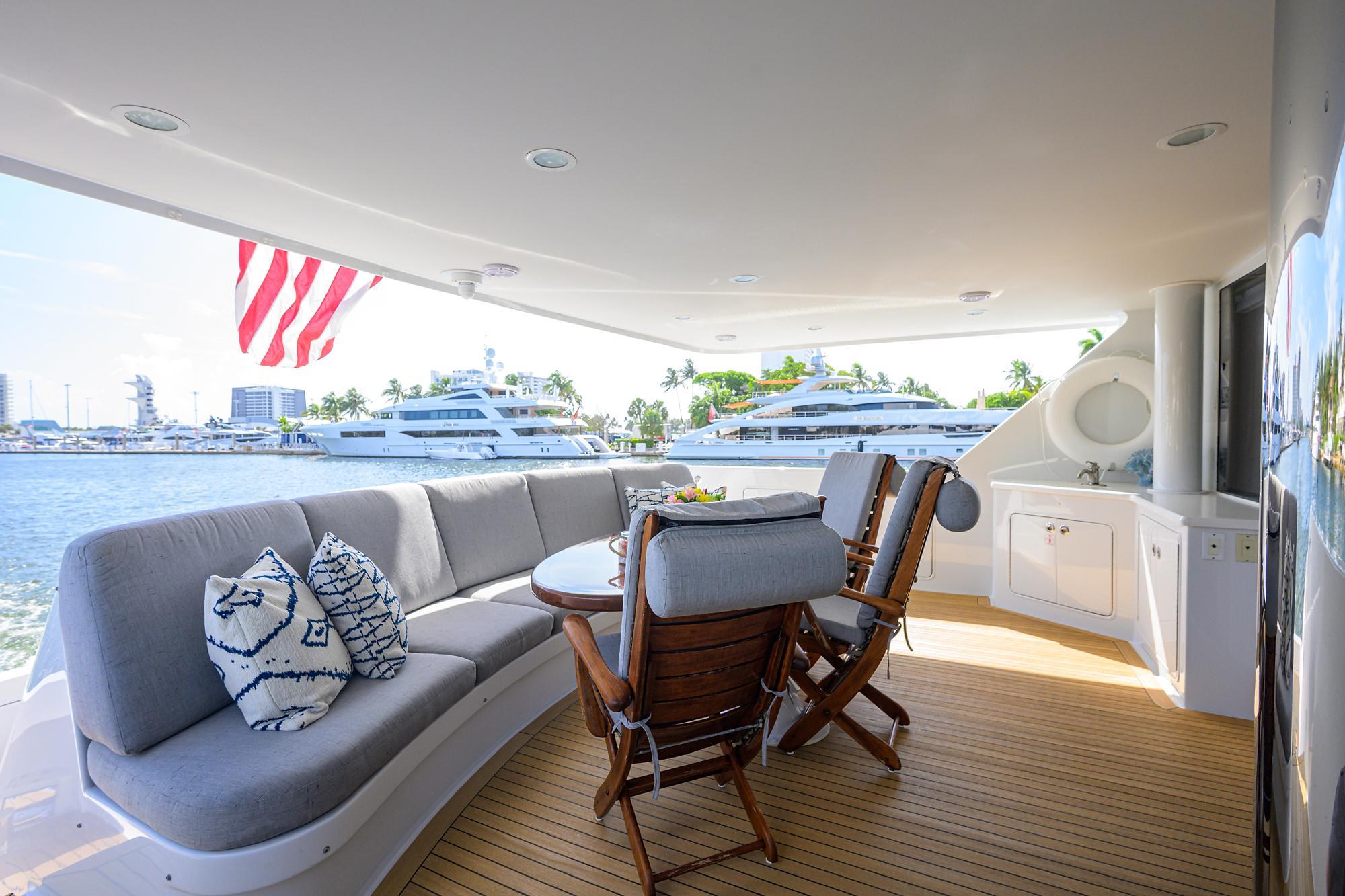 HARD TIMES is a factory original cockpit motor yacht, built for ease of access to the water through an aft transom door. From the cockpit there are port and starboard molded stairs leading up to the aft deck. The covered aft deck is furnished with aft curved built-in seating, a teak dining table and occasional teak deck chairs. To the starboard corner is a stainless-steel staircase leading up to the boat deck with a hatch closing door.