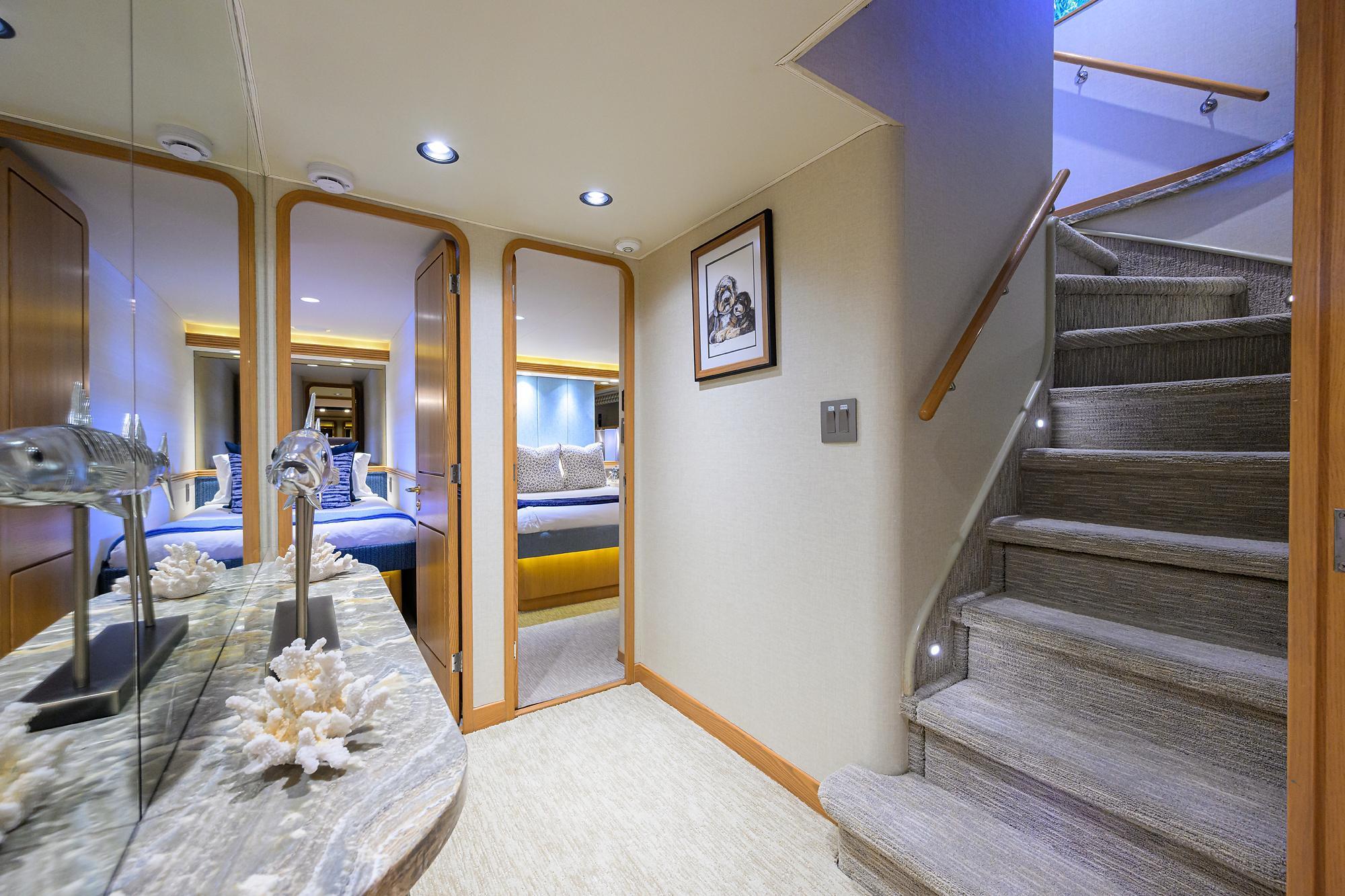 From the salon on the port side is another side deck entry door and stairs leading down to a foyer leading to the owner’s stateroom and 2 guest cabins.