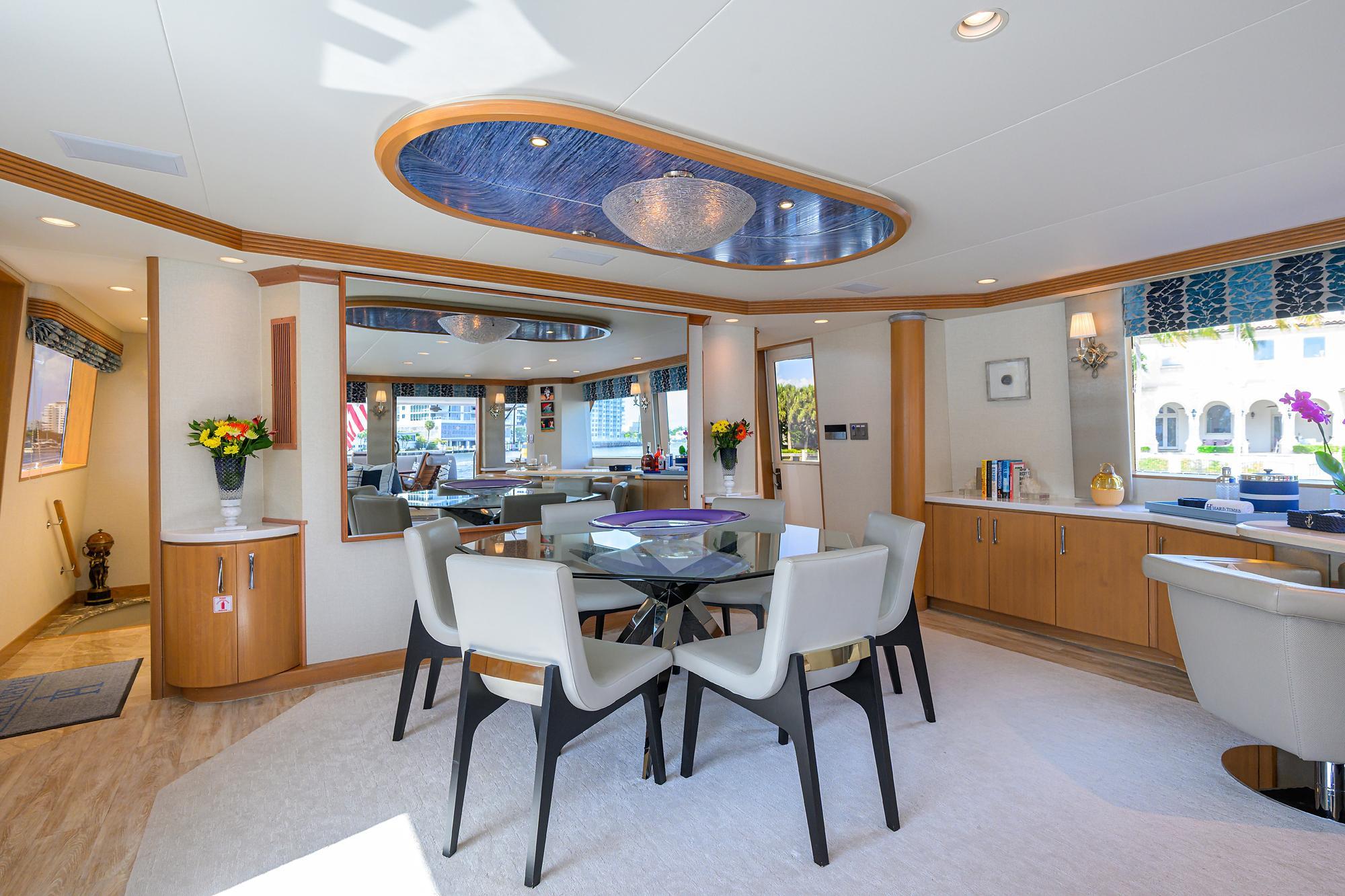 Entering the salon through glass sliding door is a full beam spacious salon. To starboard is a step-down bar which allows for unobstructed views through her windows while seated anywhere in the salon. To port is an L-shaped sectional sofa. The forward salon bulkhead houses an 82” Translucent mirror TV by Clearview (new in 2021) coupled with the electric blackout blinds creating an amazing theatre experience.