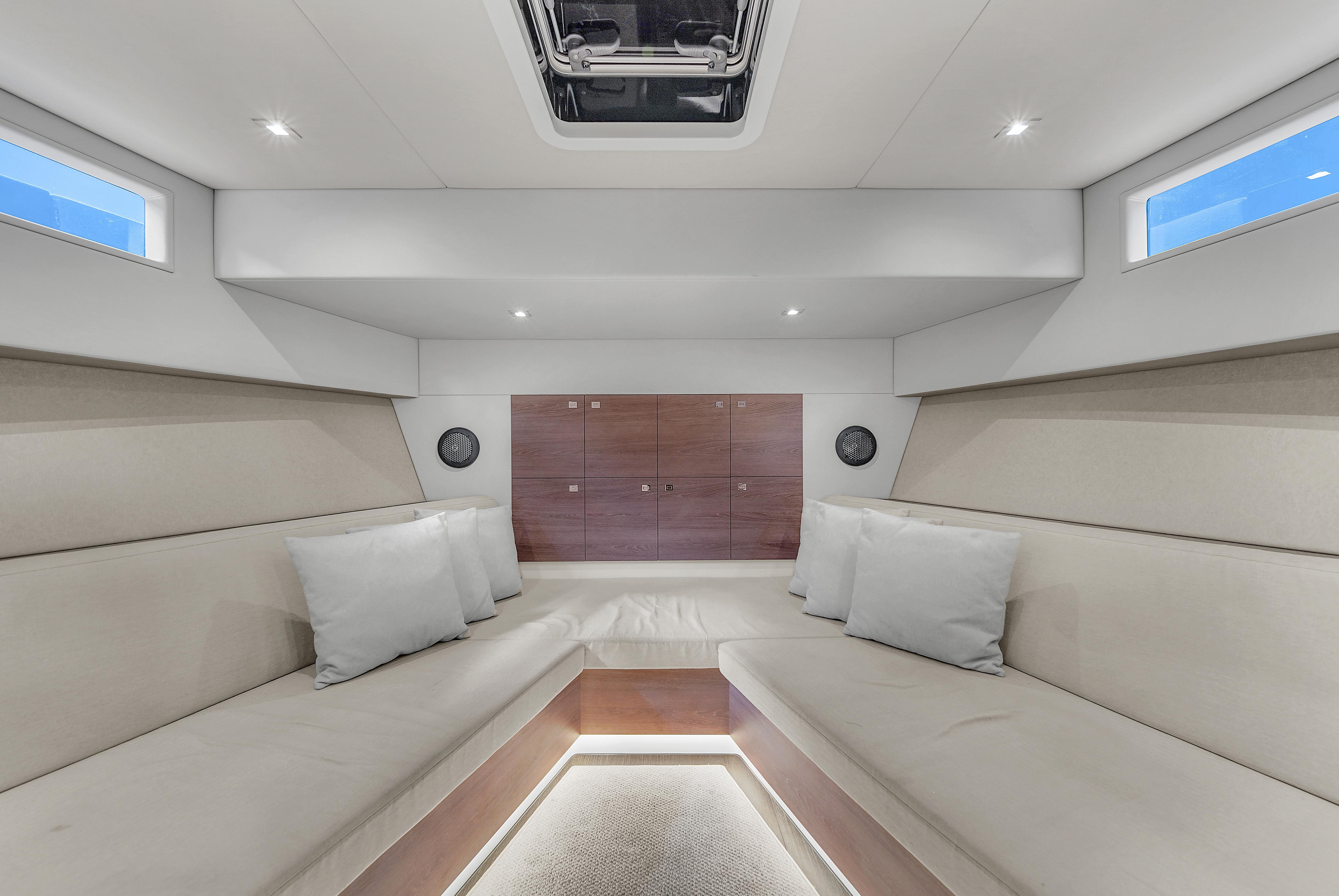 The lower deck is accessed via stairs forward of Helm to port. The main cabin has a large lounging space that converts to a master bed. The head and shower area are located near the foot of the stairs.