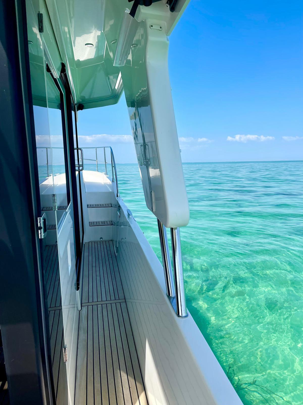 - Retractable stainless-steel staircase with double flybridge access ramp with teak steps