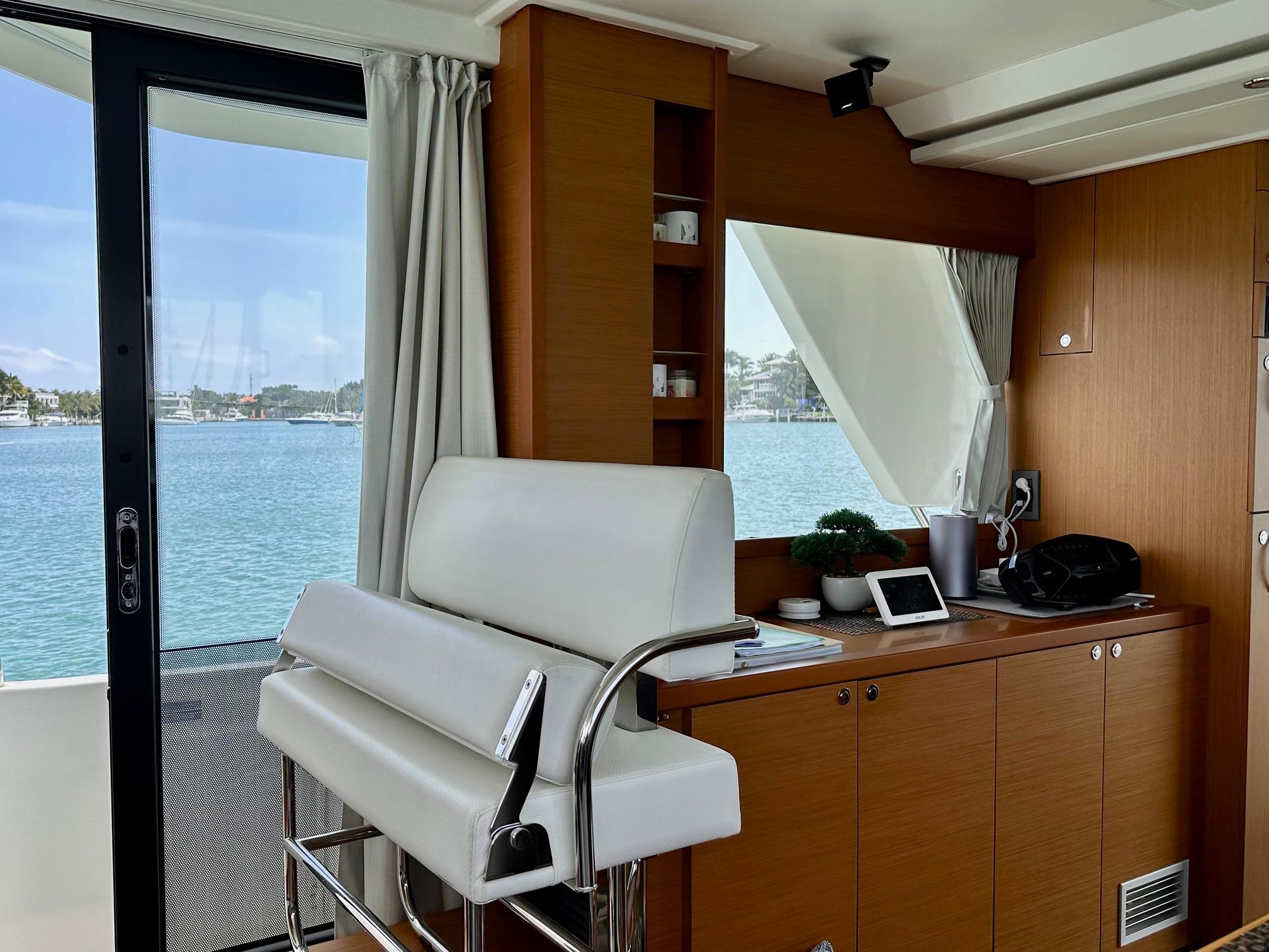 - Flybridge saloon with the face-to-face arrangement, consisting of an L-shaped bench with integrated storage and a teak table