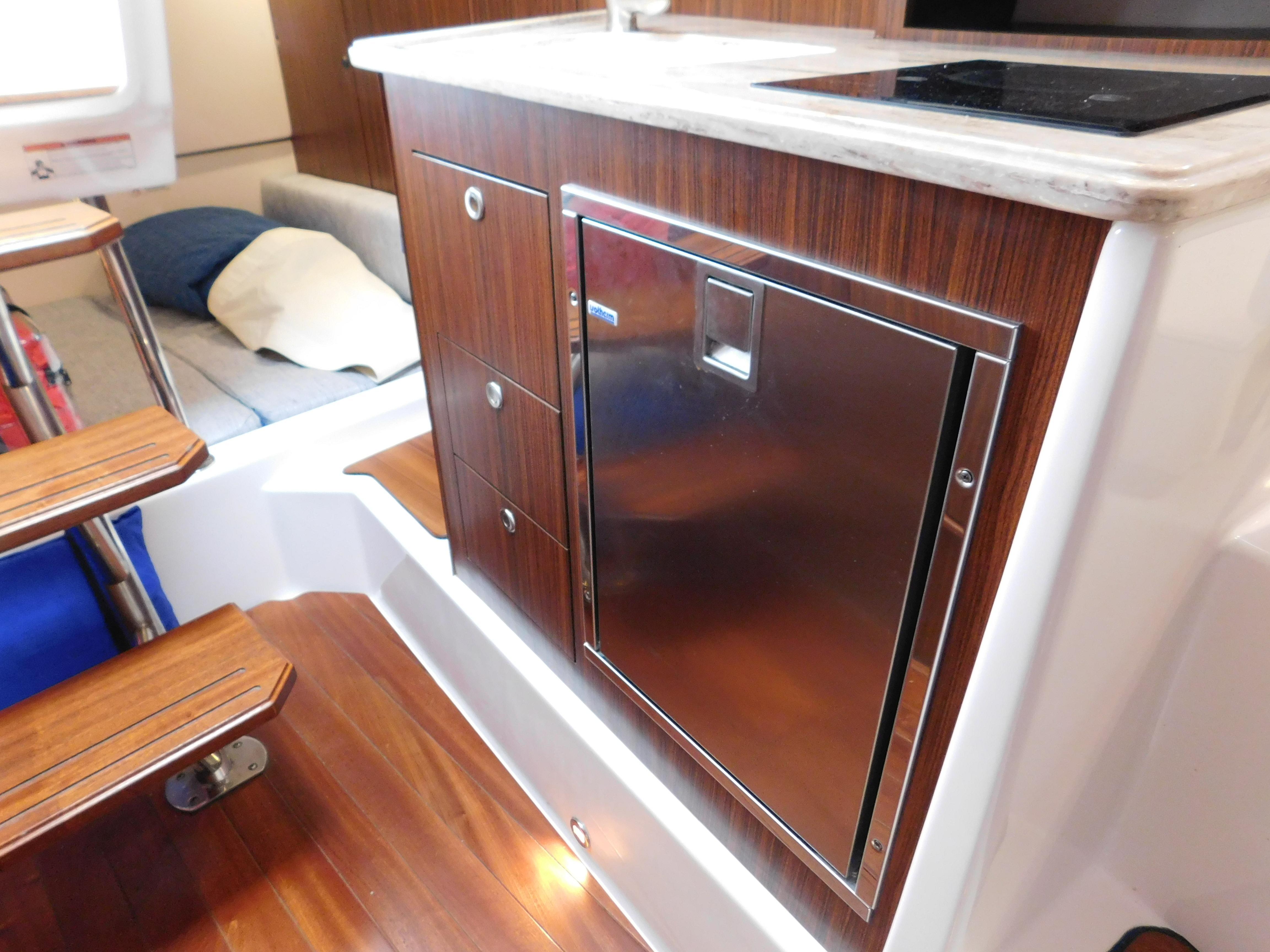 Pursuit’s OS 325 delivers innovation and excellence in the perfect sized package. A combination of finely engineered features designed with a timeless and elegant, yacht-like exterior. Her cabin finished with interior hardwoods, solid stock trim and modern fabrics comfort you for an intimate overnight in your private cove or harbor. When you’re ready to fish, the cockpit allows you to move around freely whether you are trolling offshore or dropping live baits at anchor or on the drift. After a few bites and your fair share of fresh catch, take the time to prepare a quick meal around the optional electric grill and outdoor entertainment center.