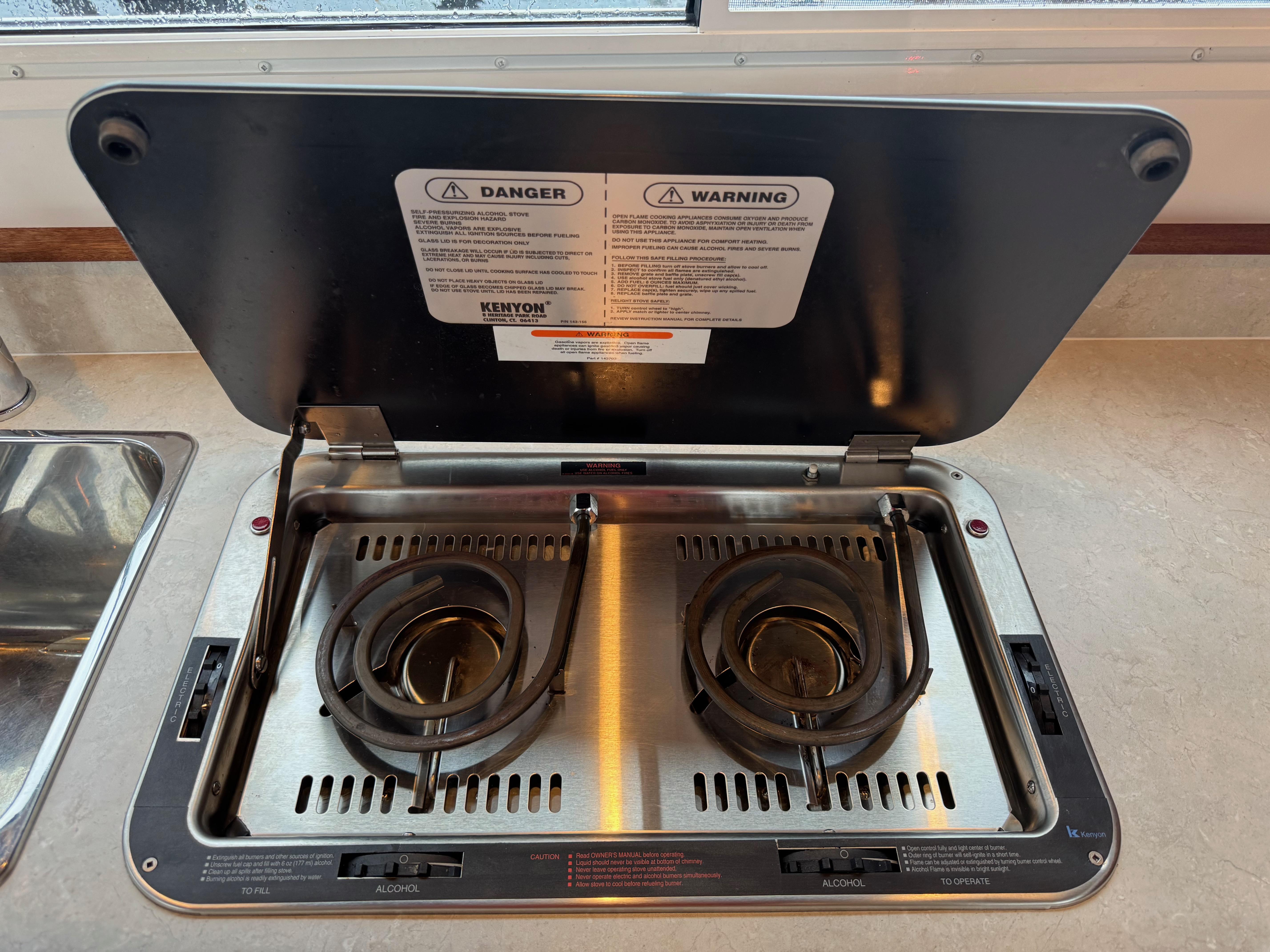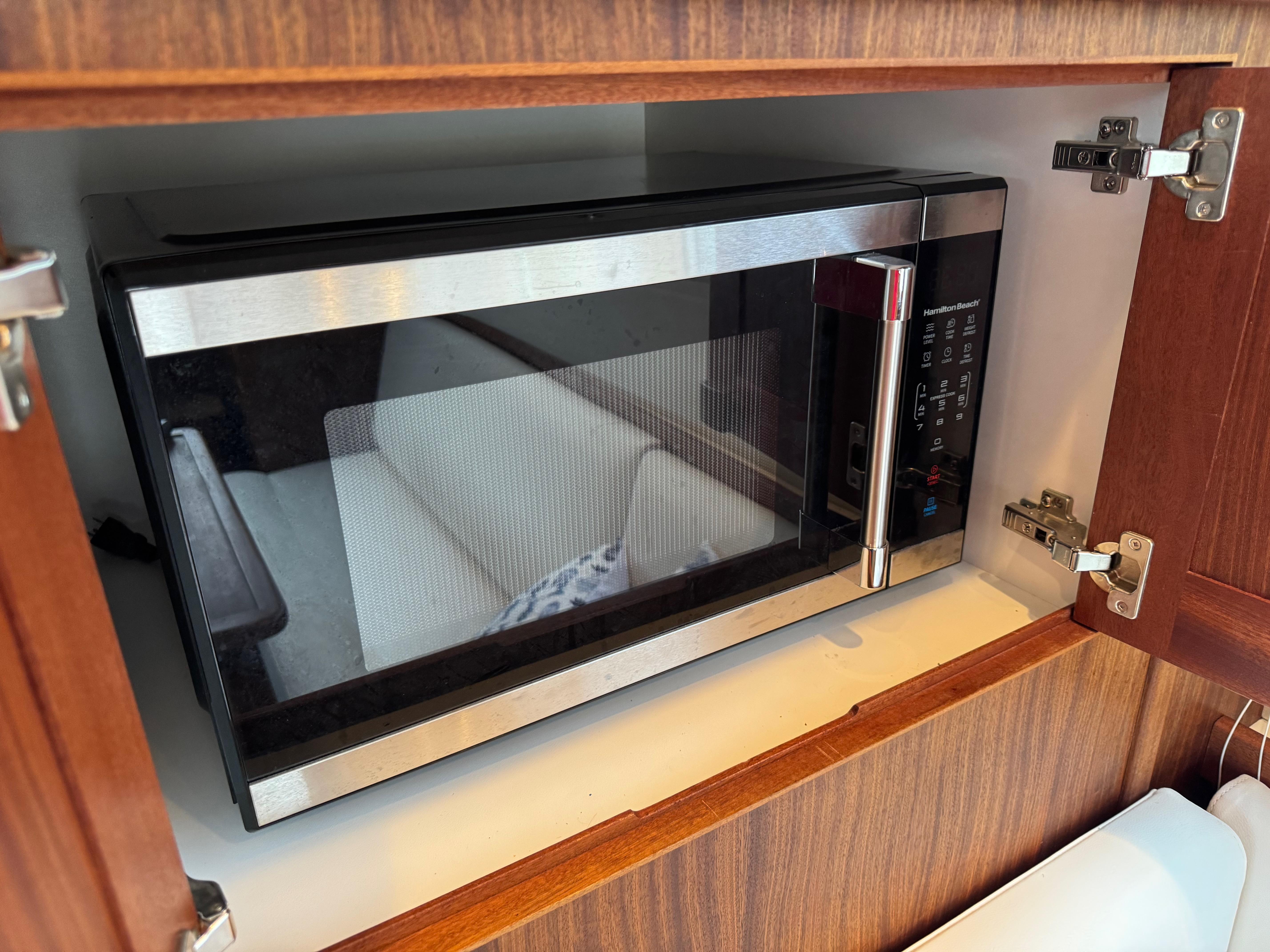 The fully equipped L-shaped galley is perfect for extended cruising, offering plenty of storage and all the appliances needed for meal preparation.