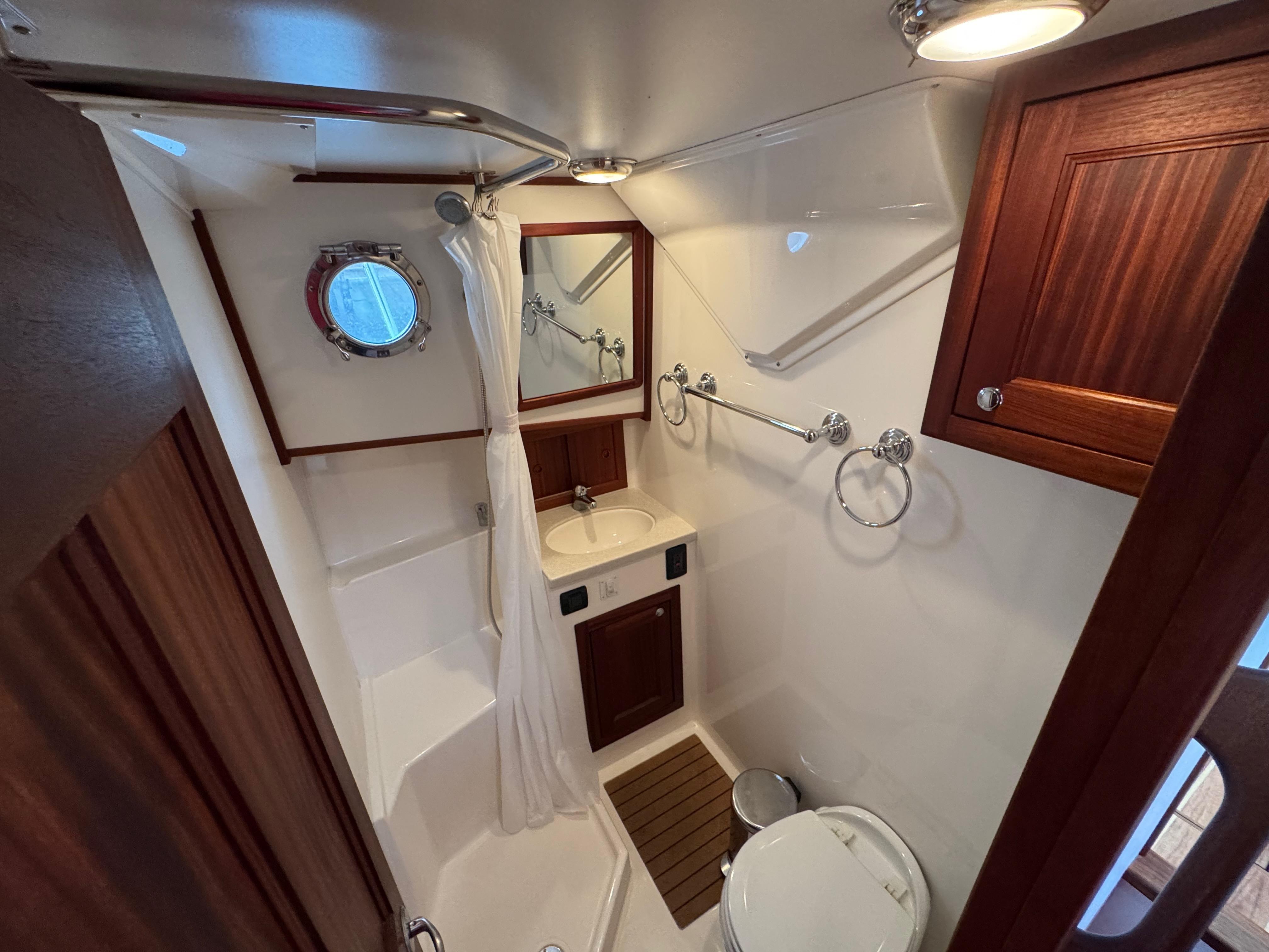 Stepping aboard Pharm Life is like entering a classic little ship that's both seaworthy and luxurious. Starting on the outside, the rugged yet elegant design immediately stands out. Enter through the aft cockpit into the salon, and you'll find warm wood finishes and thoughtful layouts for comfort and functionality. The pilothouse offers panoramic views, and the forward stateroom provides privacy and comfort. Below the pilot house and salon, the well-organized engine room showcases meticulous care and reliable systems. 2013 Nordic Tug 34- Accommodations