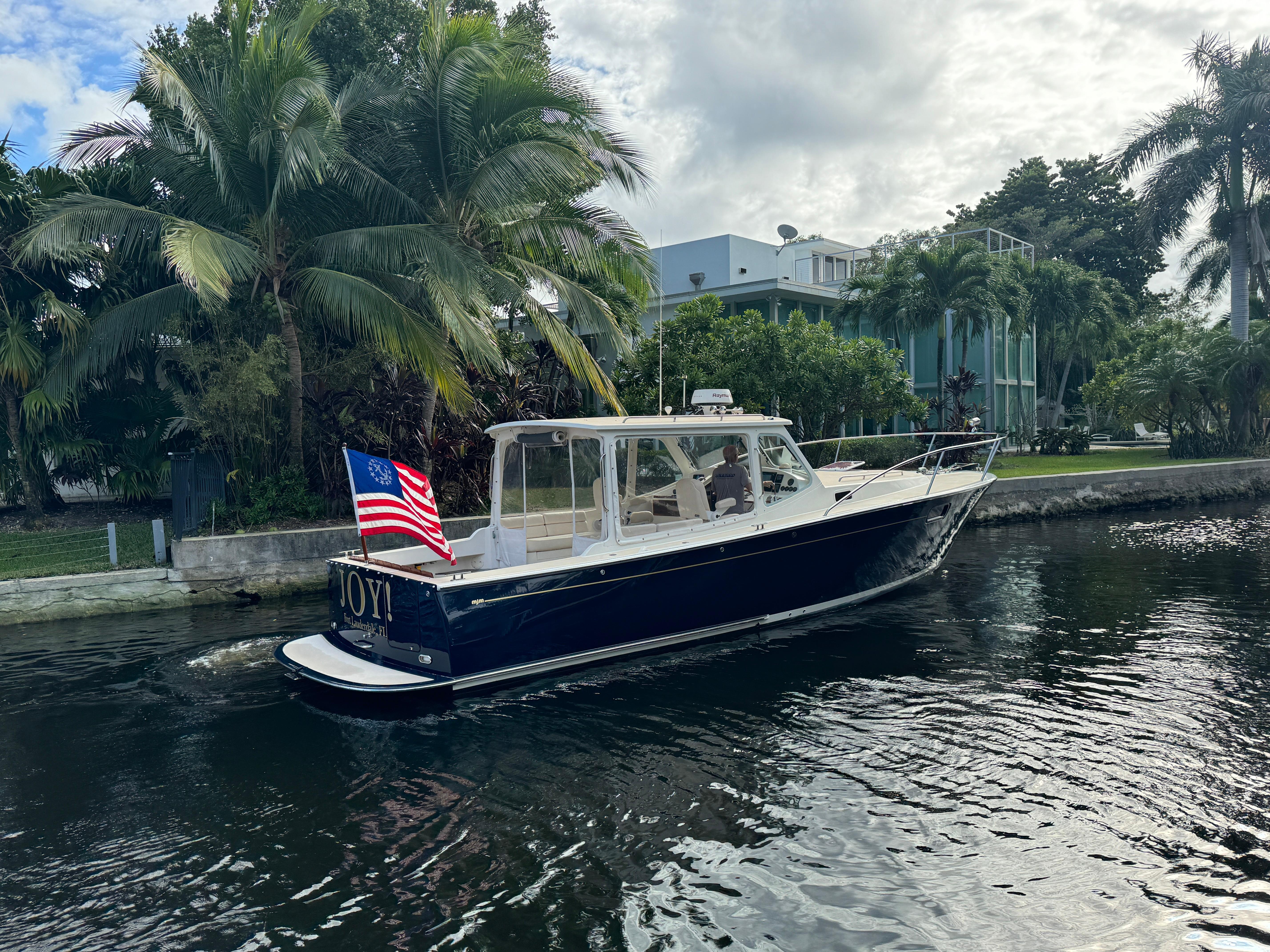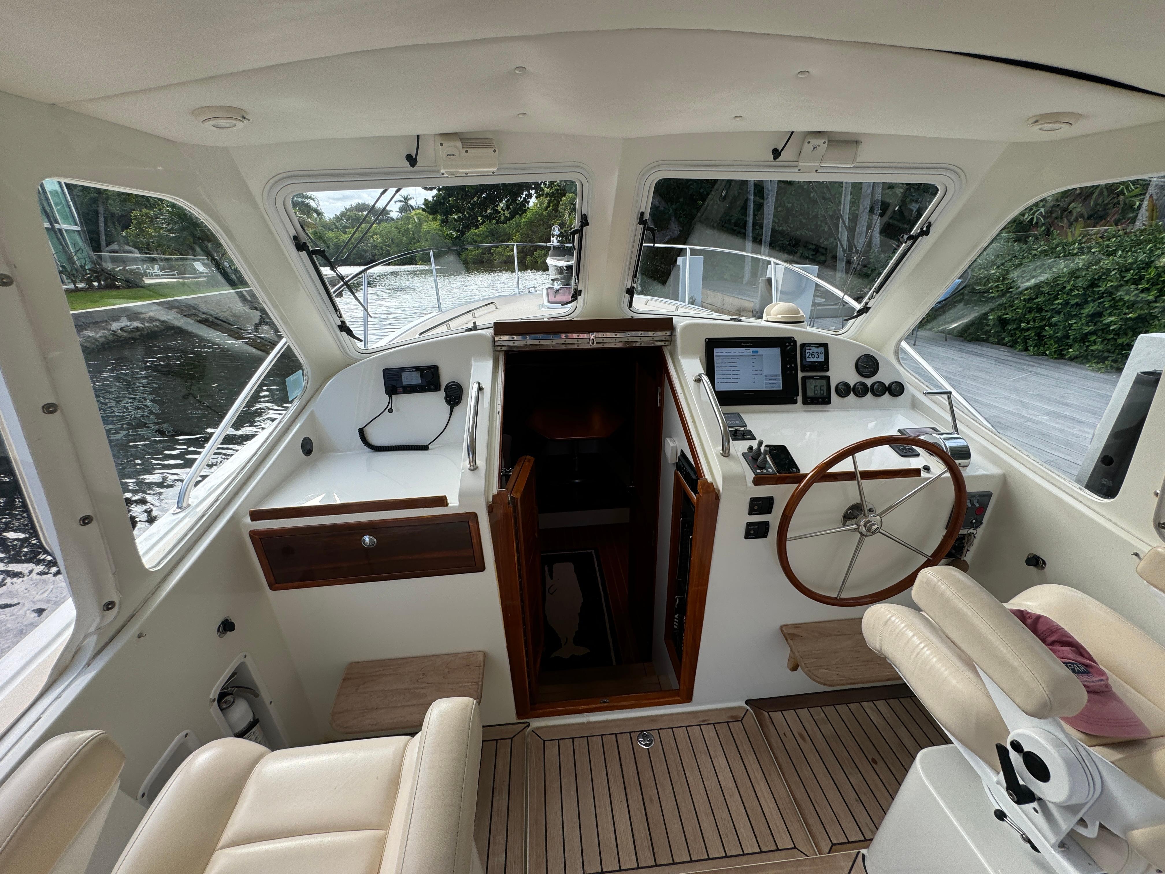 Joy! is a perfect example of a classic Down East Styled dayboat/ weekender and needs to be seen to be fully appreciated. In a day when boats seem to be getting more complicated with folding this and that electronically controlled gizmos, Joy! stands out for her elegant simplicity, outstanding build quality, and lovely design. Designed by Doug Zurn with the concept developed and nurtured by Bob Johnstone, co-founder of J-Boats and founder of MJM, the MJM 34Z was the first MJM model and started a remarkable string of boats. The ride of the boat in a seaway is truly remarkable. The 34z’s unique opening front pilothouse windows hinge up for an outstanding open- air feel. The pilothouse isinglass side curtains roll-up to fully open the boat on a beautiful day or close her off from the elements when the weather turns. Joy! was purchased after an extensive and careful search by her current owner. The current owner is a very knowledgeable boatsman who was in the boat equipment business for many years. His business allowed him inside access to many boat manufacturers and MJM was always special to him due to the quality of design and construction. The current owner has a thorough maintenance program of washing, waxing, and cleaning the bottom. “JOY!” is nicely equipped and detailed. Yanmar 6 LY inline 6 cylinder 440 HP Diesel engine with 793 hrs (oil changed Jan 2024)Flag Blue Awlgrip hullCream Deck with contrasting Tan NonskidBottom was soda blasted in early 2024 to remove years of bottom paint build up. Then epoxy barrier coats we added followed by Black Bottom paint. Beautiful Cherry interiorTeak Sole in Pilothouse and CockpitOpening transom door with access to swim platformStidd Helm SeatsRaymarine electronics: Axion Pro 12" S Chartplotter with 12" Hybrid-Touch ScreenGPS 19x GPSQuantum 2 RadarI-50 Depth Display with through hull transducerp70rs AutopilotRay218 VHF with DSC(new 2024)Remote Spotlight mounted on bow rail with control at helm stationFusion stereoExalto windshield wipers with fresh-water washReverso oil change pump for engine and transmissionRacor fuel/water filter with pressure gaugeCO2 AlarmElectric windlass with control at helm station and deckWeather Cover for pilothouse windshieldBlack out inserts for pilothouse side curtain Interior:The spacious interior provides seating for six around the table that easily drops to form a large berth for two. The large enclosed head features VacuFlush; galley with large refrigeration compartment and microwave. Satin-finished cherry interior with high gloss teak and holly flooring.