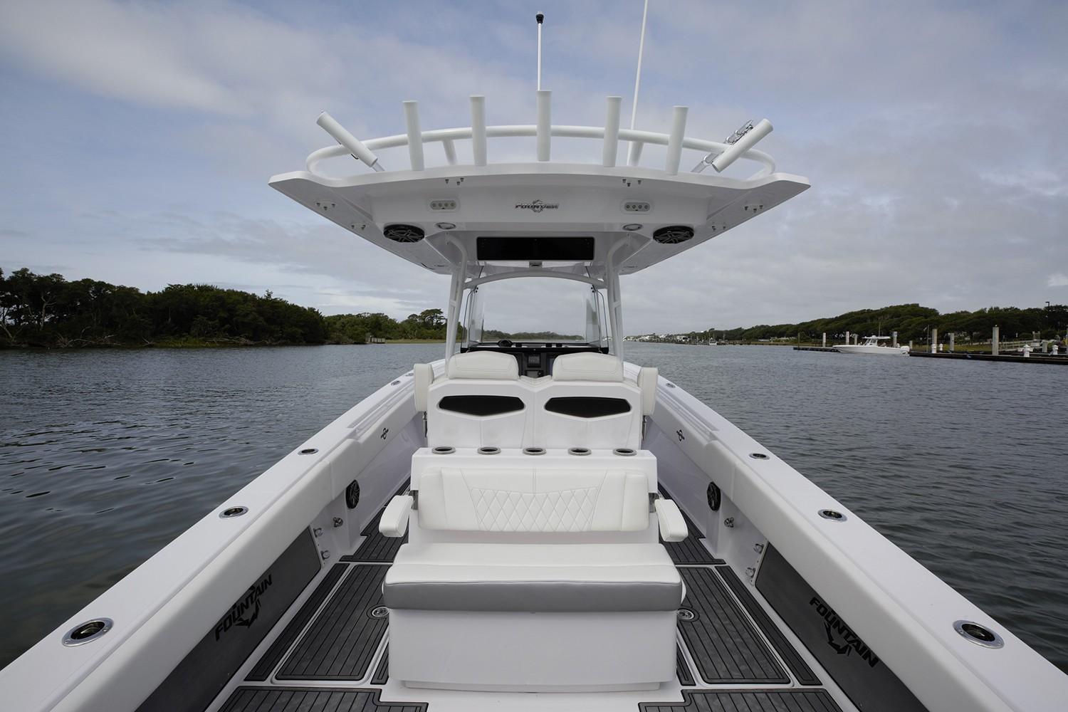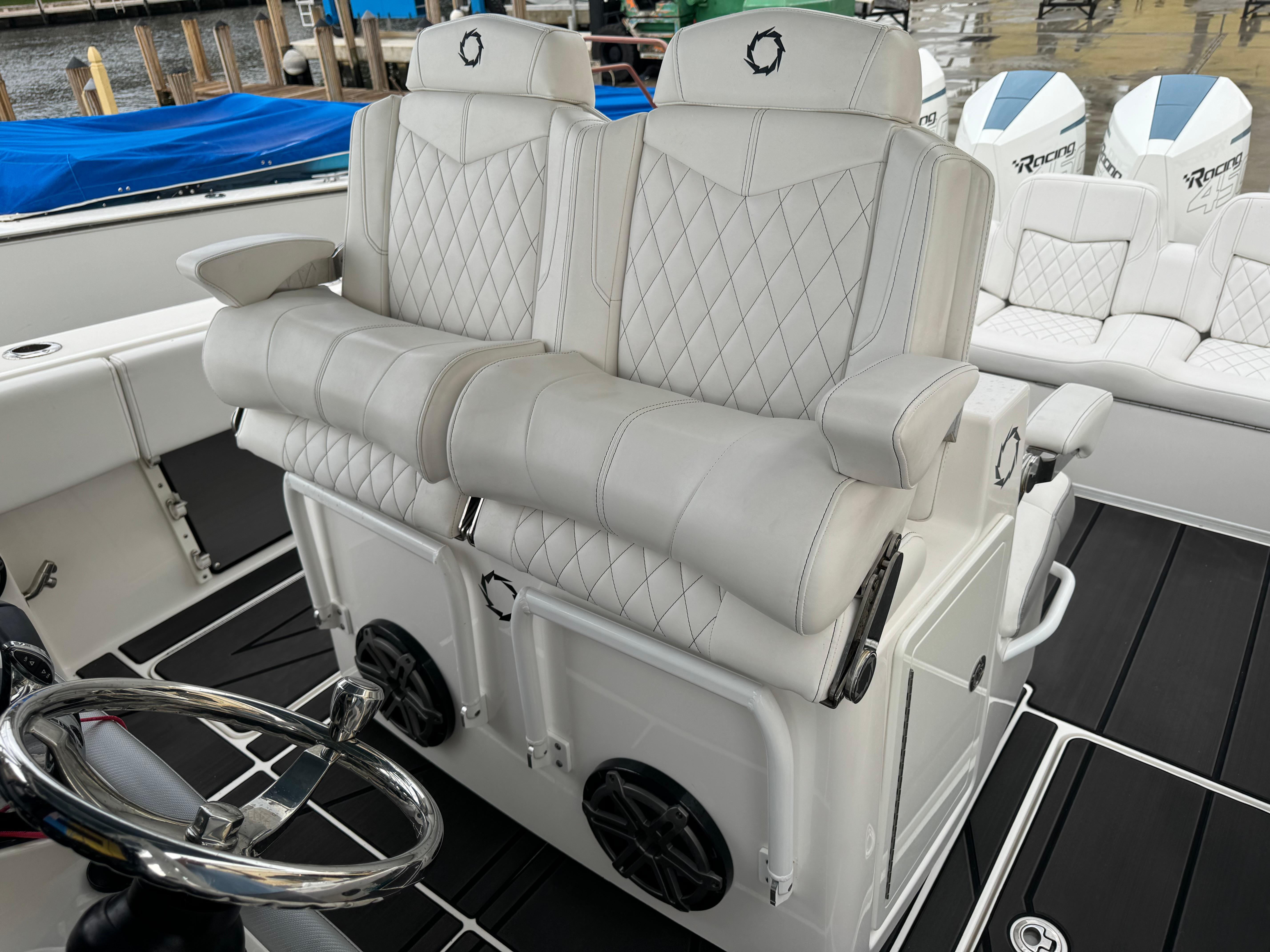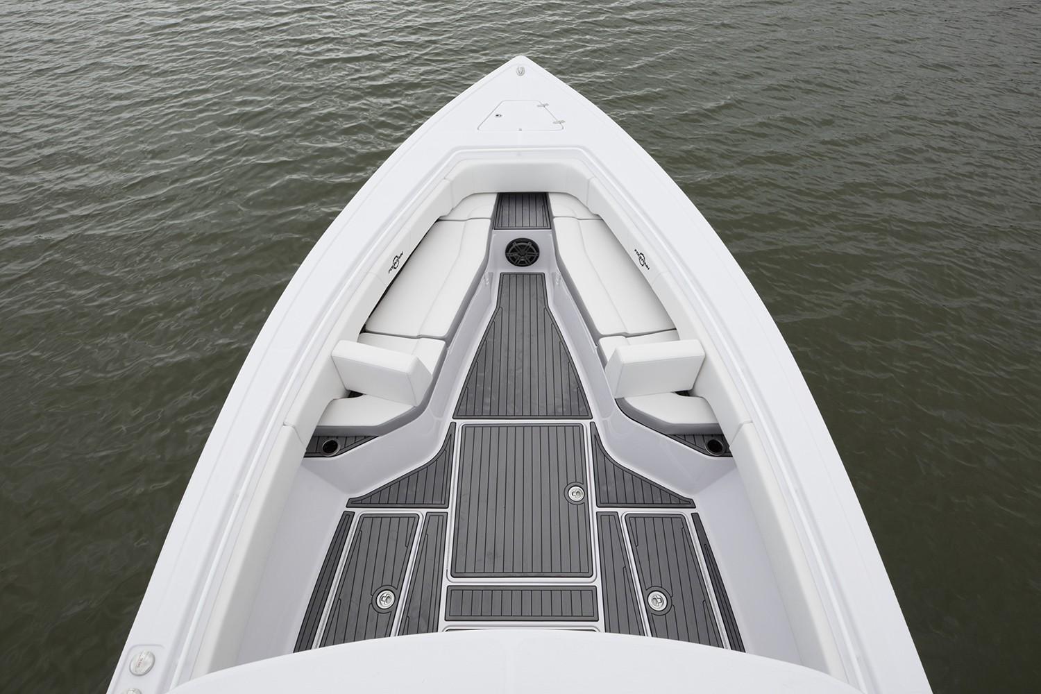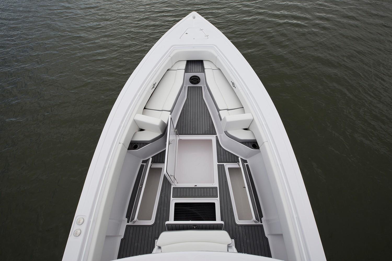 The entire walk-around layout of the 38 CC is given to uncluttered fishing space for multiple anglers. The T-top with rocket launchers can transport your rods above the fray while keeping them within easy grasp. In floor storage abound. If the family just wants a quiet ride down the intercoastal, look no further. Creature comforts like bow seat cushions, backrests and enclosed head on-board make for a perfect lazy day on the water. When ready for high performance, just open the throttles and instantly feel the power from the quad 450R's