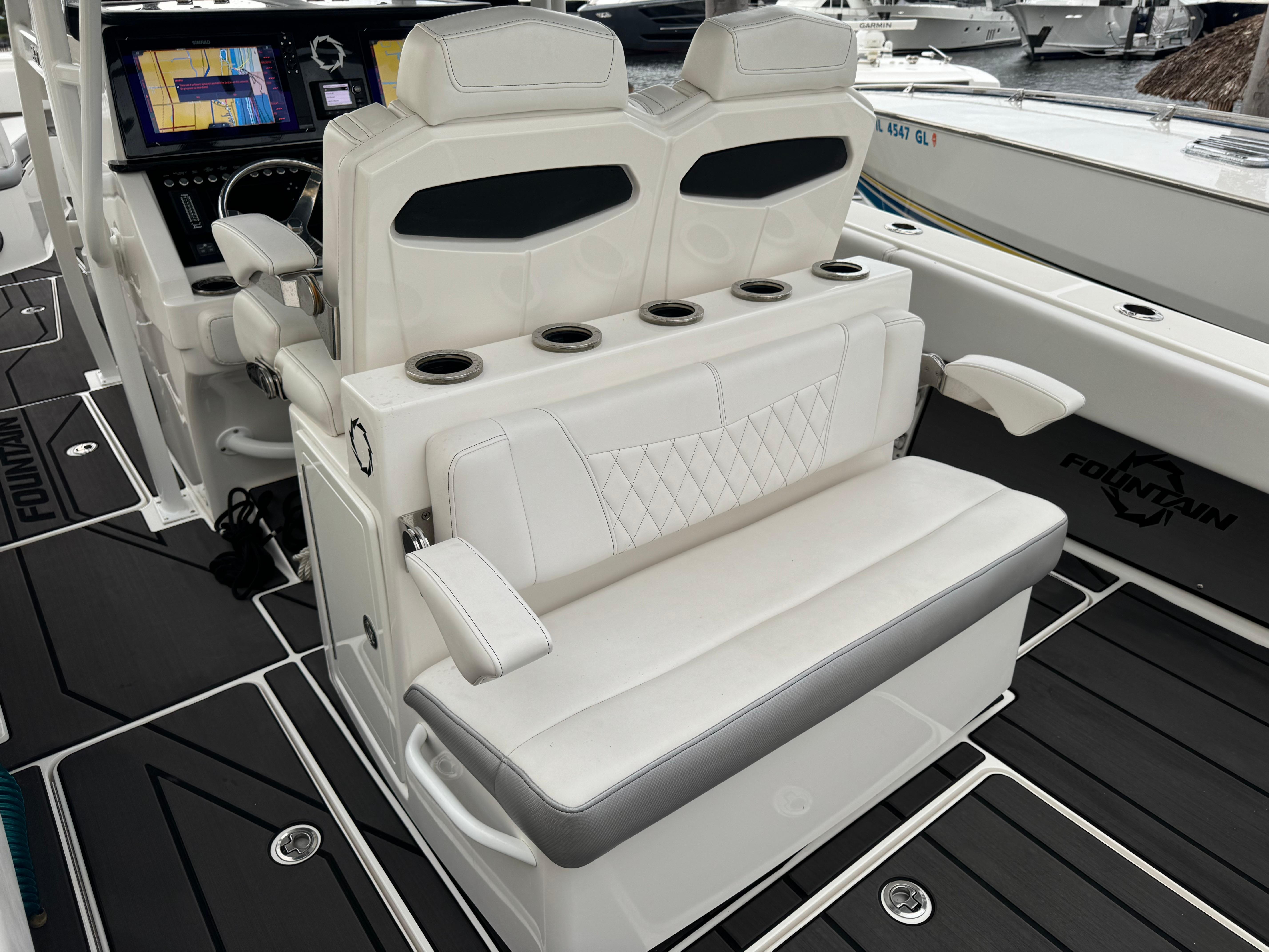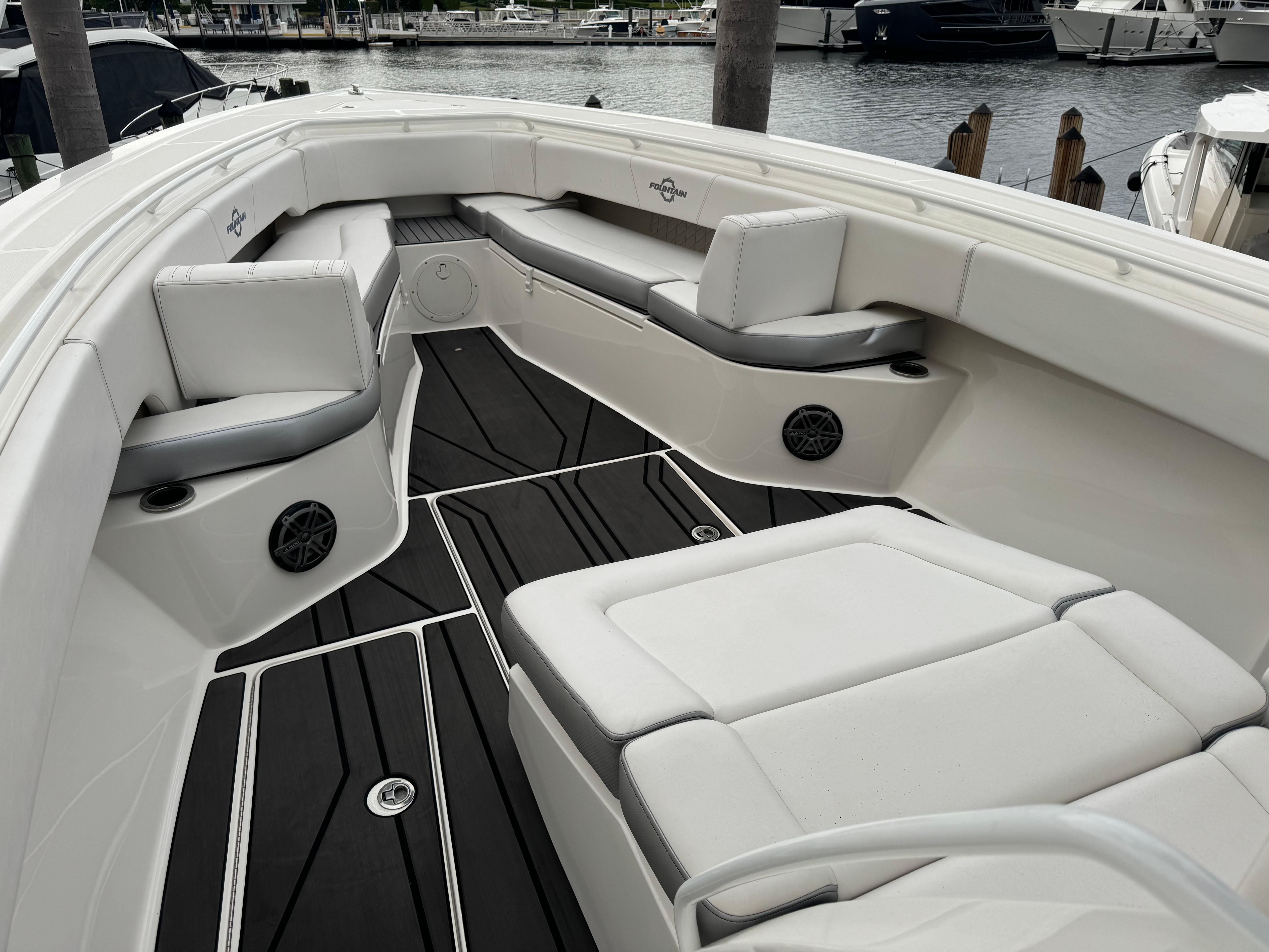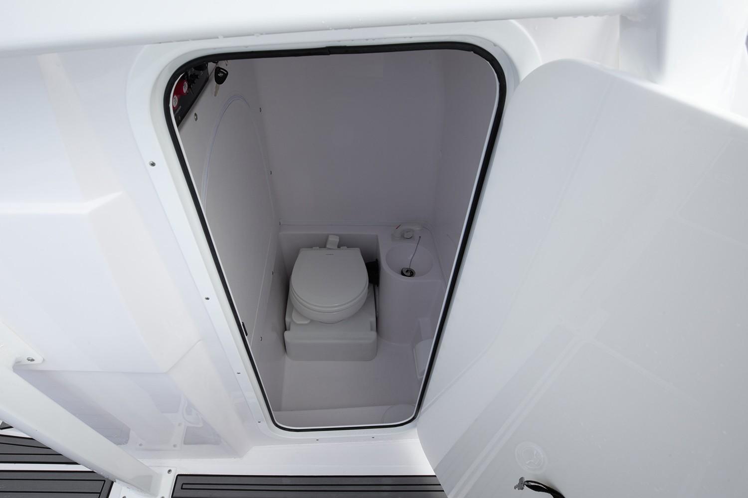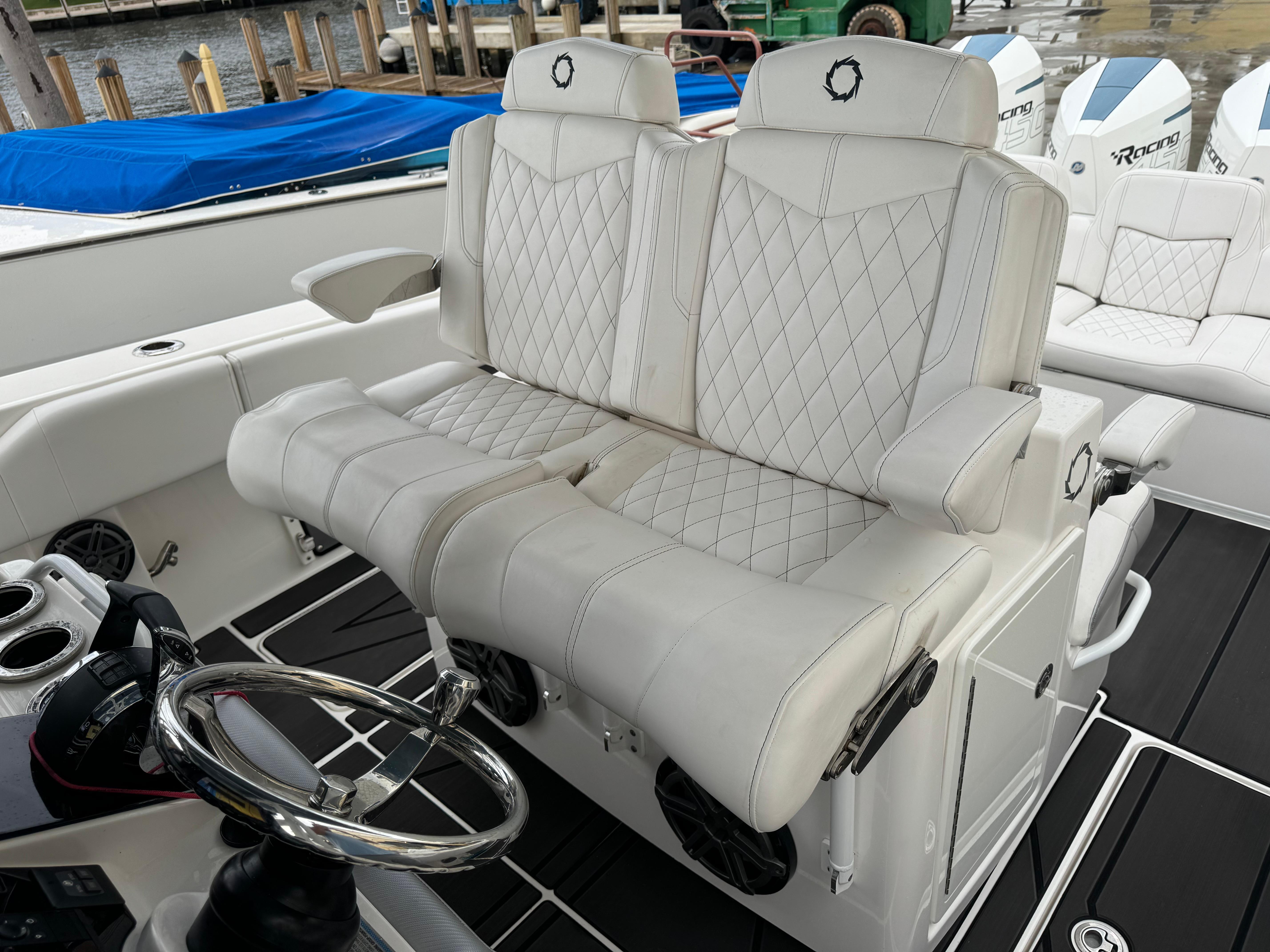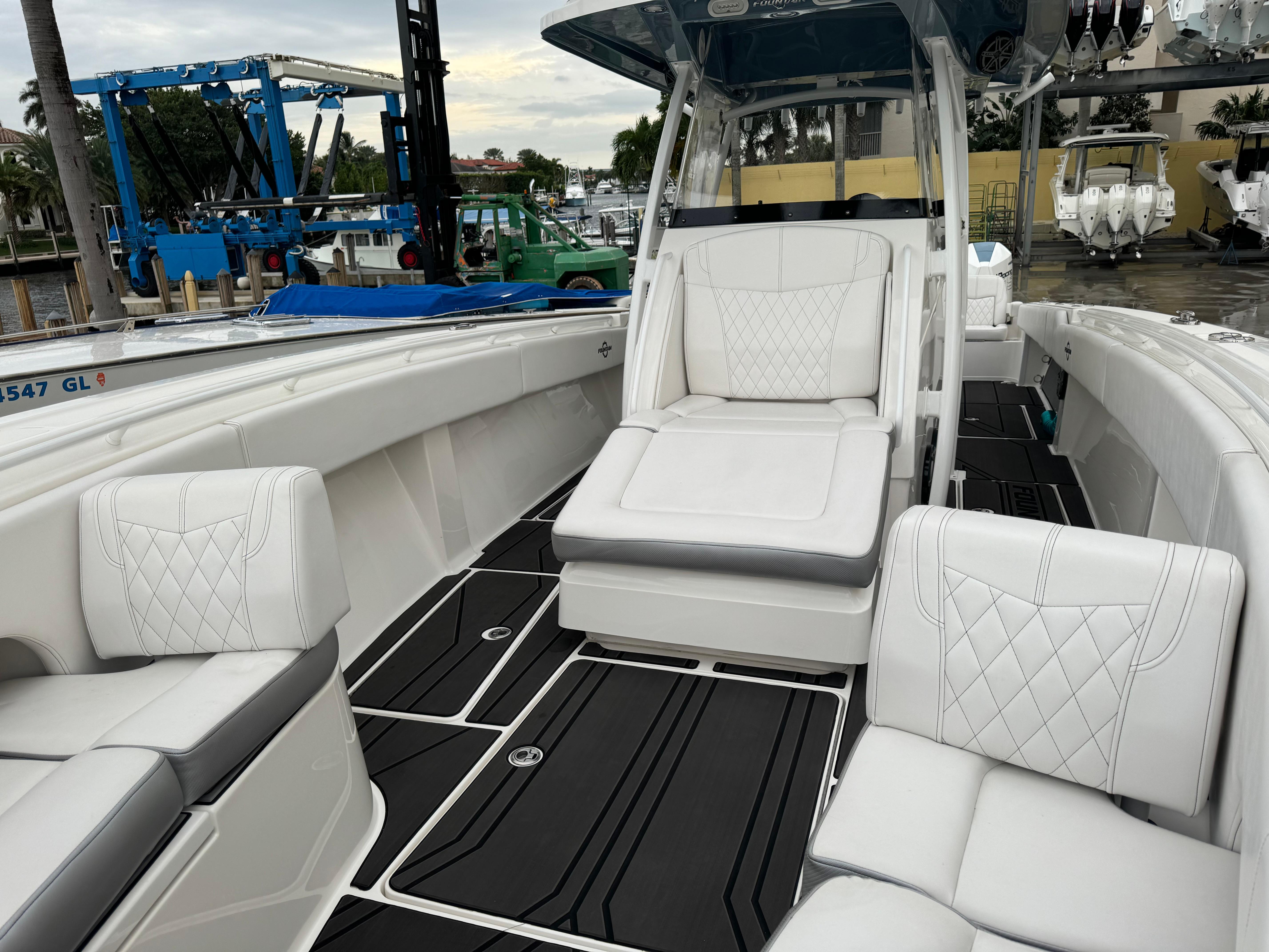 The entire walk-around layout of the 38 CC is given to uncluttered fishing space for multiple anglers. The T-top with rocket launchers can transport your rods above the fray while keeping them within easy grasp. In floor storage abound. If the family just wants a quiet ride down the intercoastal, look no further. Creature comforts like bow seat cushions, backrests and enclosed head on-board make for a perfect lazy day on the water. When ready for high performance, just open the throttles and instantly feel the power from the quad 450R's