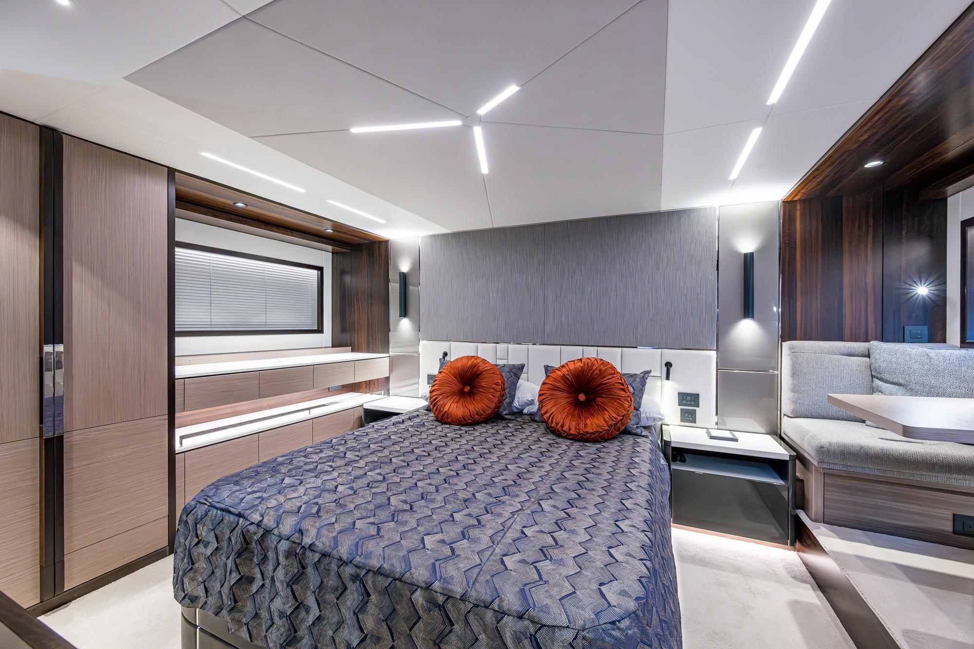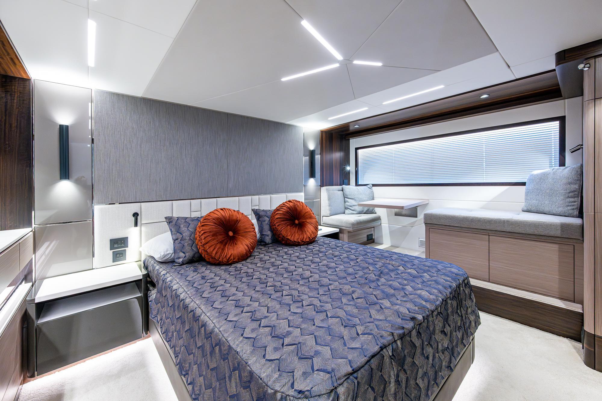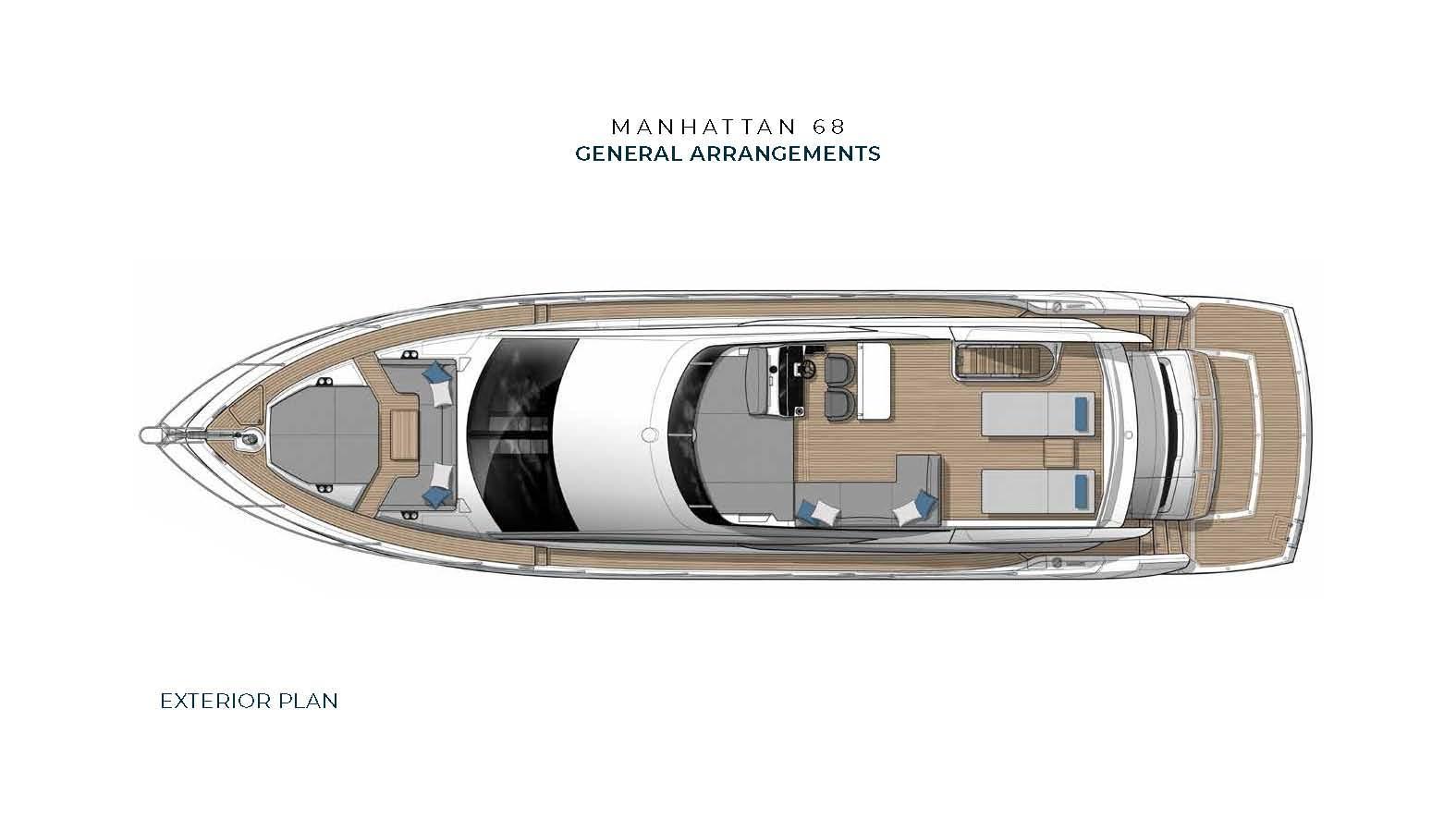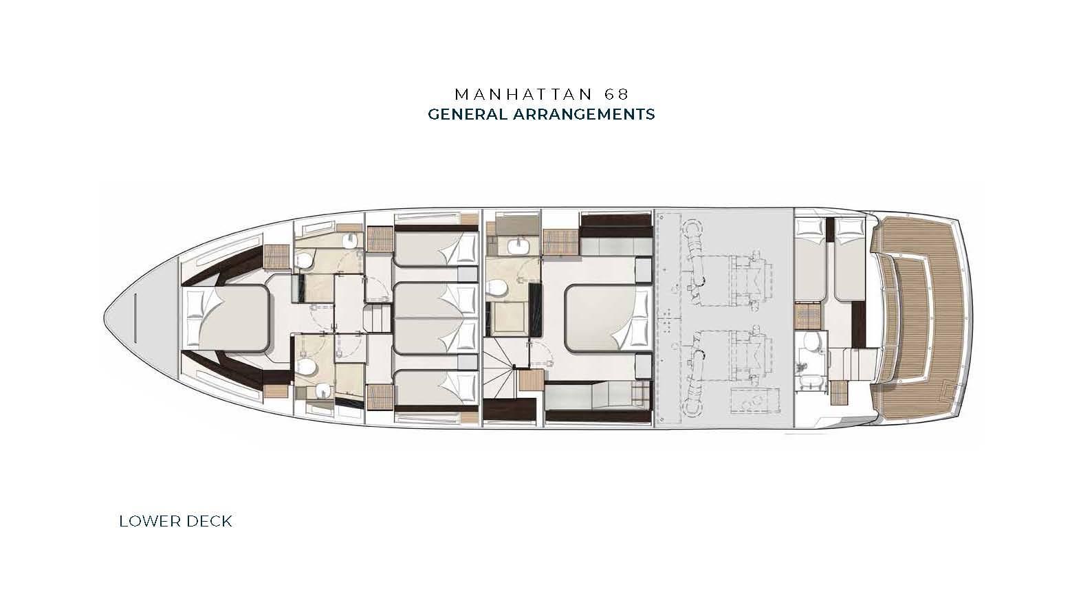 Built upon the exceptional family of award-winning Manhattan models, the Manhattan 68 offers an extraordinary level of comfort and luxury with incredible detailing. Throughout the main deck, there is a strong focus on creating generous, usable sociable spaces. The exterior lines flow effortlessly from the Portuguese-bridge bow seating and sunbathing areas to the expansive cockpit adjoining an innovative Beach Club with enhanced features, including a dedicated water level locker with built-in charging for two SeaBobs, delivering effortless enjoyment. Internally, the expansive main saloon benefits from sweeping glazing, extending below the TV console, revealing glimpses of the sea from all perspectives. The fully-equipped aft galley with a large dinette links seamlessly to the cockpit via full-width sliding doors, helping to bring everyone together. The innovative design layout allows owners to welcome guests with a strong focus on ambient lighting and interior detailing. Access to the spacious guest cabins is via the lower helm and elevated companion seating, whilst the sumptuous master cabin amidships is accessed via its very own staircase to port. This exceptional layout allows the owner and guests to move effortlessly between spaces. The interiors boast exquisite attention to detail with a new palate of upholstery that provides a cool, crisp, and contemporary look, unmistakably a Manhattan. The special edition Manhattan 68 Pacific option features a newly configured saloon layout with double over-sized U-shaped sofas on the main deck to maximise entertaining space on board. Below deck, owners can expect a continuation of this yacht’s meticulous design. The Pacific arrangement offers an exceptional amount of space for a boat of this size. The master cabin affords owners with flexibility to use their private space however they wish. Portside, owners can opt for a chaise lounge, breakfast table and seating, vanity table with additional draws, or an equipped sideboard for ample storage. What’s more, the master cabin benefits from its own private lounge and bar, providing a relaxing retreat for owners. This exceptional layout strikes a perfect balance between ample social spaces for entertaining and generous private quarters.