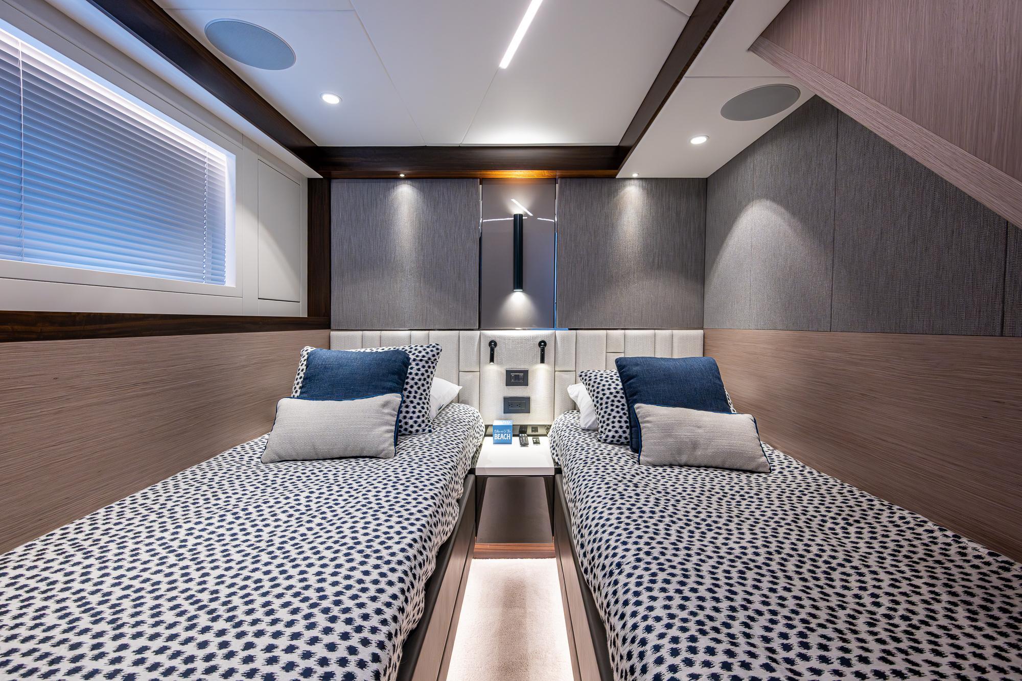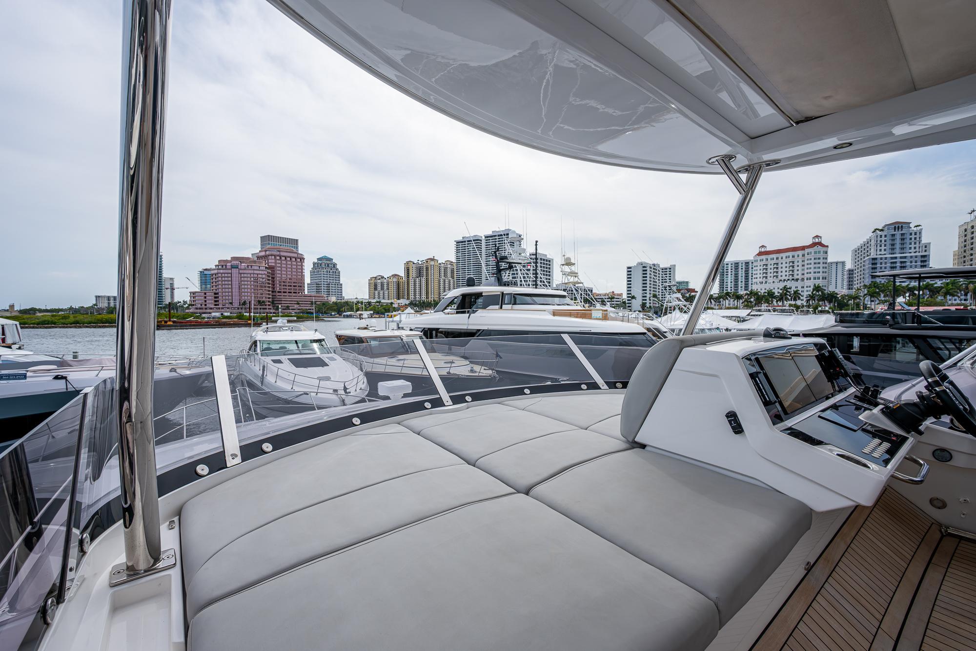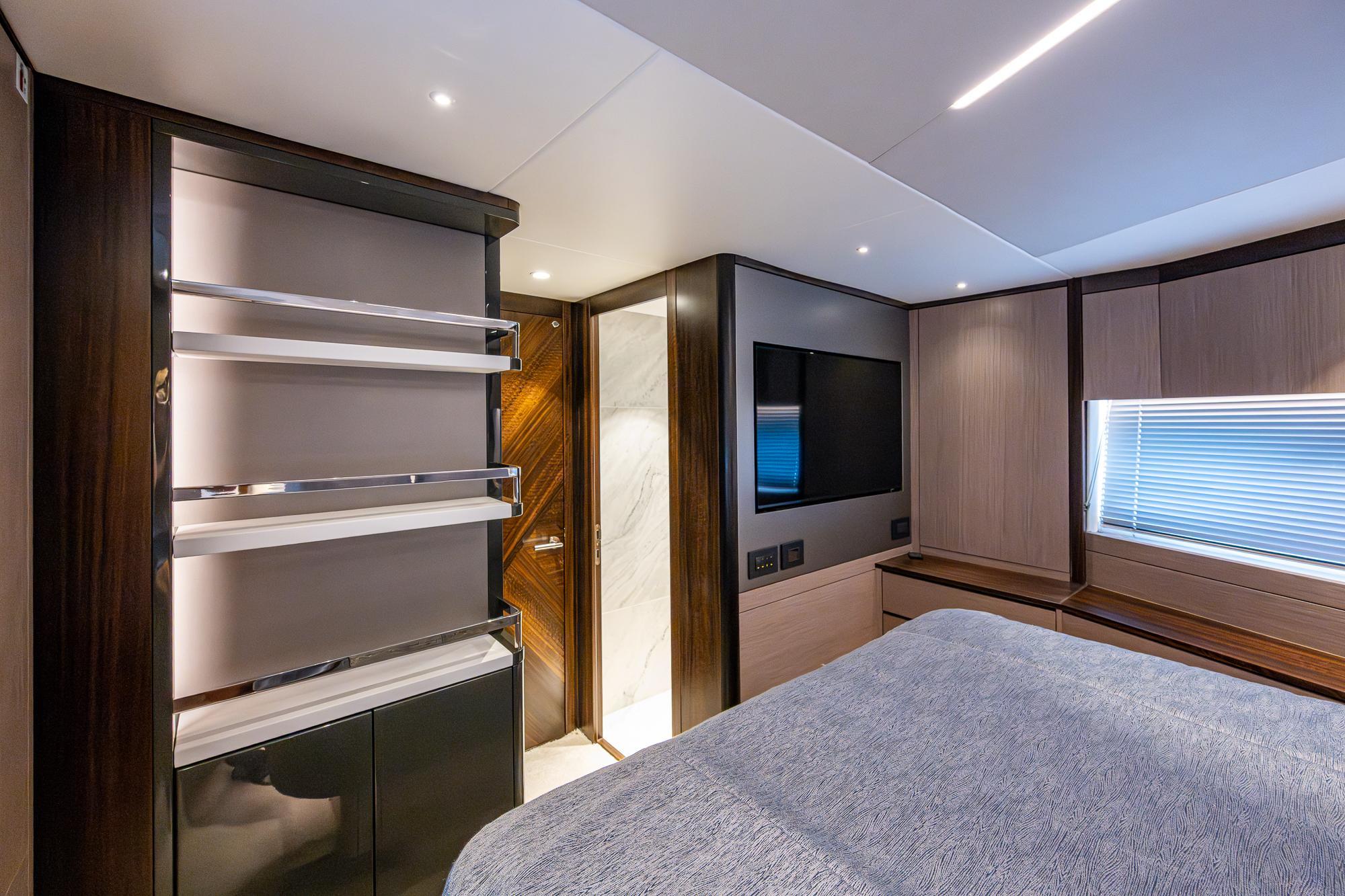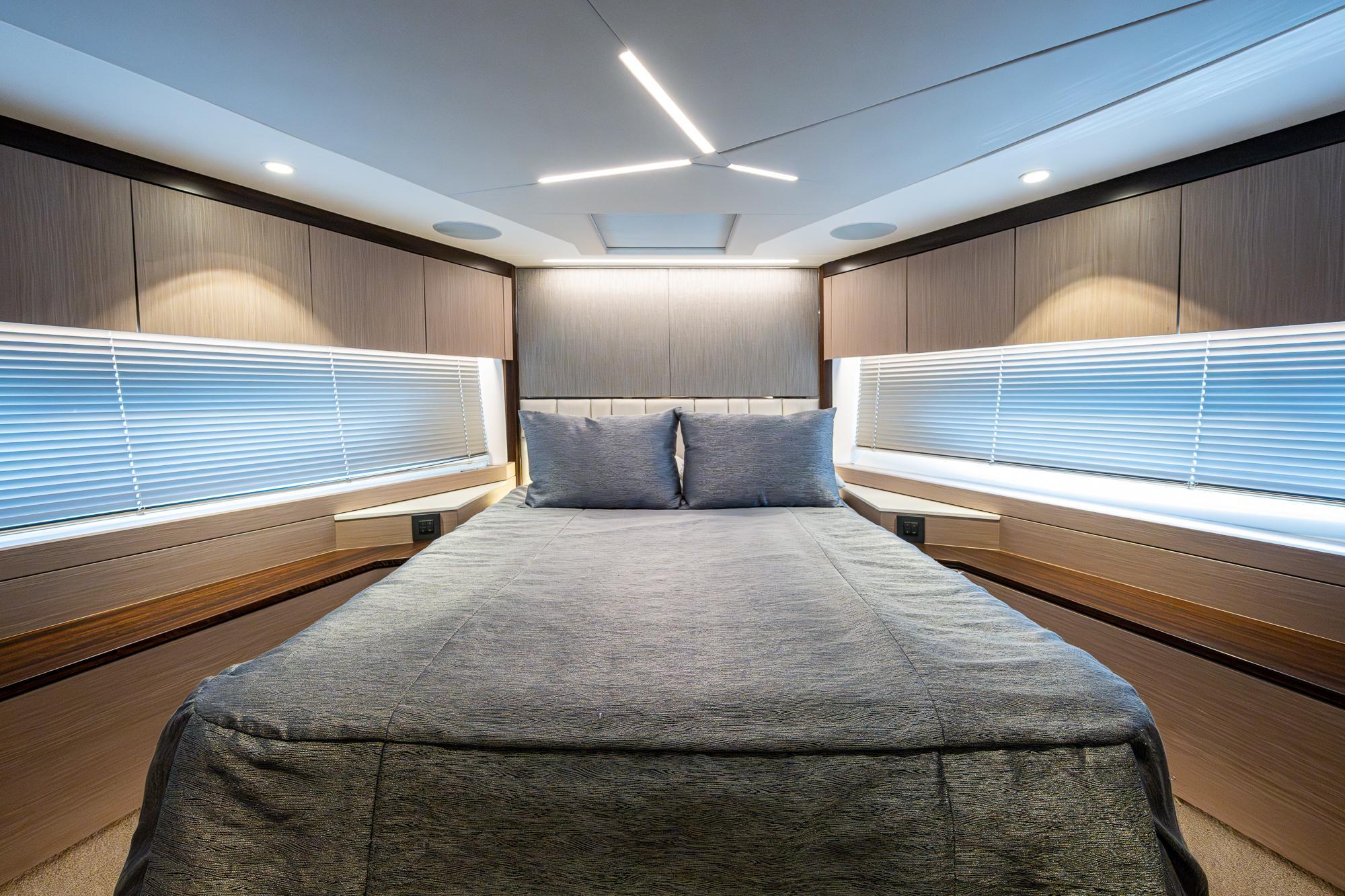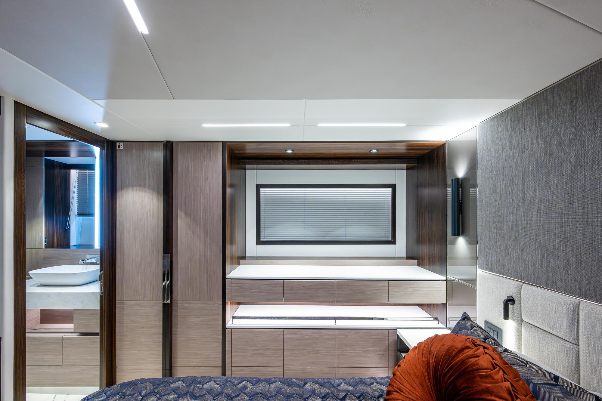 Built upon the exceptional family of award-winning Manhattan models, the Manhattan 68 offers an extraordinary level of comfort and luxury with incredible detailing. Throughout the main deck, there is a strong focus on creating generous, usable sociable spaces. The exterior lines flow effortlessly from the Portuguese-bridge bow seating and sunbathing areas to the expansive cockpit adjoining an innovative Beach Club with enhanced features, including a dedicated water level locker with built-in charging for two SeaBobs, delivering effortless enjoyment. Internally, the expansive main saloon benefits from sweeping glazing, extending below the TV console, revealing glimpses of the sea from all perspectives. The fully-equipped aft galley with a large dinette links seamlessly to the cockpit via full-width sliding doors, helping to bring everyone together. The innovative design layout allows owners to welcome guests with a strong focus on ambient lighting and interior detailing. Access to the spacious guest cabins is via the lower helm and elevated companion seating, whilst the sumptuous master cabin amidships is accessed via its very own staircase to port. This exceptional layout allows the owner and guests to move effortlessly between spaces. The interiors boast exquisite attention to detail with a new palate of upholstery that provides a cool, crisp, and contemporary look, unmistakably a Manhattan. The special edition Manhattan 68 Pacific option features a newly configured saloon layout with double over-sized U-shaped sofas on the main deck to maximise entertaining space on board. Below deck, owners can expect a continuation of this yacht’s meticulous design. The Pacific arrangement offers an exceptional amount of space for a boat of this size. The master cabin affords owners with flexibility to use their private space however they wish. Portside, owners can opt for a chaise lounge, breakfast table and seating, vanity table with additional draws, or an equipped sideboard for ample storage. What’s more, the master cabin benefits from its own private lounge and bar, providing a relaxing retreat for owners. This exceptional layout strikes a perfect balance between ample social spaces for entertaining and generous private quarters.