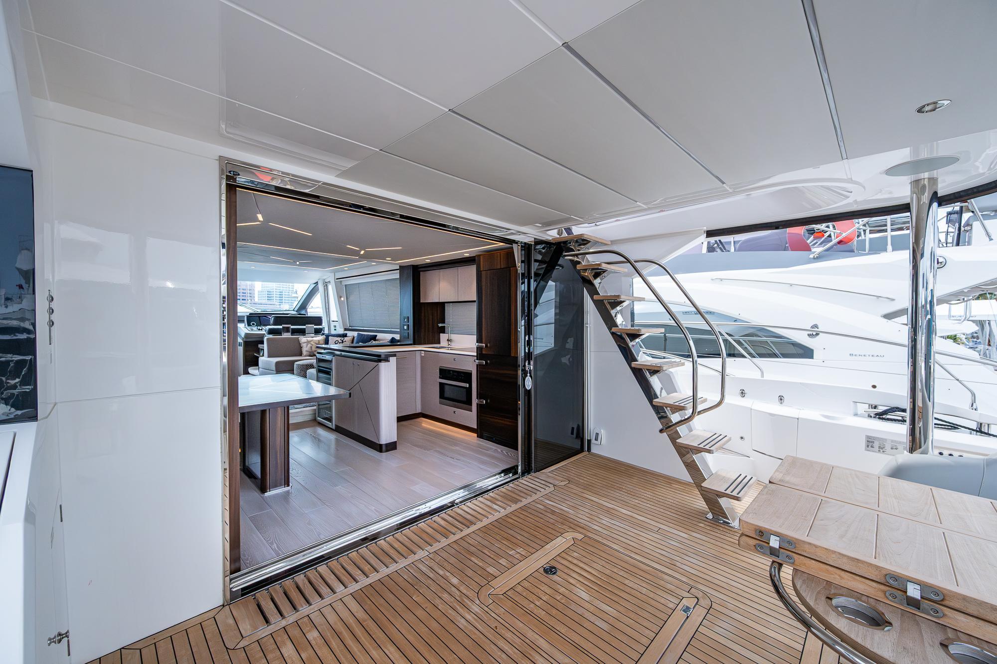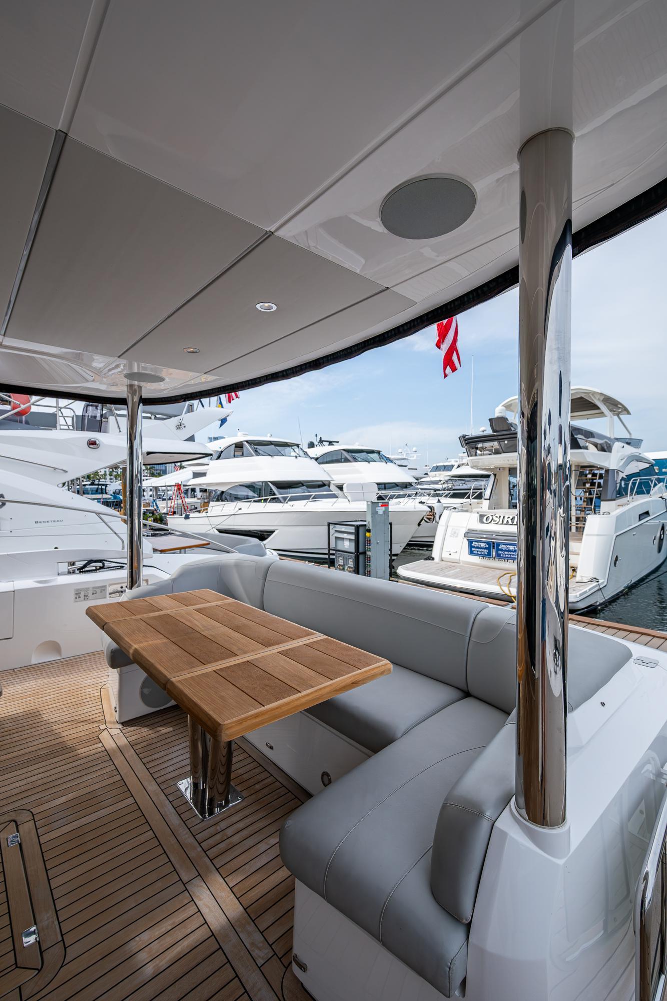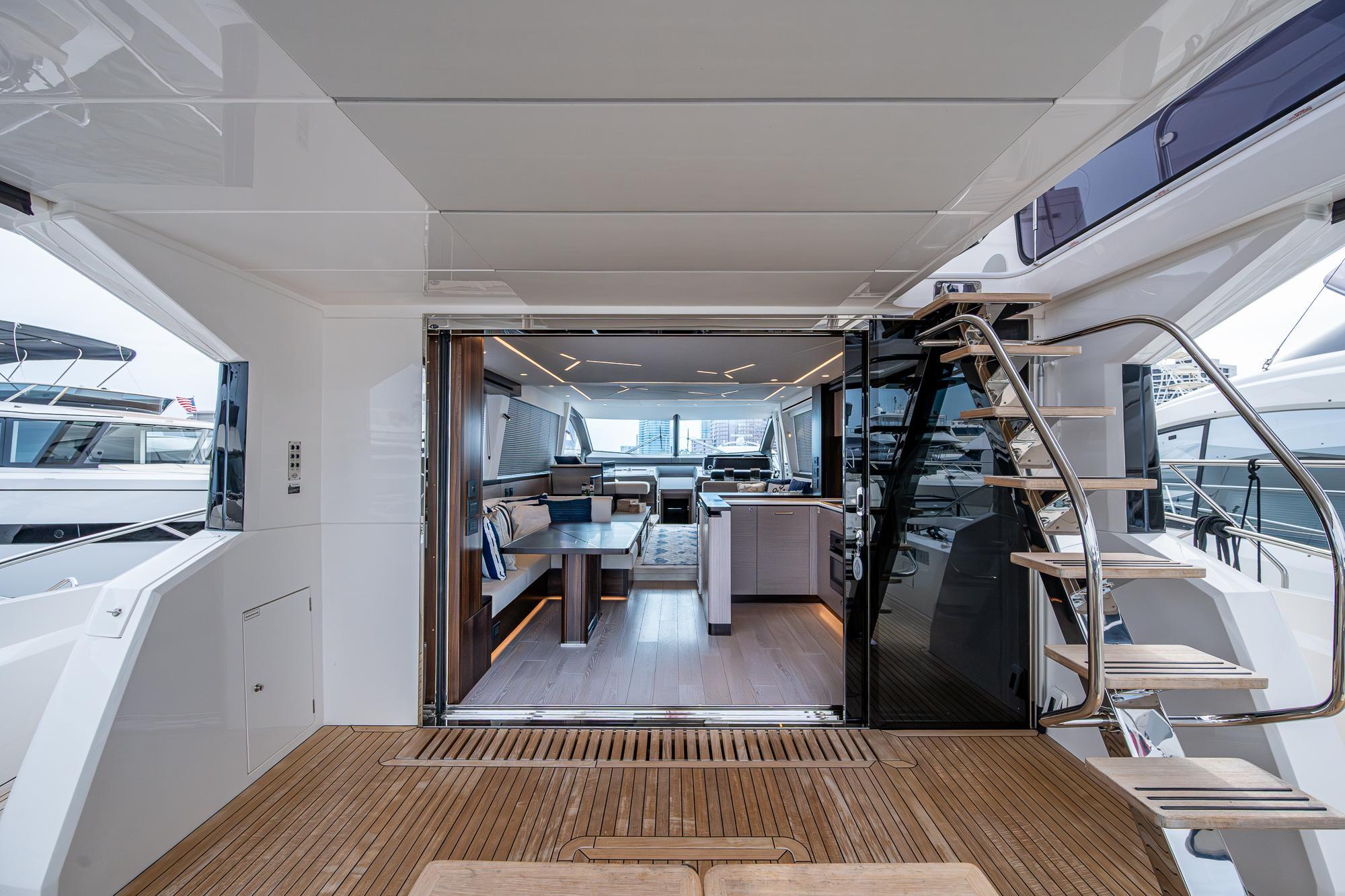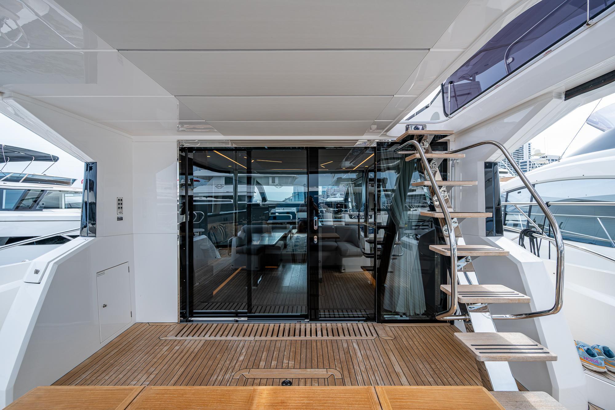 Built upon the exceptional family of award-winning Manhattan models, the Manhattan 68 offers an extraordinary level of comfort and luxury with incredible detailing. Throughout the main deck, there is a strong focus on creating generous, usable sociable spaces. The exterior lines flow effortlessly from the Portuguese-bridge bow seating and sunbathing areas to the expansive cockpit adjoining an innovative Beach Club with enhanced features, including a dedicated water level locker with built-in charging for two SeaBobs, delivering effortless enjoyment. Internally, the expansive main saloon benefits from sweeping glazing, extending below the TV console, revealing glimpses of the sea from all perspectives. The fully-equipped aft galley with a large dinette links seamlessly to the cockpit via full-width sliding doors, helping to bring everyone together. The innovative design layout allows owners to welcome guests with a strong focus on ambient lighting and interior detailing. Access to the spacious guest cabins is via the lower helm and elevated companion seating, whilst the sumptuous master cabin amidships is accessed via its very own staircase to port. This exceptional layout allows the owner and guests to move effortlessly between spaces. The interiors boast exquisite attention to detail with a new palate of upholstery that provides a cool, crisp, and contemporary look, unmistakably a Manhattan. The special edition Manhattan 68 Pacific option features a newly configured saloon layout with double over-sized U-shaped sofas on the main deck to maximise entertaining space on board. Below deck, owners can expect a continuation of this yacht’s meticulous design. The Pacific arrangement offers an exceptional amount of space for a boat of this size. The master cabin affords owners with flexibility to use their private space however they wish. Portside, owners can opt for a chaise lounge, breakfast table and seating, vanity table with additional draws, or an equipped sideboard for ample storage. What’s more, the master cabin benefits from its own private lounge and bar, providing a relaxing retreat for owners. This exceptional layout strikes a perfect balance between ample social spaces for entertaining and generous private quarters.