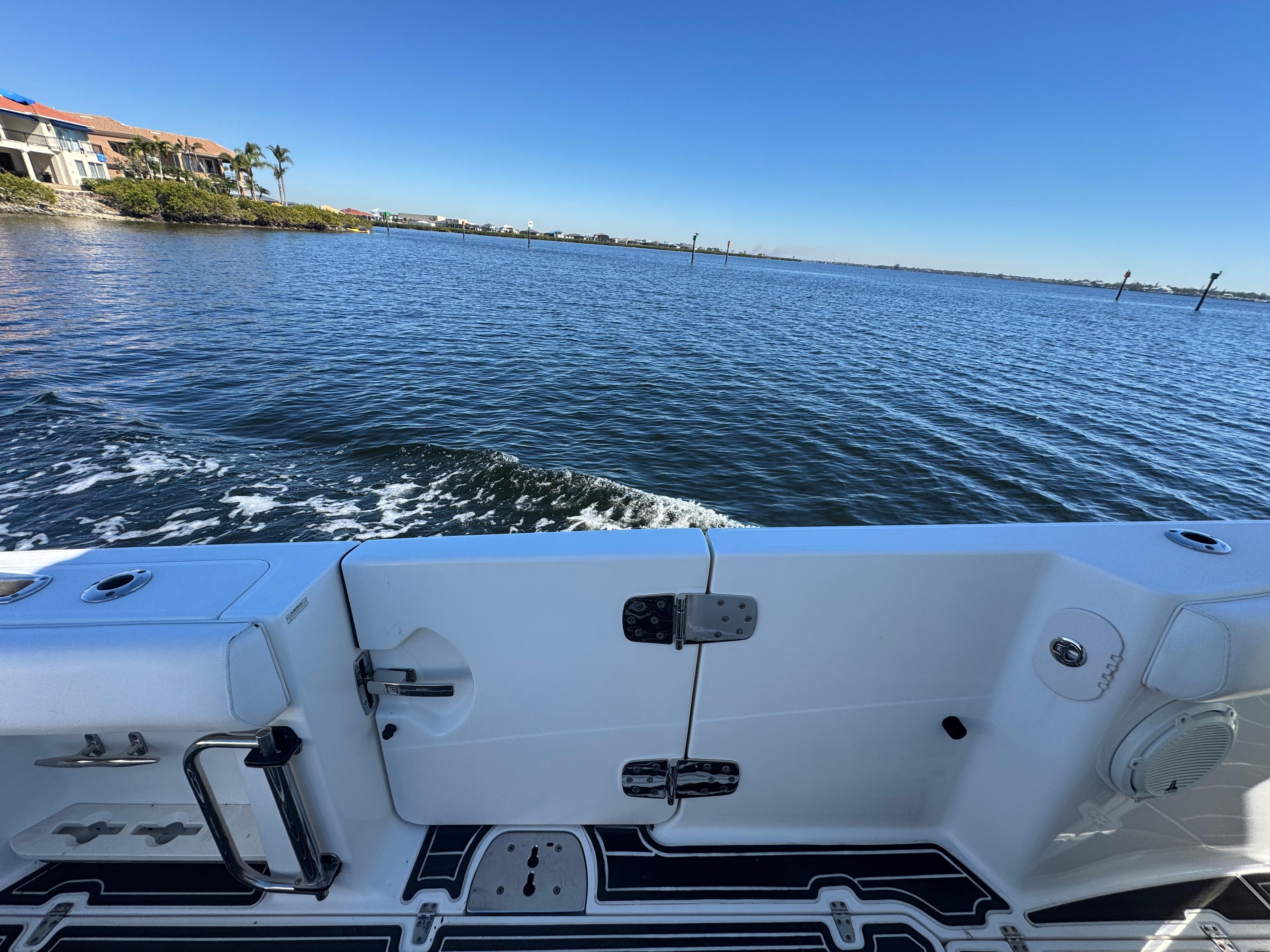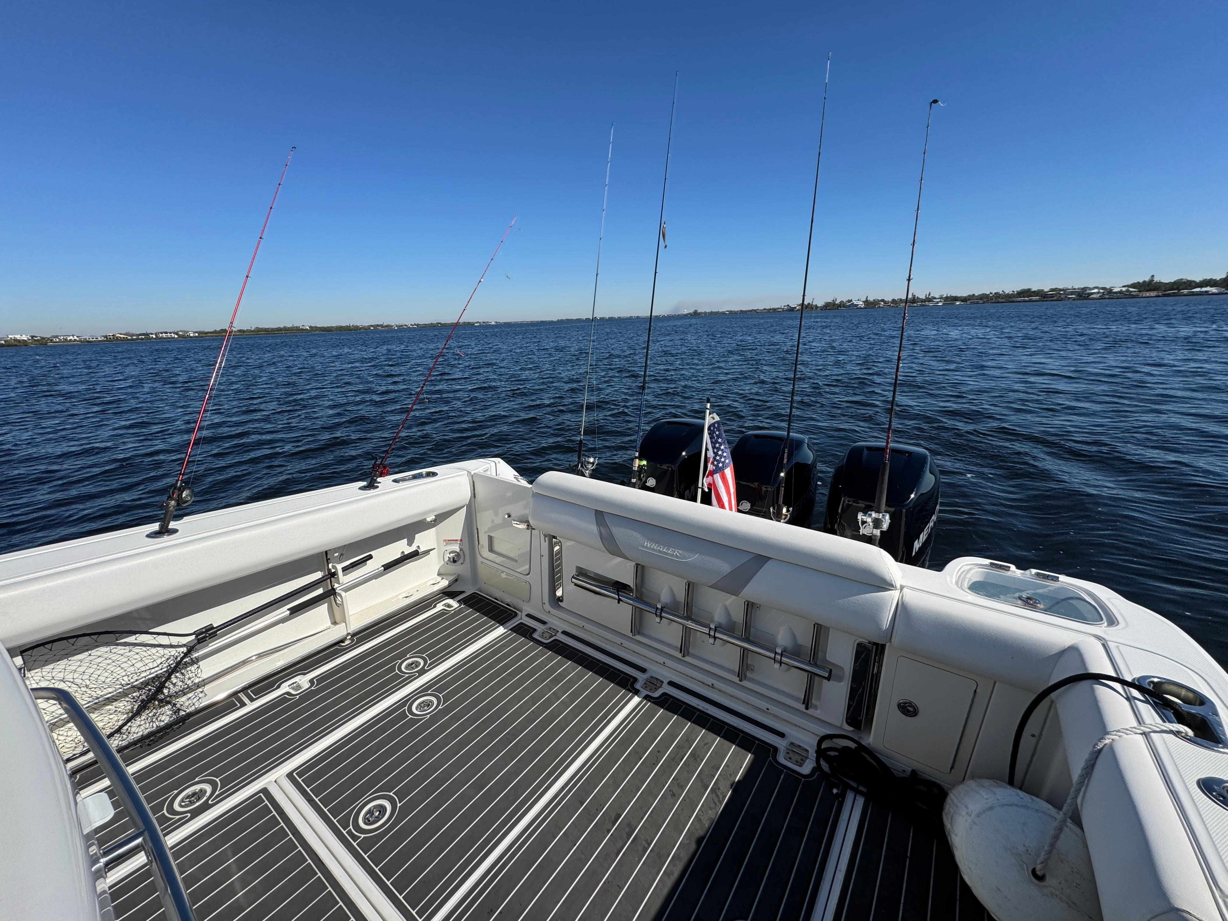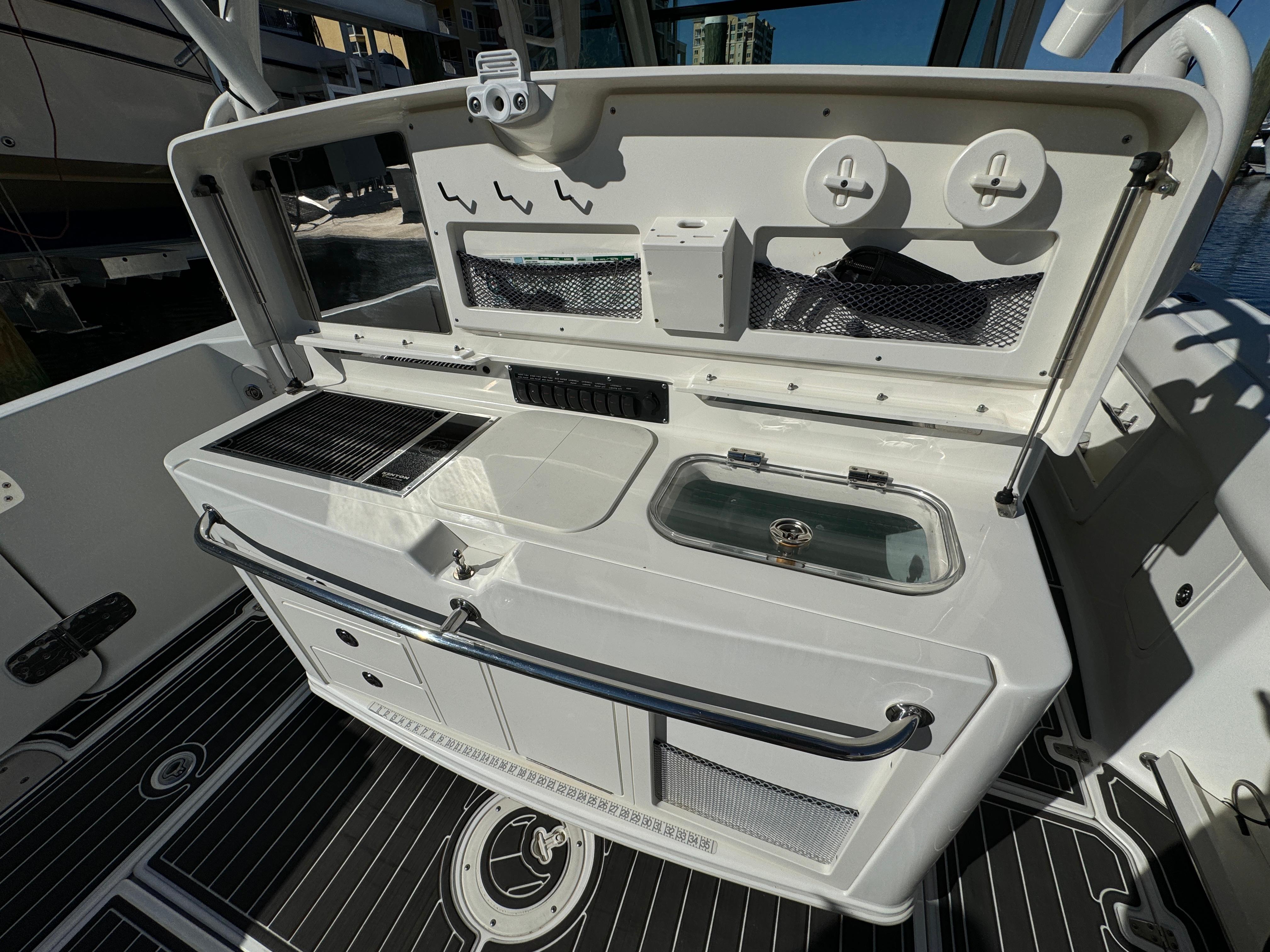 - Freshwater system with 60-gallon tank, sink in console, shower in console, sink at prep station, freshwater hot and cold transom shower, hot and cold dive door shower, anchor washdown and mid-ship outlet