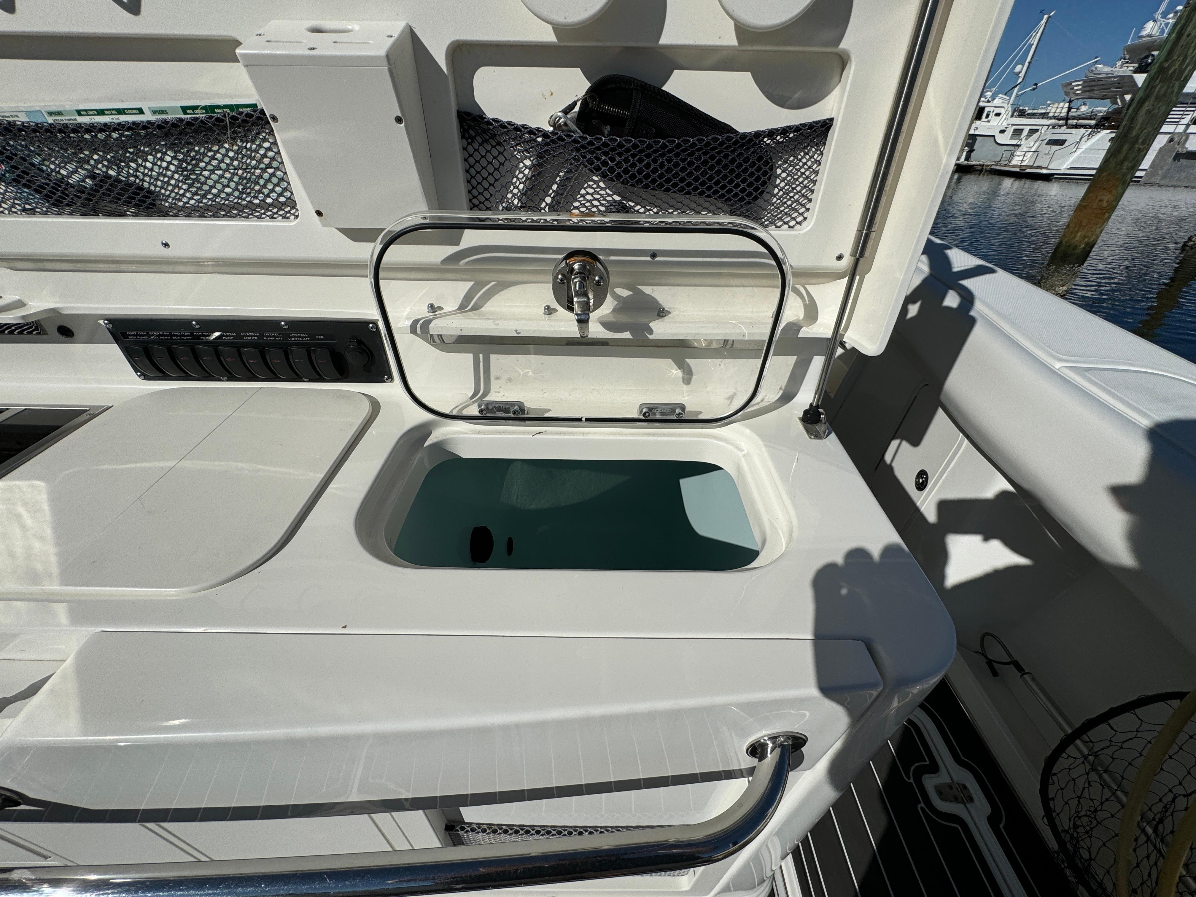- Pressurized aerated livewell (24-gallon) with clear top window and blue interior in aft port corner