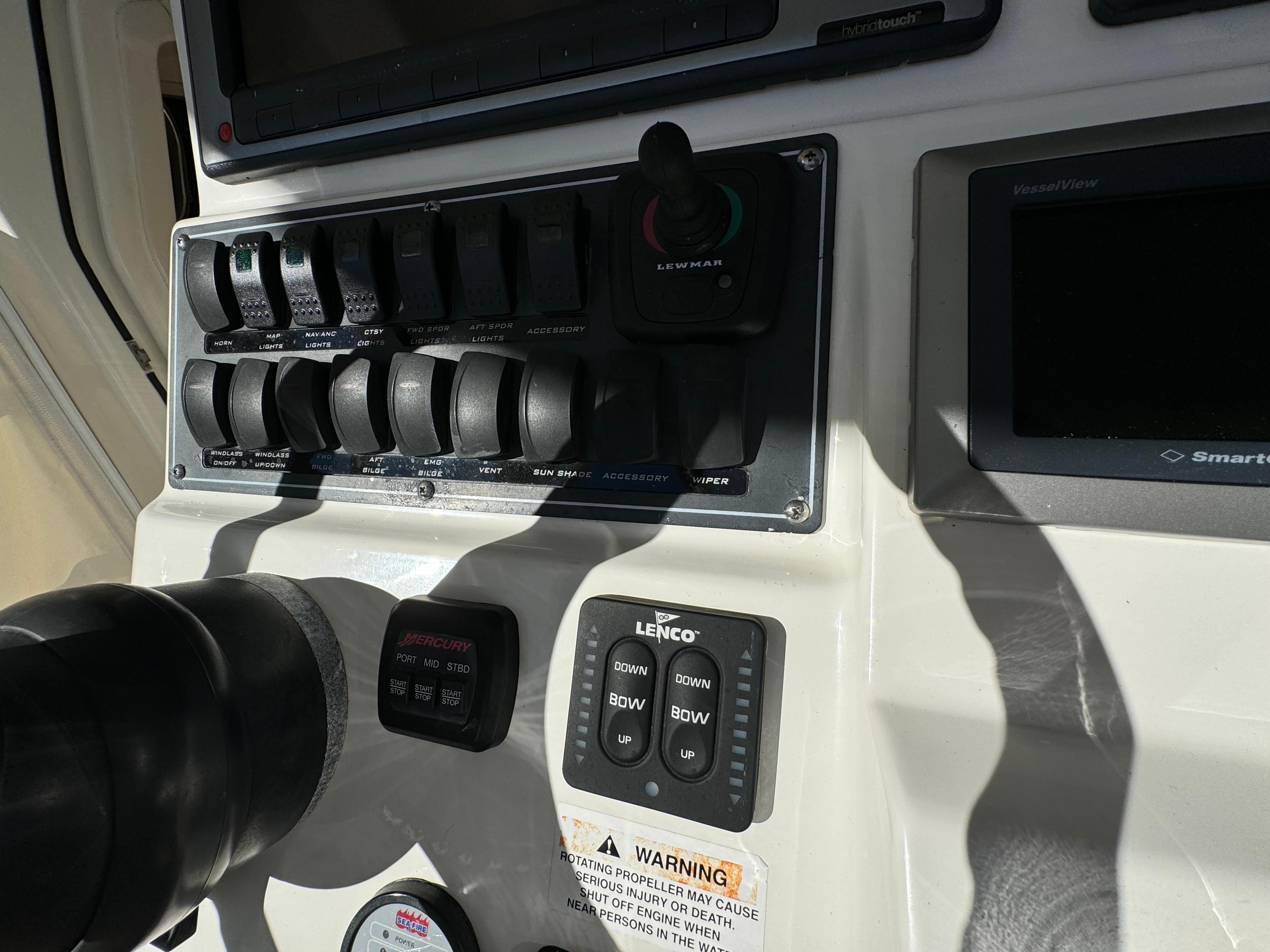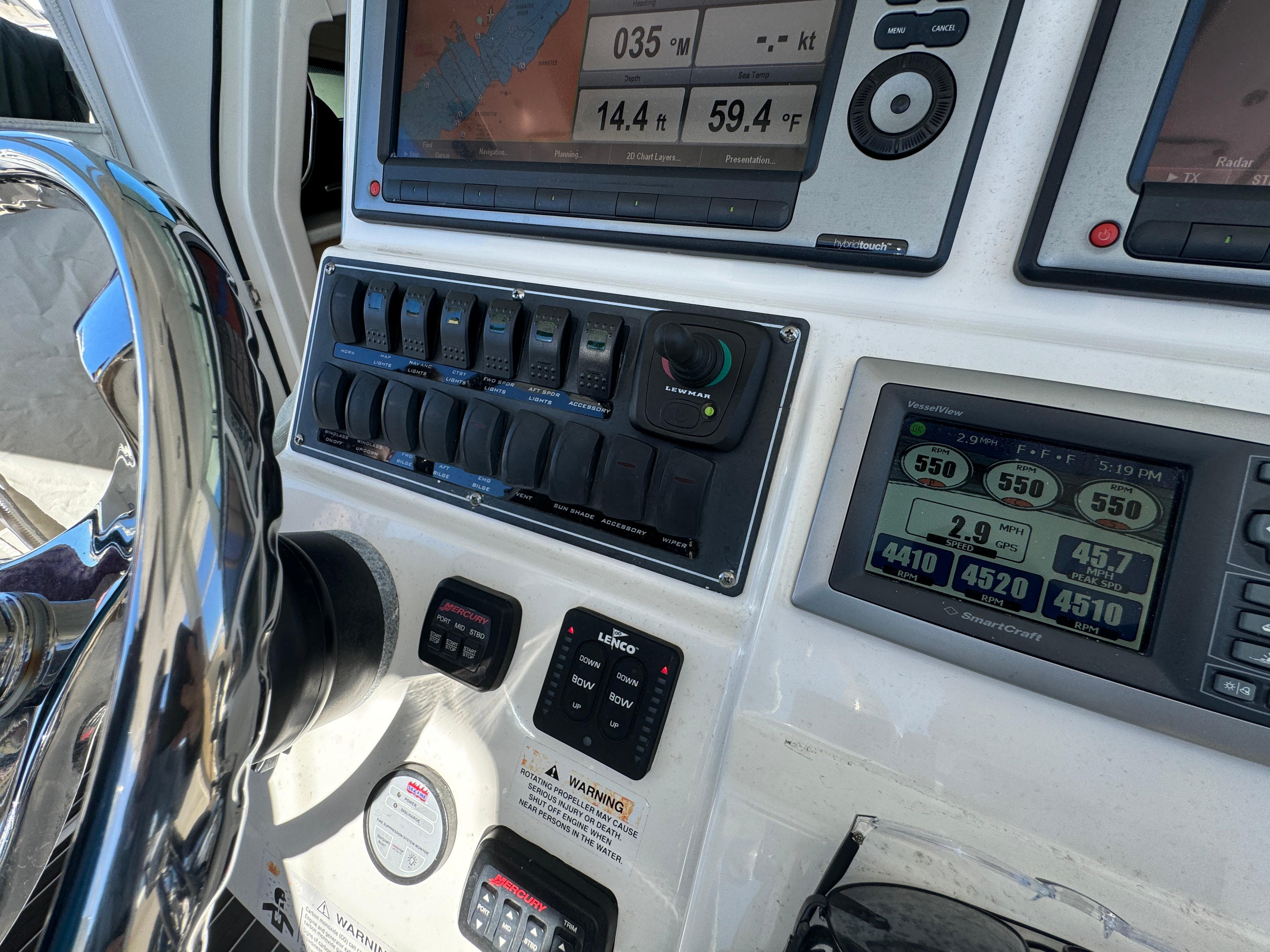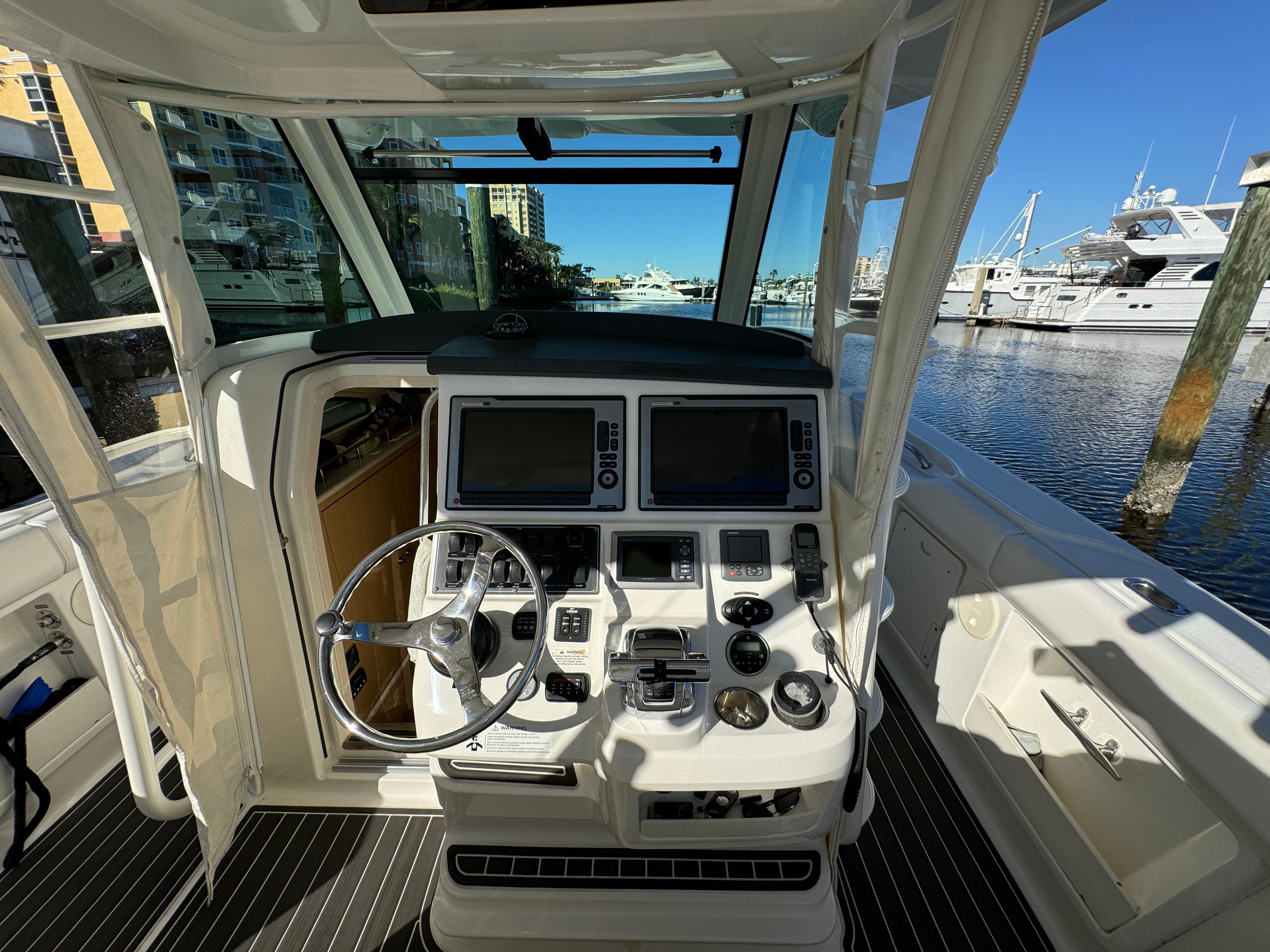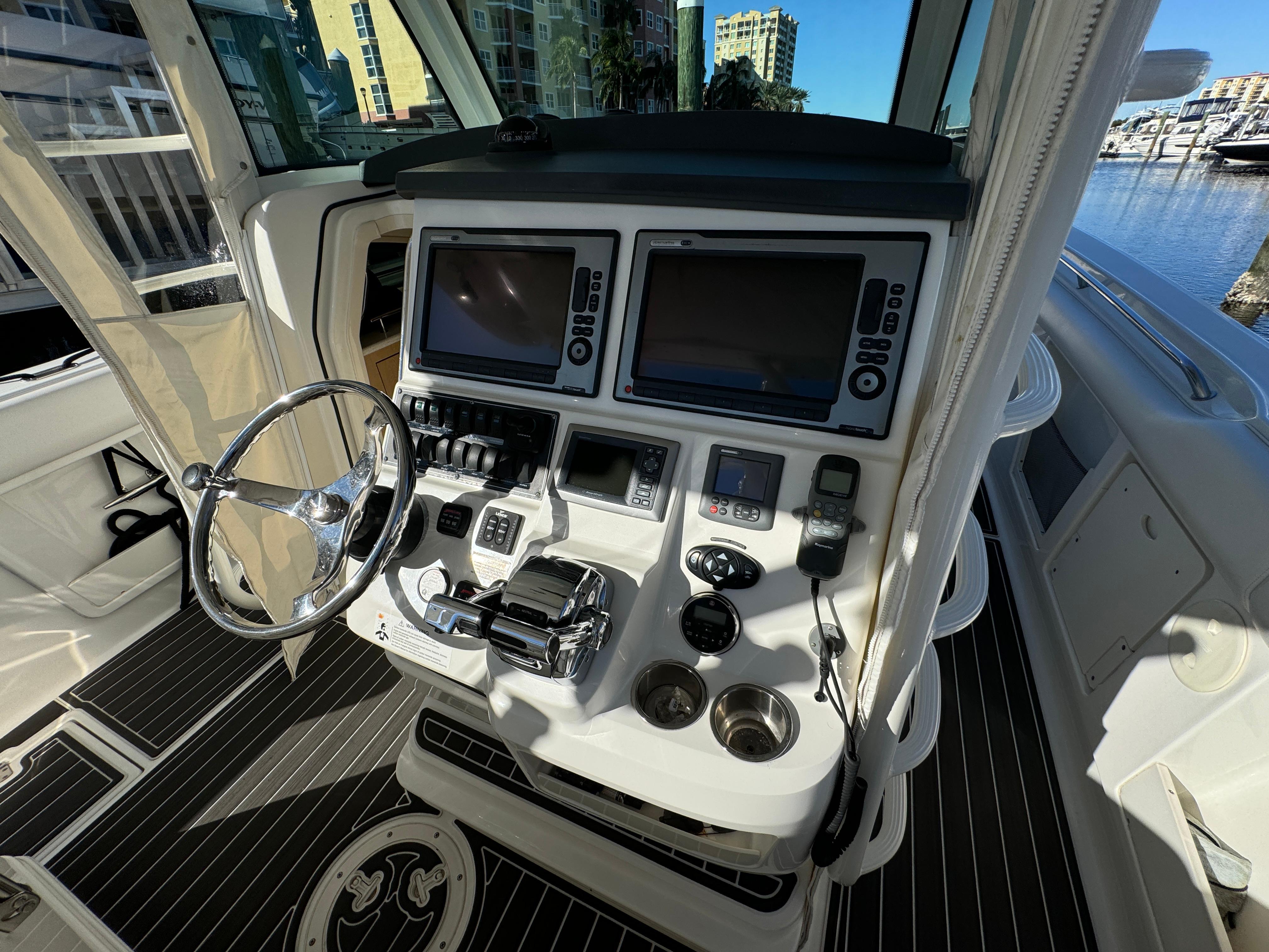- Custom helm and companion bolster style seats (3) with fold-down armrests (center seat electrically actuated)