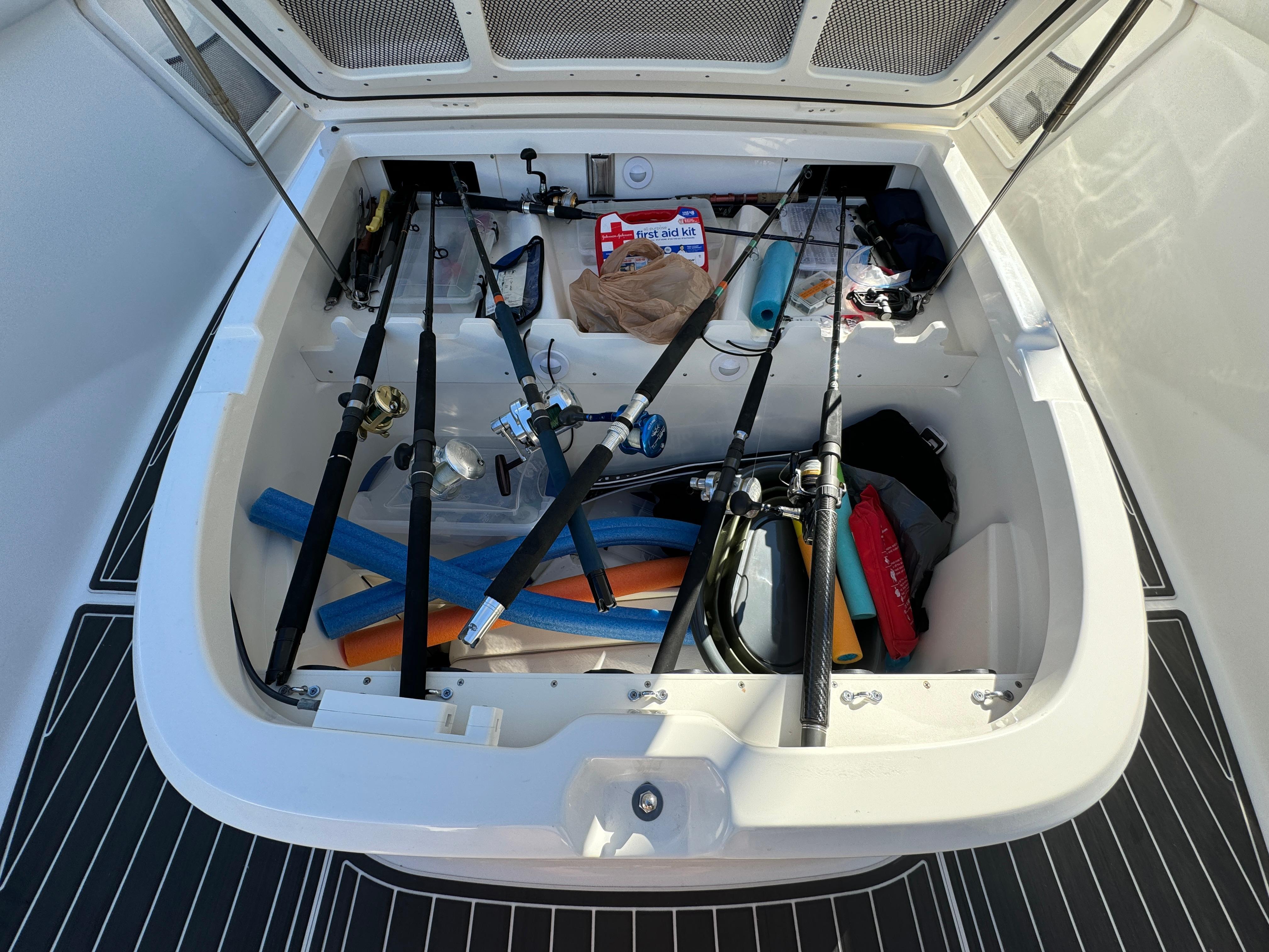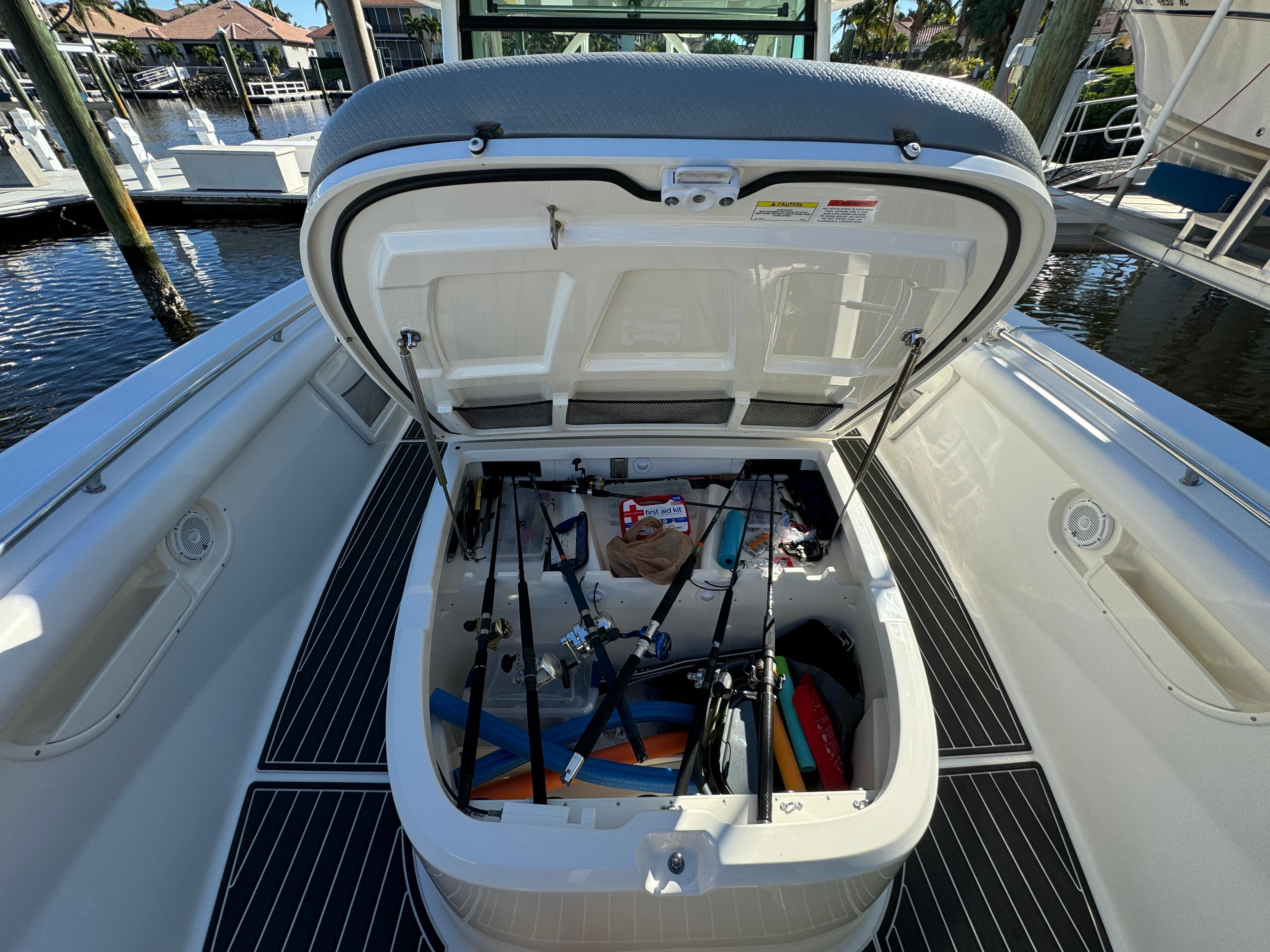 - Lockable console front storage: holds 6 rods, two 5-gallon buckets (included), one 36 qt cooler (included), miscellaneous gear and optional dive tank racks