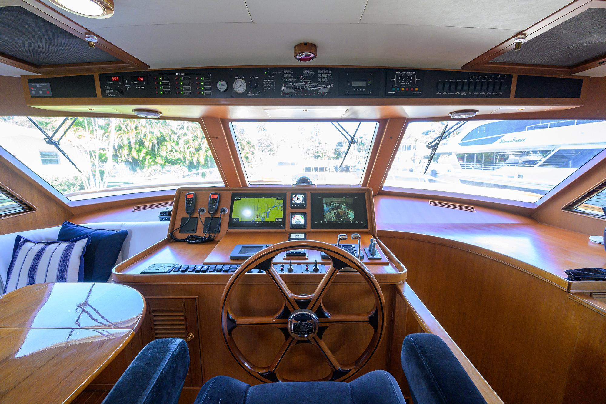 ElectronicsBandol has redundant electronics to ensure that, with any failure, there is a back-up system. The current owners enjoyed miles of trouble-free cruising with the assurance that the systems would keep them safe. Fuel levels are checked with a simple sight glass in the engine room. In the panel above the wheel are found the inverter monitoring system controls, the electronic breakers, and digital battery monitors. Bow and Stern thruster controls are at the helm and flybridge, The total height with radar mast folded is only 20'.
