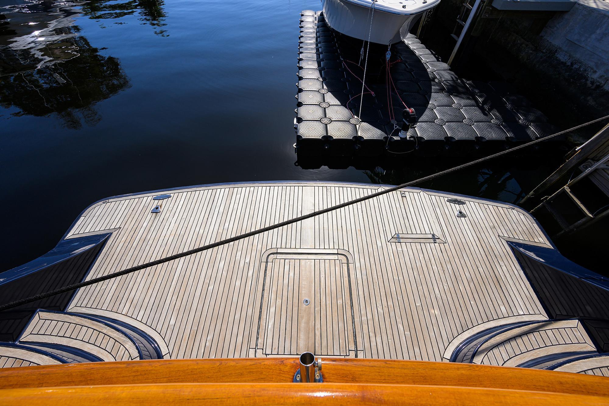 The upper and lower deck areas are clad in teak which is in good condition. Bandol is a very safe yacht with hand holds everywhere necessary, high bulwarks, wide side decks, beautiful teak cap rails, and secure access to the bow from the Portuguese bridge. There is a watertight transom door giving access to a lazarette technical and storage area and forward of that, to the crew cabin and then further forward to the engine room. Some other notable features include.