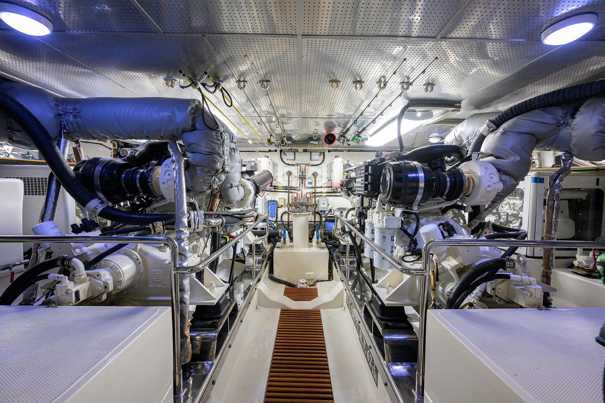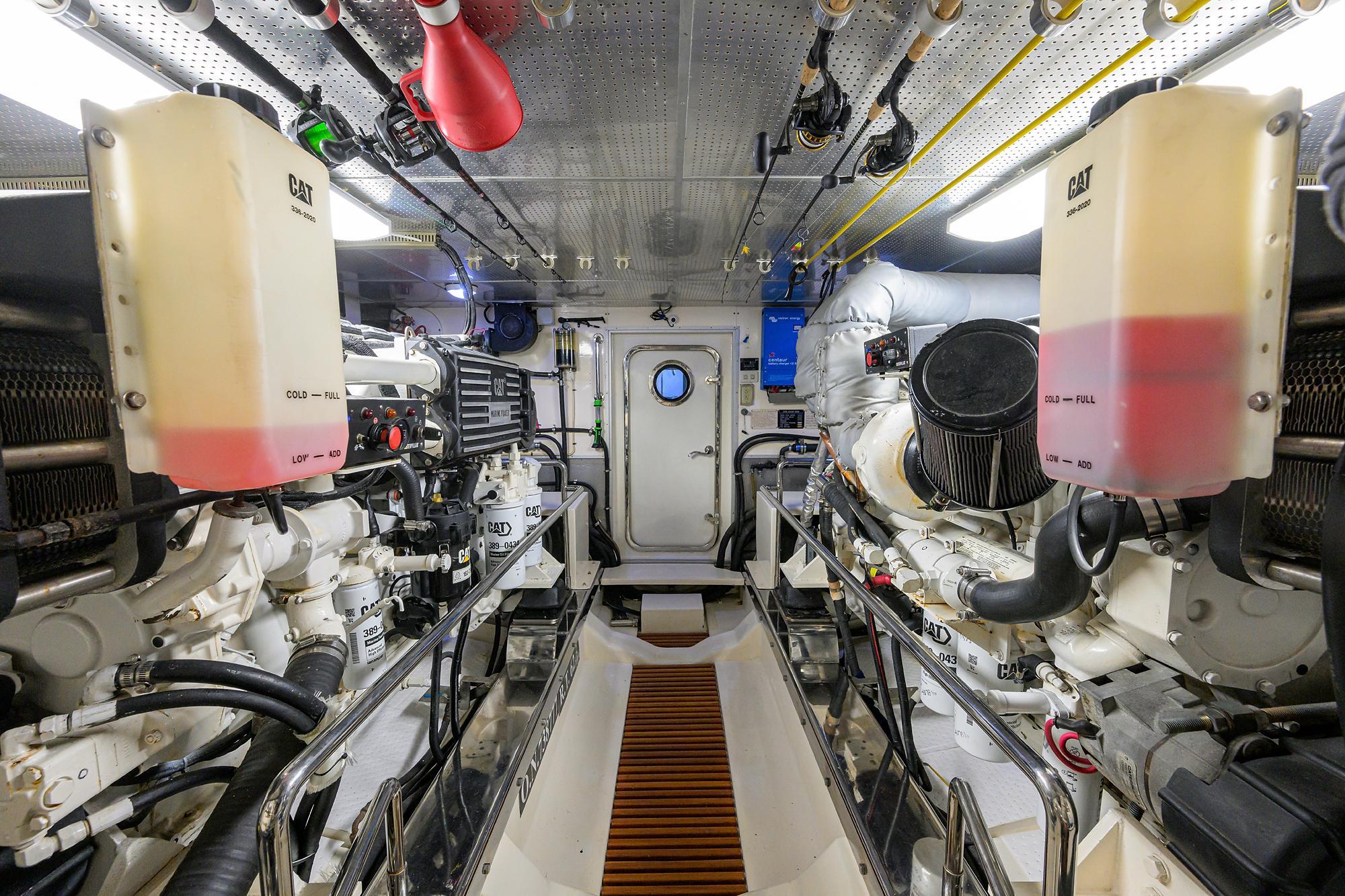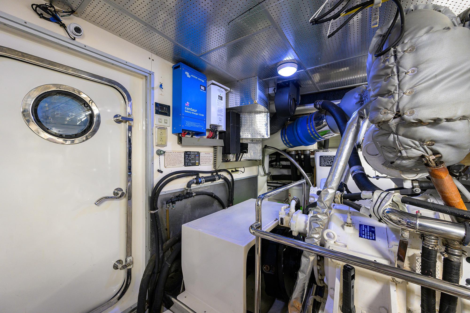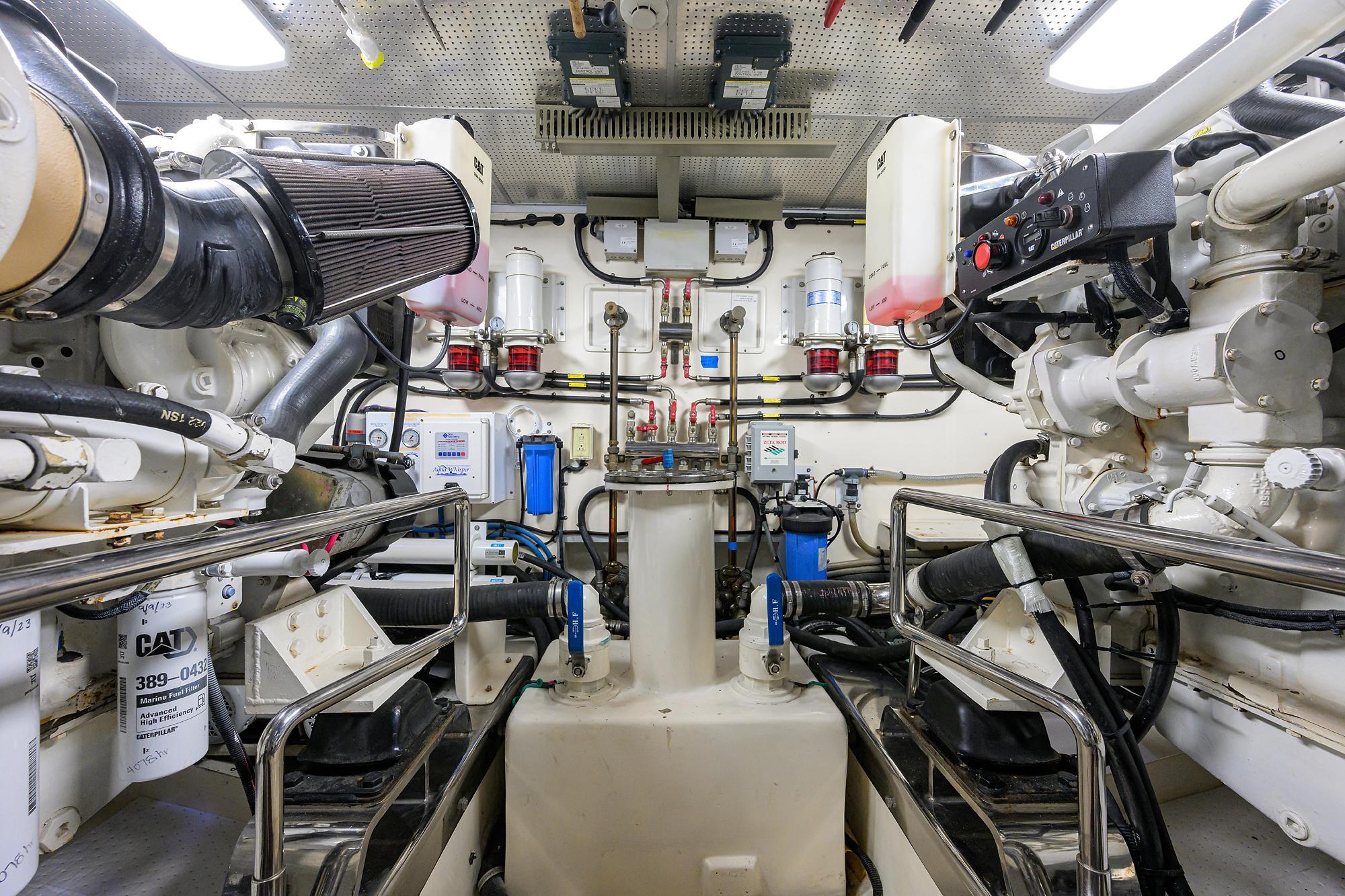 Engine RoomThe C-18 engines will power this vessel to cruise at speeds most motor yachts can only achieve with larger, heavier, and more costly to operate V-12 engines. This smaller package also provides you with a very spacious engine room. There are twin 25kW Northern Lights generators which are easy to service. The engine room is well lit and well-ventilated with 4 fans. There is a fire suppression system, fore and aft bilge pumps, with high water alarms.