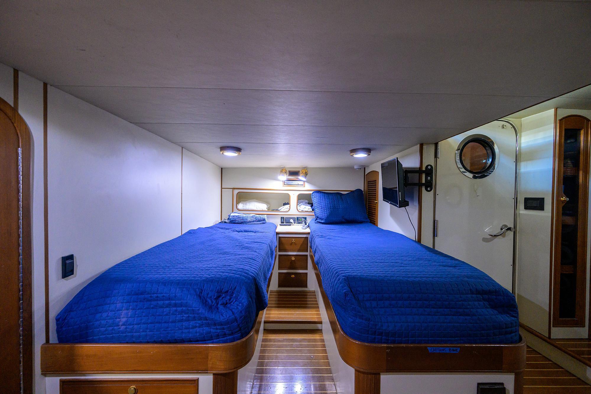 Starboard Bunk RoomThis stateroom is at the base of the curved stairway from the wheelhouse/galley level. The bunks are appropriately sized for adults with new mattresses in 2021. The room has a TV, large drawers, and a hanging locker. The guests in this stateroom can access the VIP bathroom from the hallway. There are two opening port lights.