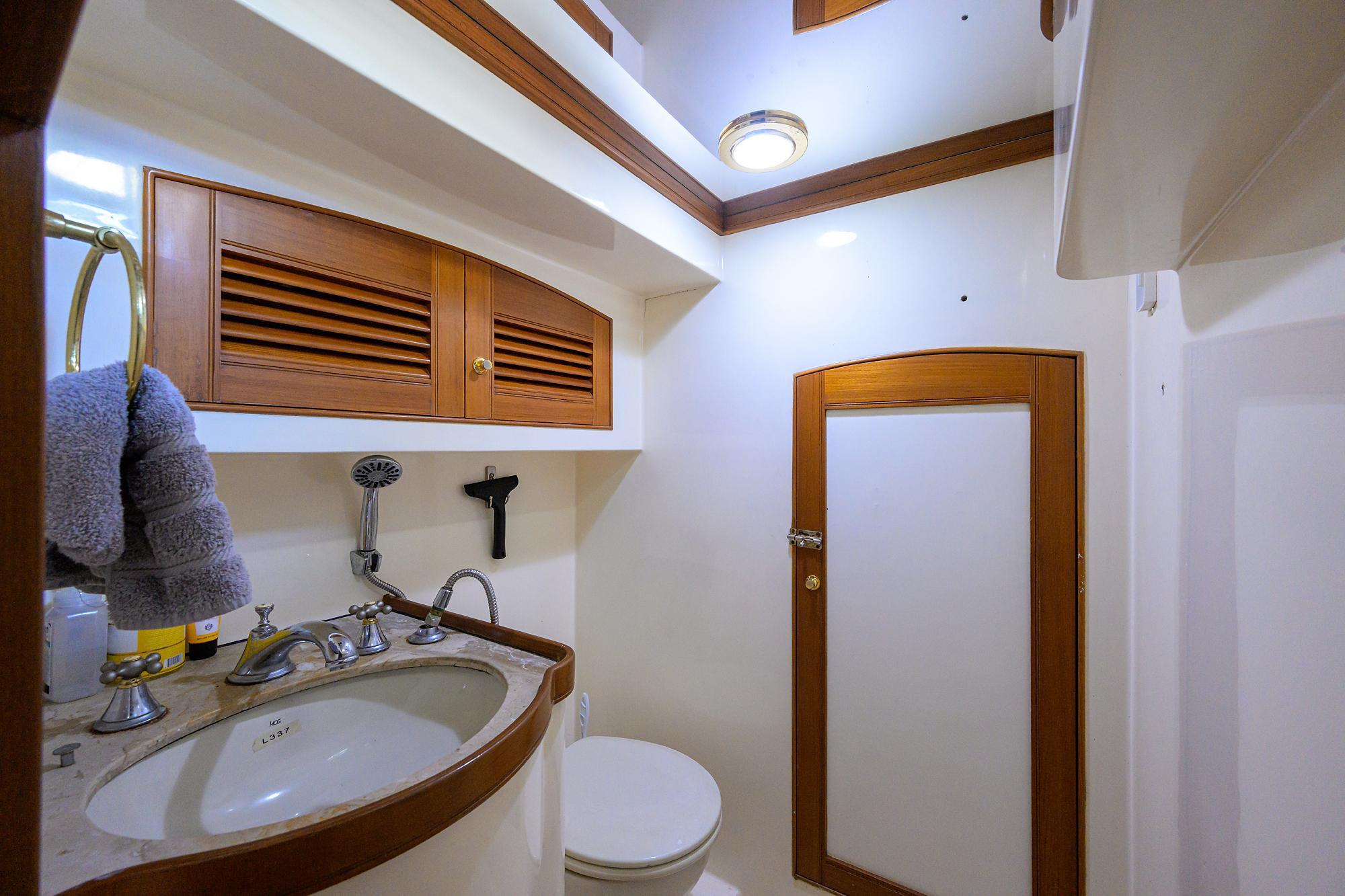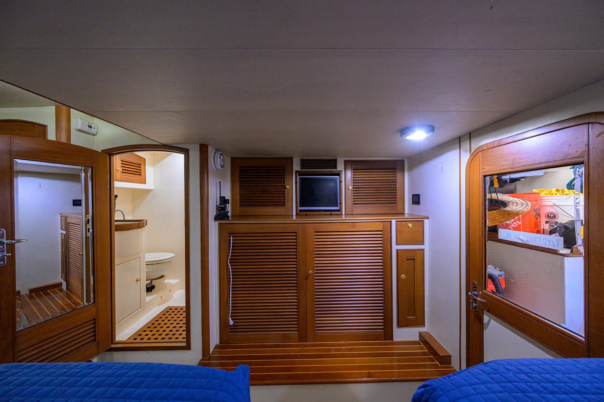 Port Guest StateroomThe port side guest stateroom has two very comfortable single berths with a built-in nightstand with drawers between them. The full-size head with separate shower has marble countertops with Grohe fixtures in the sink and shower. The stateroom is finished in satin teak. The mattresses were new in 2021. A flat screen TV is fitted to the bulkhead connected to DirecTV and stereo.