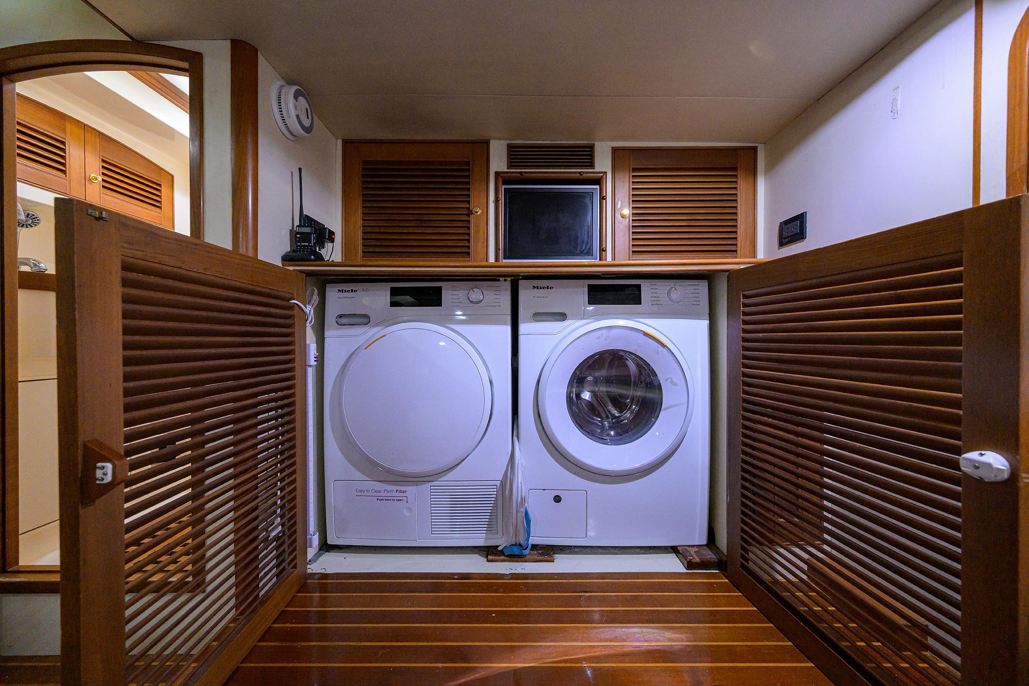 The crew cabin features two side-by-side bunks to comfortably accommodate 2. The crew cabin has its own head and shower. There is a microwave and refrigerator in the crew cabin. A new flat screen TV has been fitted on a flexible mount. The crew cabin can be accessed from the aft port corner of the main salon down a short staircase or via the large opening watertight transom door. A full-size washer & dryer is fitted in the crew cabin.