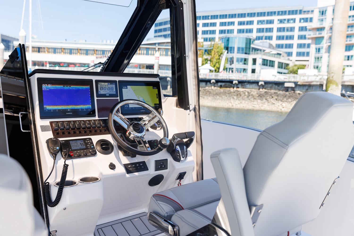 At the helm, dual Garmin 8612 chartplotters provide a fully customizable display for complete confidence. Integrated bow and stern cameras, electronic throttle controls, docking lights, available joystick control, and a bow thruster make docking easier than ever. Additionally, the helm sports a Yamaha engine display with fuel flow, autopilot and tilt steering wheel.