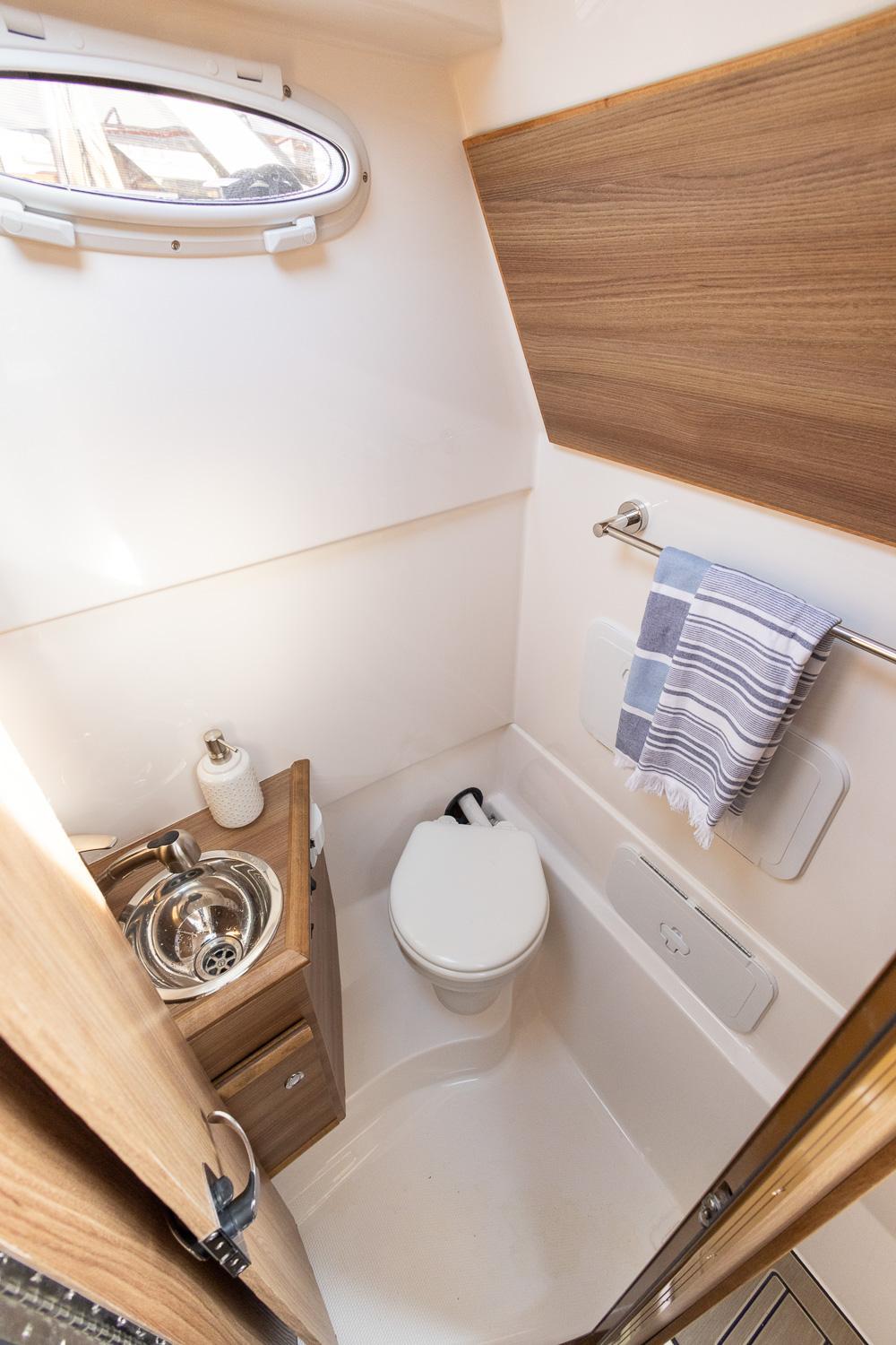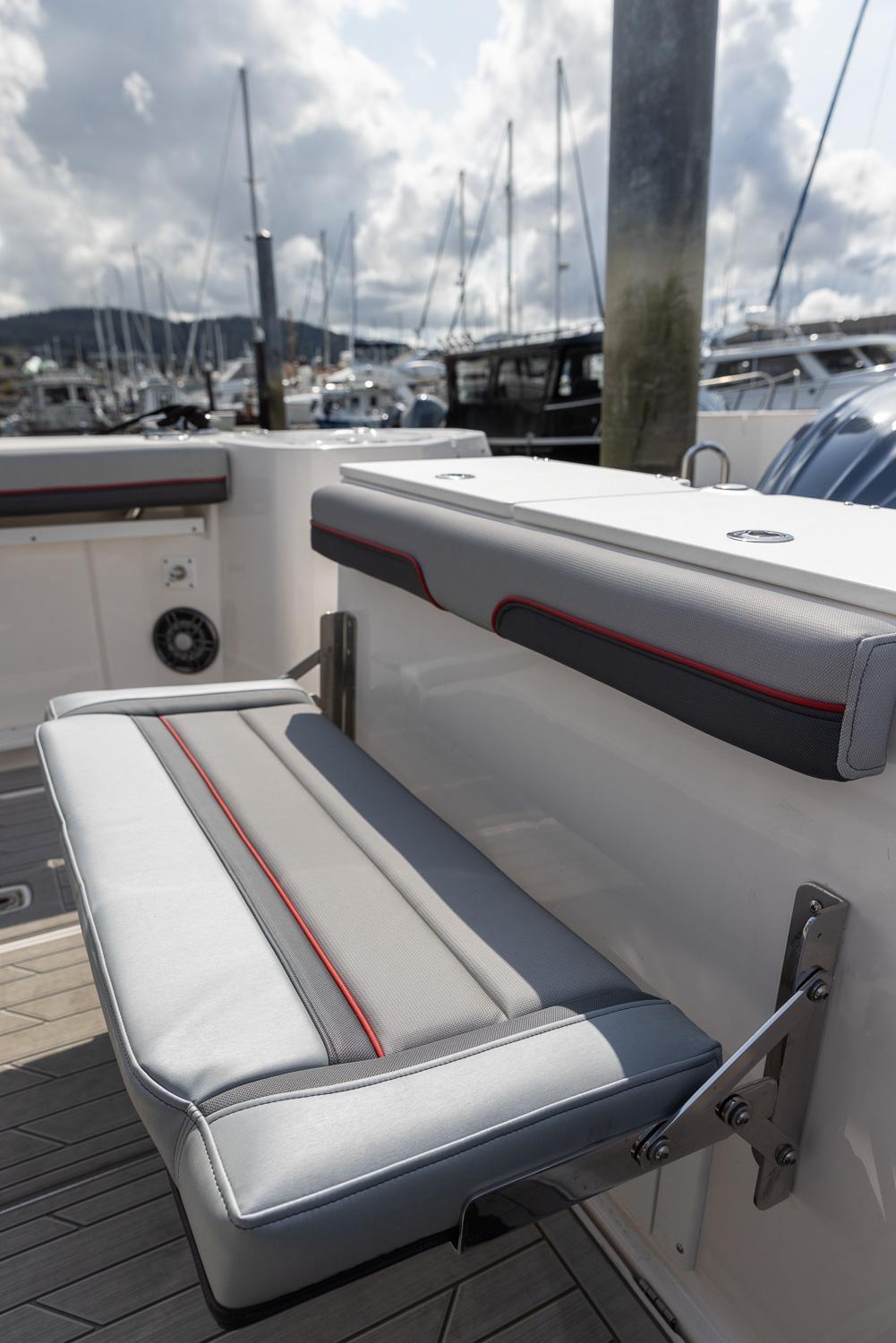 The cabin is a comfortable escape from the elements. Air conditioning and reverse cycle heating allow you to keep the interior at the perfect temperature. The large V-berth converts to lounge seating for additional entertaining space. In the cabin you’ll also find a Bluetooth equipped, multi-zone Fusion stereo system, refrigerator/freezer, LCD flatscreen, 110v outlets, rod storage and opening portlights. From the main cabin, you’ll find a fully enclosed head with an electric flush toilet and shower.