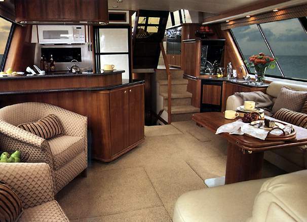 The Bayliner 4788 Pilot House Motoryacht combines comfort, an elegant line, and luxury features. The large bridge deck, with its fully-appointed helm and generous lounge seating, allows captain and guests to enjoy the view together. The 4788 features a wide lounge seat sculpted into the foredeck for sunning, a large transom door for easy access to the broad boarding platform, and generous side decks with grab rails for extra security. The master suite includes a large double berth, twin hanging lockers, a separate dressing room with settee that converts to upper and lower bunks, and a private bath with large vanity and enclosed tub. The midship stateroom offers another a double berth and across the companionway is a second bath complete with shower. The 4788 features a fully equipped electric galley, large salon windows, and unencumbered movement throughout the vessel. Standard equipment includes Raytheon radar, AutoHelm autopilot, electric anchor windlass, and davit with electric winch.