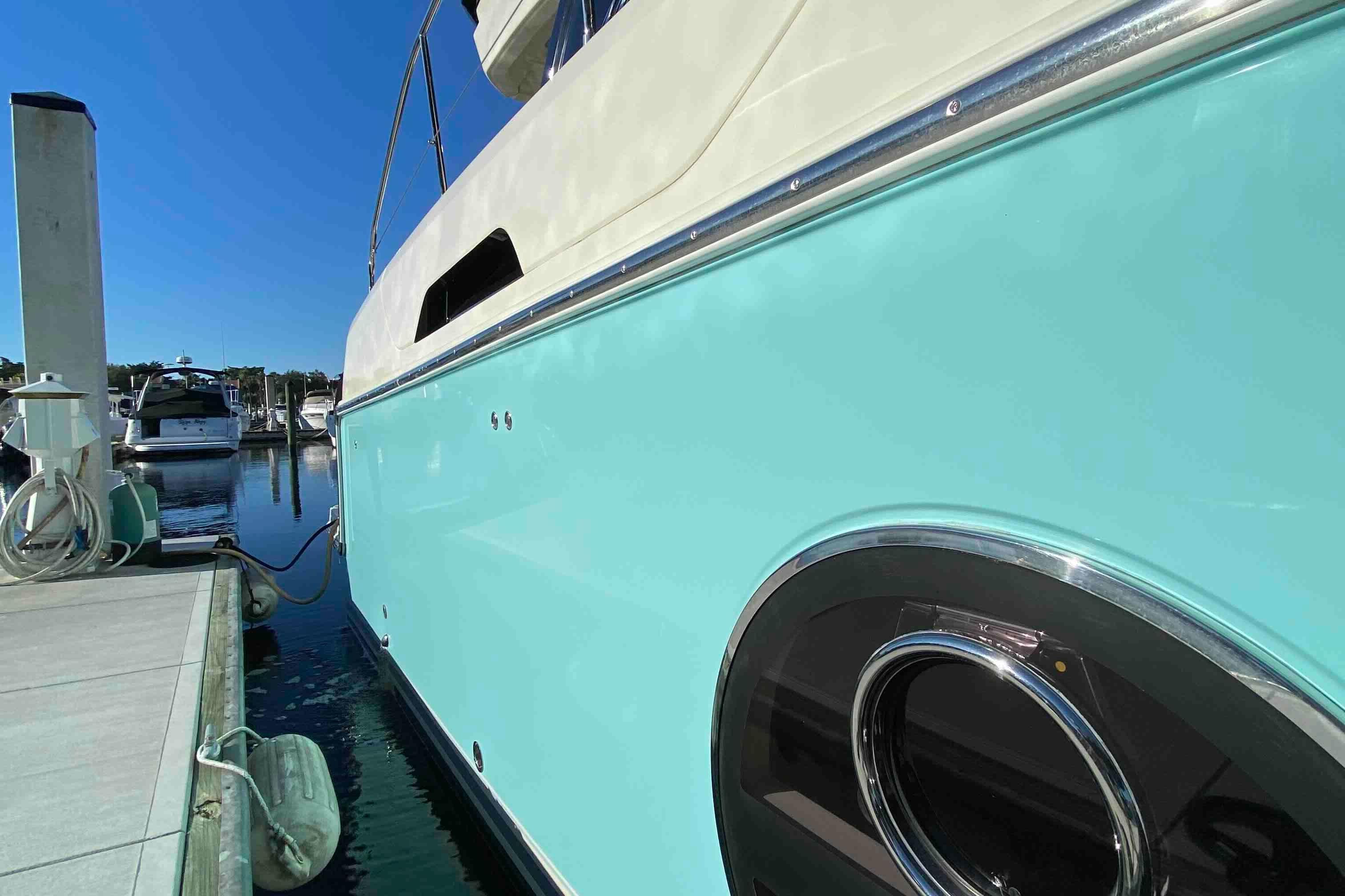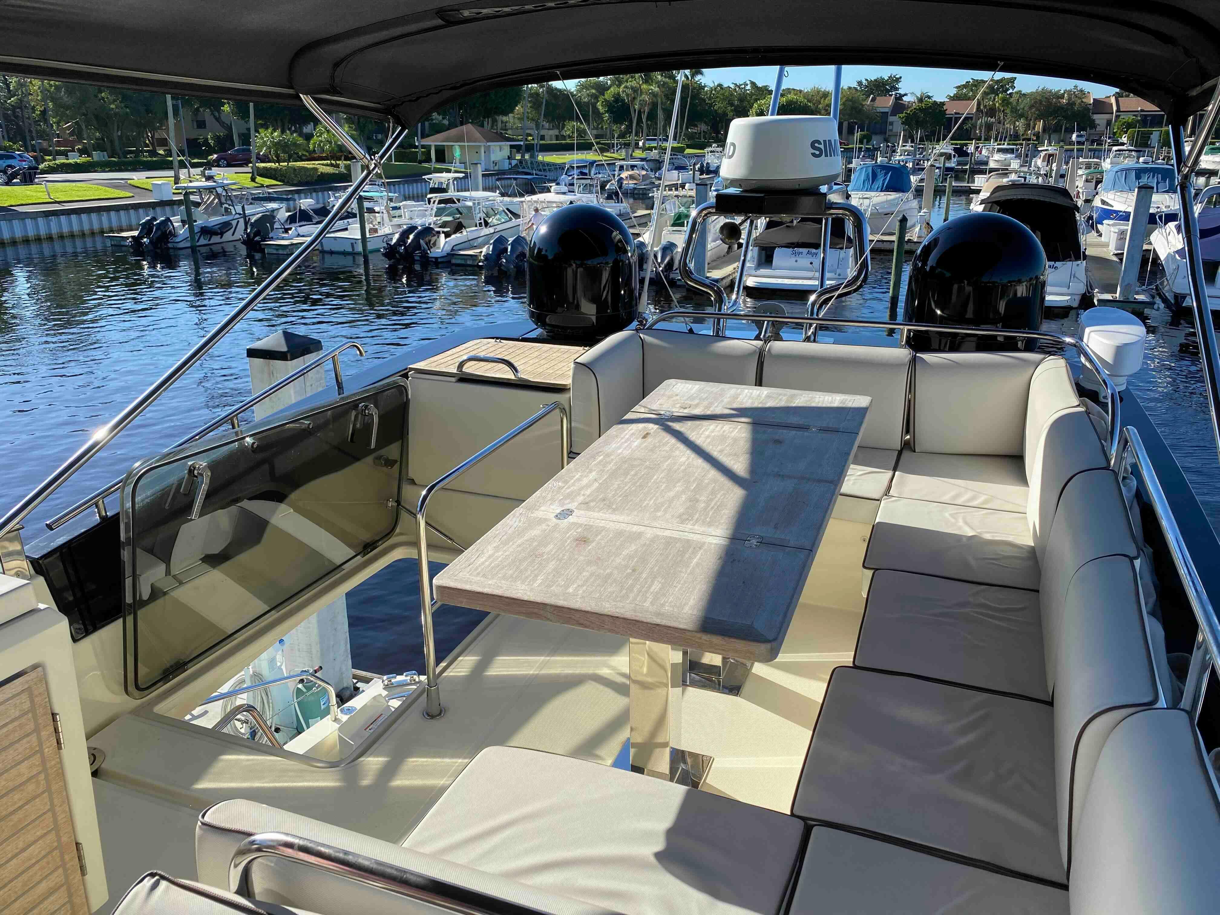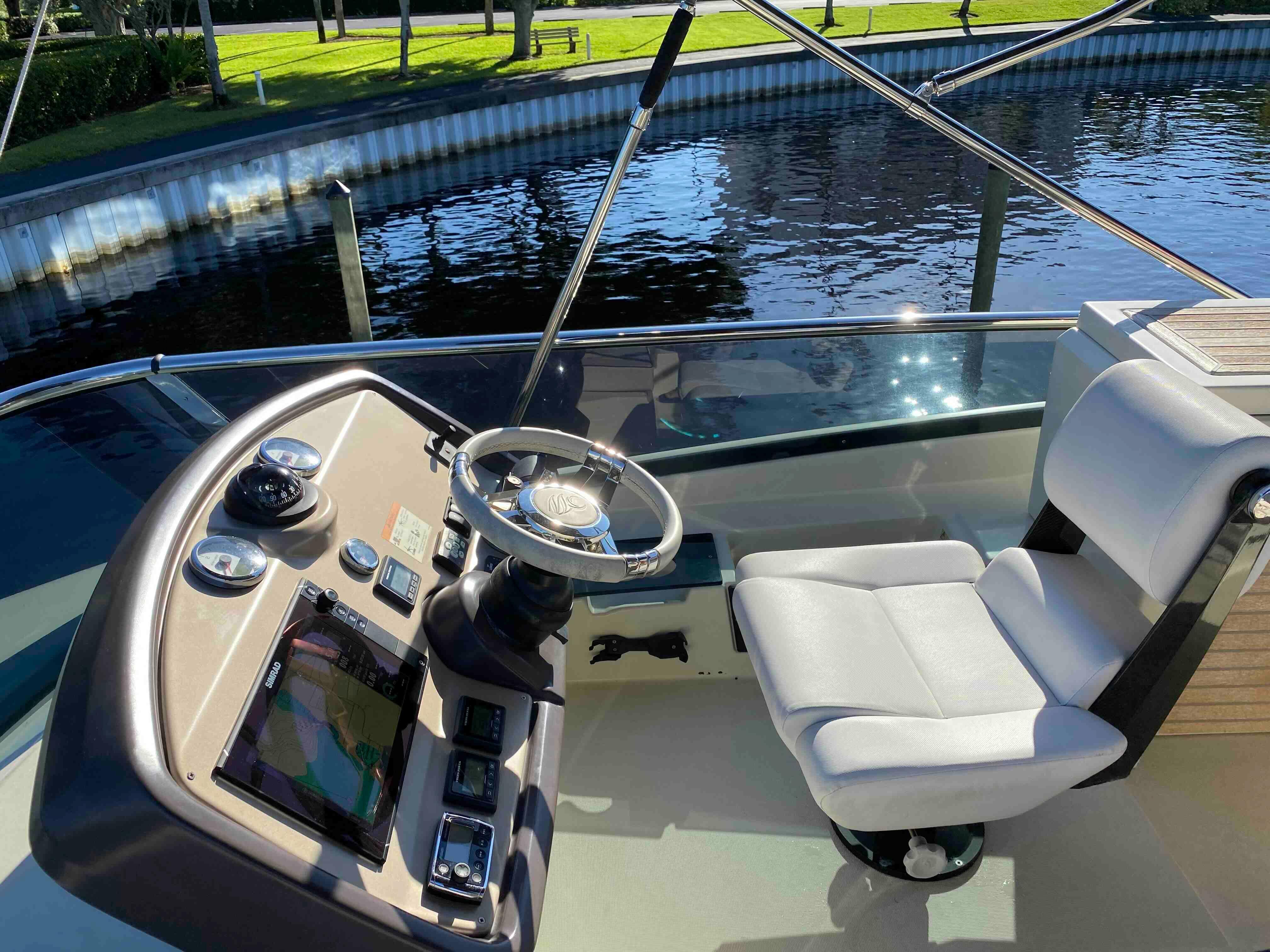 IPS pods have had full service, including having her clutch packs replaced 2/24 -- and is back from her annual yard period, where she got new bottom paint (11/24), full wax and detail, and her teak professionally cleaned and treated, among other services ...she is ready for her next 10 years of ownership... Three joystick docking stations, and the highly sought after (and expensive!) Dynamic Positioning System. This is a $30,000 upgrade from Volvo! And best of all? No deferred maintenance issues... Heat Exchangers also fully serviced by Volvo 1/2024! The engines, pods, and systems are all up to date on their service intervals, and ready for her new owner!You board by the swim platform and go up three steps to the cockpit where you find genuine teak strip decking, useful storage space under the transom bench seat that can easily seat three or four - complete with NEW cockpit upholstery as of 1/2024, and most of the cockpit is underneath the flying bridge overhang - offering shade and shelter. PLUS an absolutely awesome built in electric grill on the swim platform area that allows for outdoor grilling anytime!Side decks are wide and the hand railings are well-positioned when you want to head up to the bow where there are big reclining sun lounges, drink holders, the anchor and windlass as well as a teak bow seat that offers a memorable place to ride!In a boat filled with exciting features, the flying bridge is a standout. A series of teak steps lead through a hatch to the flying bridge which is equipped with an upper helm station to starboard, a large companion seating area and with cushions that allow full stretch-out sun tanning for at least two.Also on the flying bridge is what will probably be your favorite dining area... This has comfortable seating for six around a fold-out teak table where you can enjoy both the breezes and the great view. There’s a top loading refrigerator to keep your drinks cold and a great service/wet bar area for entertaining!The upper helm station is where most people will want to drive and our boat is fully equipped with engine instrumentation and navigation equipment here, but so that inclement weather doesn’t slow you down, there’s also a full lower helm that we will describe in a moment.At the transom is a Glendinning Cablemaster for pulling in the shore power cords, covered boarding ladder, and at the trailing edge of the bridge overhang, a flip down cover reveals an electric sunshade to extend further out over the cockpit. Very nice!The large swim platform is hydraulically operated and has dinghy chocks rated for up to 700 pounds already built into it that can also be configured to hold a Jet Ski!The Monte Carlo 4 cockpit has a flat and uninterrupted floor right to the mirrored cabin doors and into the saloon without even a track to trip over. Love that feature, and you will too, along with her full beam Master Stateroom with ensuite head, and her voluminous VIP stateroom forward with a second full head!She has completed the Great Loop, where her owner's used her primarily at trawler speeds, so the bulk of her engine hours were at 1,000 rpm's or less. Her new owner will be able to buy with confidence, and start cruising NOW!