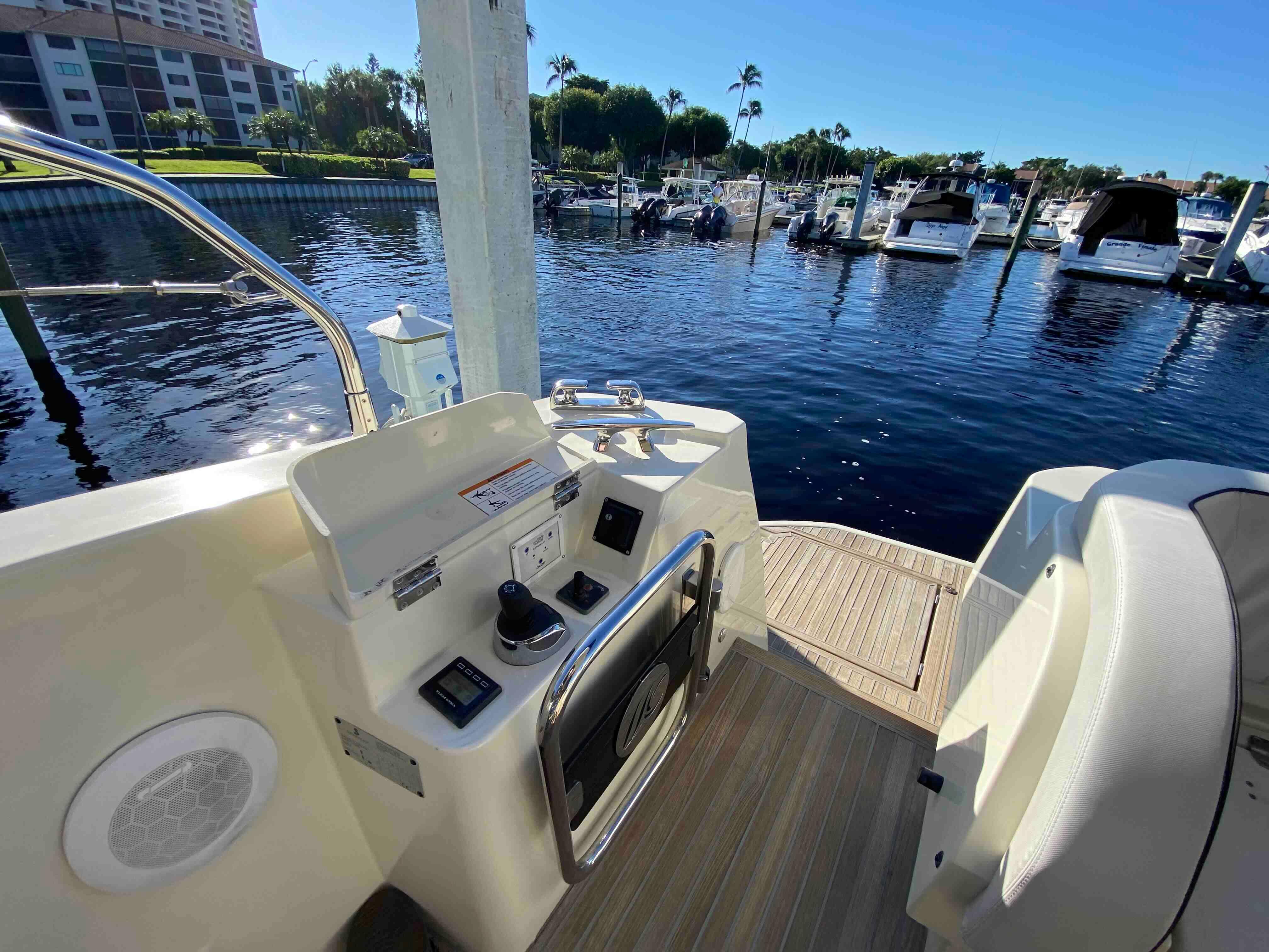 • Steering console with: Steering compass - Steering wheel - Electrical engine controls - Tiller angle indicator - Rev counter - Fuel gauge - 12 V socket - IPS joystick