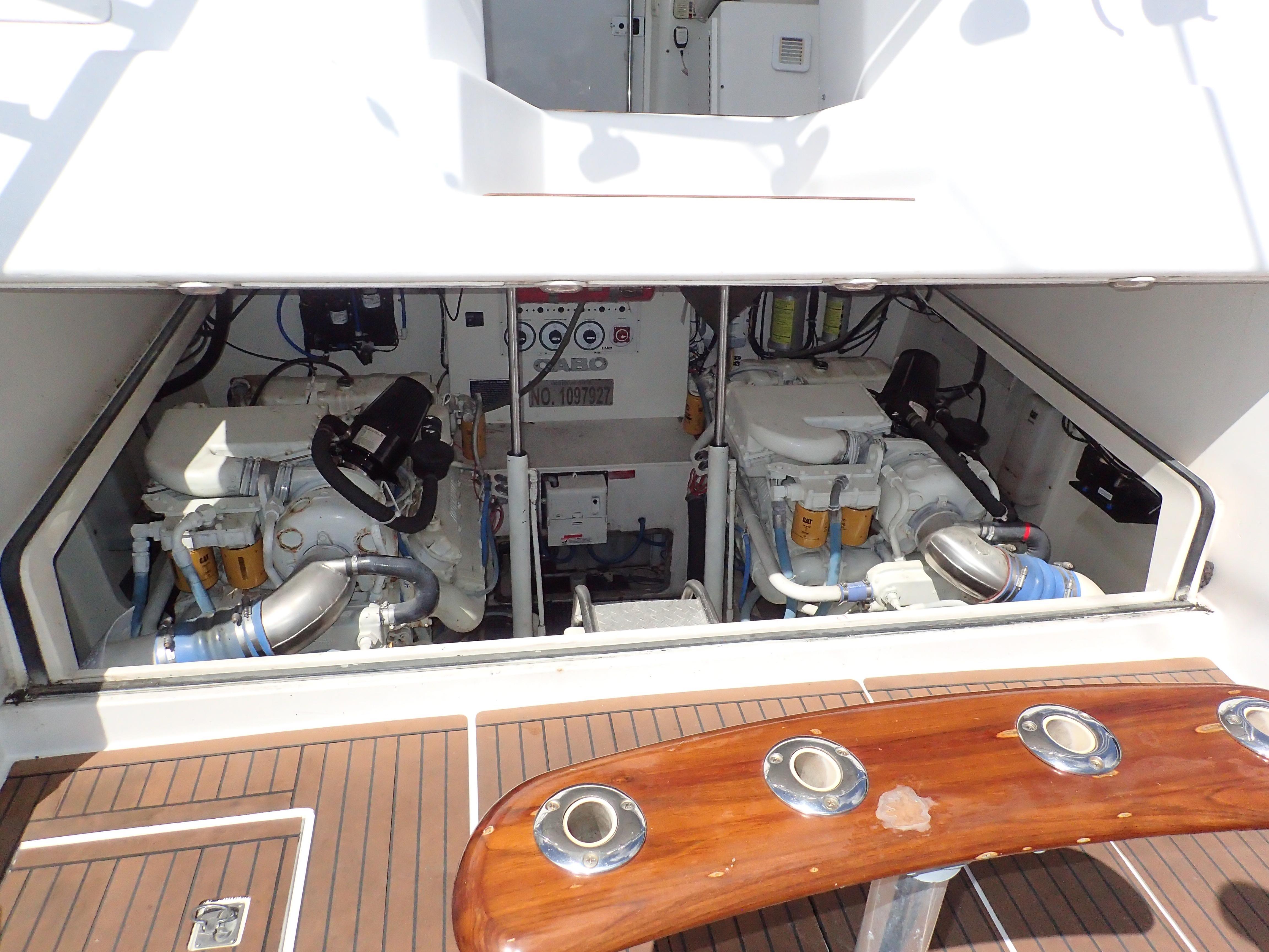 Equipment ListCabo 35 Express Specifications - Standard Equipment Hull - Molded fiberglass construction using premium vinylester resin and biaxial stitched fabric reinforcement - Solid fiberglass bottom construction - Core construction from upper chine to sheer - Premium quality molded-in white gelcoat finish - Boot striping - Bottom paint complete preparation - 2 coats epoxy, 2 coats antifouling paint, black standard - Stainless steel rub strip on face of white high-density rub rail - Trim tabs, fully recessed Deck - Molded fiberglass using polyester resin, biaxial stitched fabric reinforcements and core construction - Premium quality molded-in white gelcoat finish - Molded-in non-skid surface - Bow pulpit, integral molded fiberglass - Recessed custom stainless steel anchor roller assembly - Custom deck rails, choice of aluminum or polished stainless steel - Bow cleats, 12-inch stainless steel - Bow chocks, 6-inch stainless steel - Springline cleats, 12-inch stainless steel - Stern cleats, 12-inch stainless steel - Stern hawse pipes, stainless steel - Windshield, heavy duty welded aluminum, finished in a white polyurethane paint; includes weather return on top rail and electrically actuated center vent - Windshield wipers (3), self-parking with heavy duty pantograph arms - Windshield washers, port and starboard. - Windlass, heavy duty electric 12V, for rope and chain; remote from bridge with deck switches Cockpit - Aluminum reinforcing plate installed for mounting fighting chair - Icebox, starboard side fitted with custom gasketed lid, gas spring actuator, full-length stainless steel piano hinge and custom latch - Bait prep center, portside, includes sink, rigging board, tackle storage; fitted with custom lid, gas spring actuator, stainless piano hinge and custom latch - Lighting under gunwales and helm deck overhang - Fish boxes, large capacity, insulated, with macerator pump-out system - Gunwale padding, high-density foam, white vinyl covered - Hatches, lazarette and fish boxes, heavy duty with O-ring seals, drains, gutters and stainless steel piano hinges - Rod gaff racks, port and starboard - Rod holders (5) - Self-bailing cockpit scuppers - Step - storage boxes, port and starboard - Transom door with top gate, extreme duty polished stainless hardware - Washdown, freshwater, portside - Washdown, salt water with hose and pistol grip nozzle, starboard side Helm Deck - Molded fiberglass helm deck, hydraulically lifted with cockpit control unit - Tackle center with 6 drawers to store and organize gear - Engine access hatch with gas spring - Helm console, integrally molded - Helm seat, bench style, adjustable - Safety cabinet with first aid kit and fire extinguisher - Storage cabinet at helm - L-shaped lounge portside with rod storage below - Sliding companionway door, smoked acrylic panel - Custom outdoor helm deck carpet Console - Compass with light, flush-mounted - Complete custom engine instrument panel with audible warning system - Custom switch panel - Dual-lever engine controls - Fire and bilge water level alarms, audible - Stainless steel helm wheel - Canvas console cover Mechanical - Metal braided fire-retardant fuel lines - Bilge, white gelcoated finish - Bilge pumps, three 12V automatic - manual - Emergency bilge suction valve on main engine - Bonding system with transom zinc plate - Double hose clamps on all hose fittings where possible, stainless steel - Double constant torque stainless steel clamps on engine exhaust hoses - Engine alarm system - Engine hour meters (2) - Engine room sound insulation, high-density barrier - foam - Fire extinguishing system, automatic - Freshwater cooling on main engines - Fuel filters with water separators on main engines and optional generator - High water bilge alarm - Holding tank, 15 gallon polyethylene with gauge, macerator, and dockside discharge - Water heater, stainless steel, 11 gallon, 120V - Hydraulic helm deck lift system, heavy duty marine grade - Hydraulic engine controls (Hynautic) - Mufflers, fiberglass with large backwash surge chambers - Propeller shafts, high-strength stainless steel, 1.75 inch diameter, double taper couplers - Propellers, 3-blade Nibral - Rudders, high-strength bronze - Stuffing boxes, dripless lip seal type - Seacocks, UL approved for marine application, bronze, fitted on all through-hulls below waterline - Bronze high-speed water intake scoops with integral seawater strainers Electrical - 5 kW freshwater-cooled diesel generator with seawater strainer, remote start and gauge panel, water muffler, safety shutdown systems - Custom AC electrical distribution panel with line voltage and load meters, reverse polarity light and main breakers that trip with reverse polarity - Custom DC electrical distribution panel with battery voltage and load meters - Circuit breaker protection throughout - Battery paralleling switch, vapor-proof - Battery on - off switches, vapor-proof - Batteries (4), heavy duty 30 AH - Bonded electrical system - Converter - battery charger, 40 amp automatic - Engine room lights, 12V halogen - Horn, supplied uninstalled - Navigation lights, International, shipped uninstalled for future mounting on arch, hardtop or tower - Two 50-foot shore cords, 30 amp shorepower, located in starboard cockpit step - storage box Main Cabin - Access hatch to bilge - Design interiors, high-quality selection available - Lighting - recessed halogen (4) - L-shaped lounge converts to upper and lower sleeping berths - Interior teak superbly joined and finished in satin varnish - Three opening ports - Positive latches used on cabinet doors and drawers - Removable deep pile carpet - Selection of fine quality fabrics and coverings throughout - Two skylights, fixed - 110 volt duplex outlet, GFI protected - Air conditioning - heat including extra shorepower; 10,000 BTU capacity Galley - Cook top, one-burner electric, recessed with Corian cover - Corian countertop with custom Corian sea rails - Countertop lighting - rece