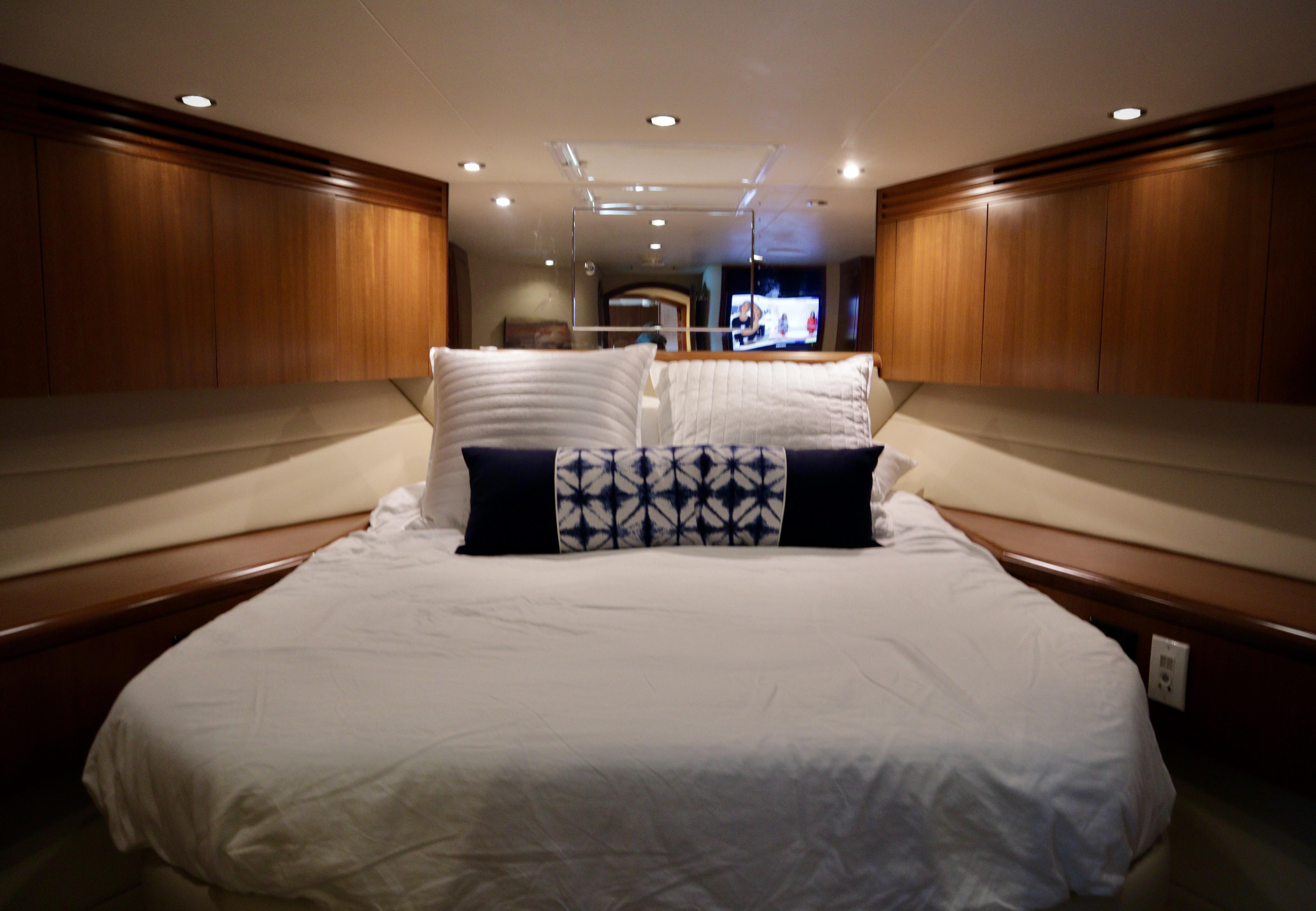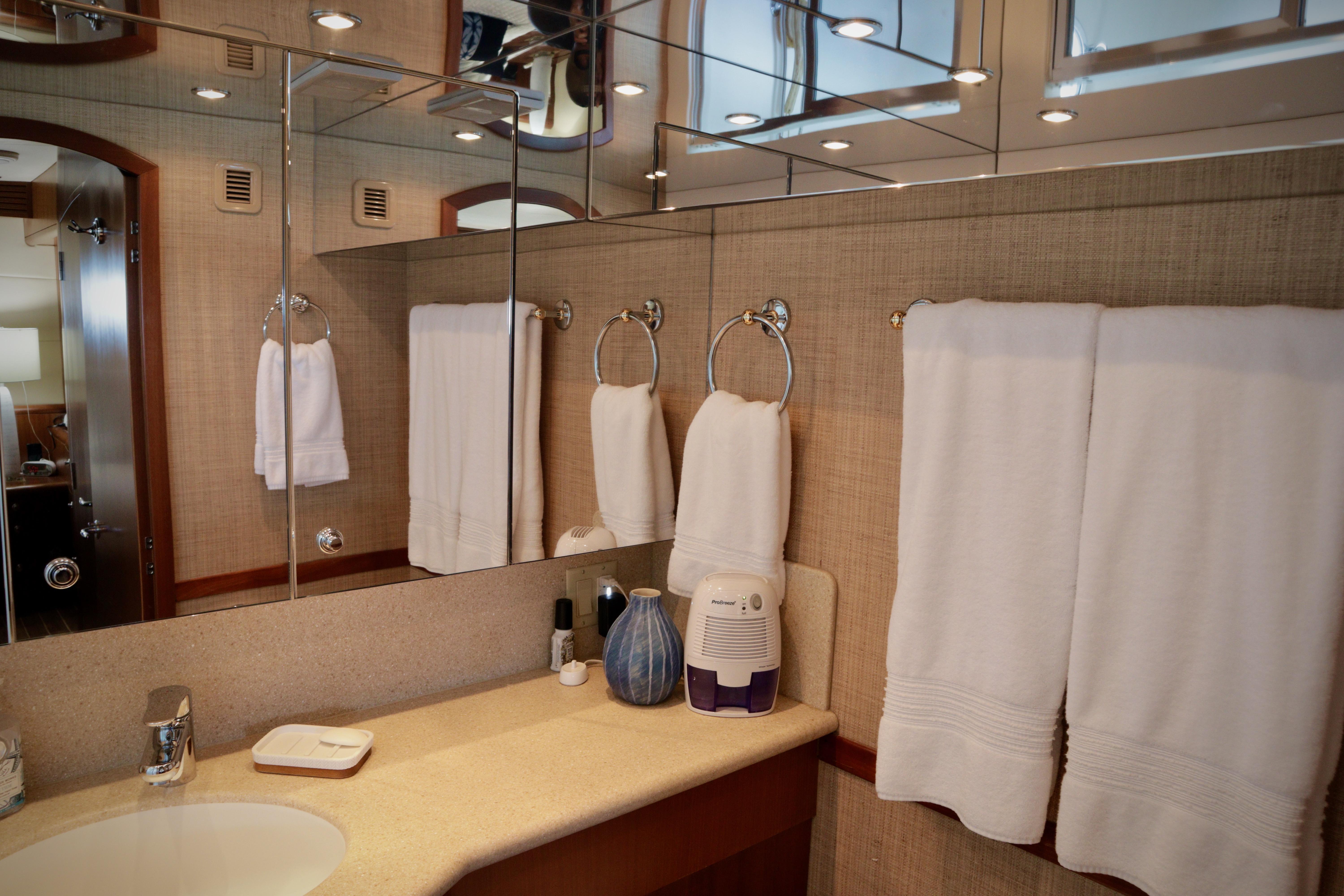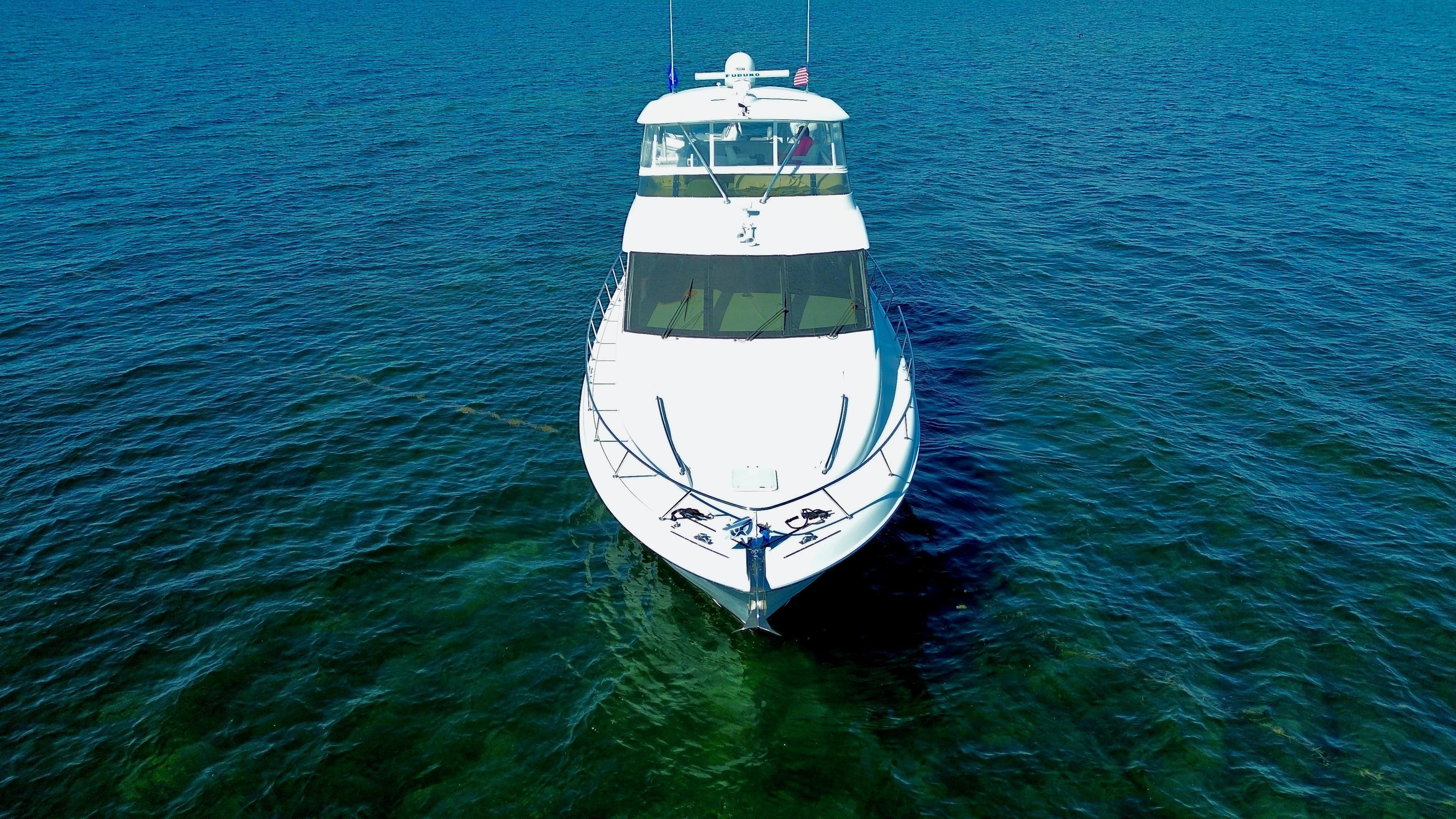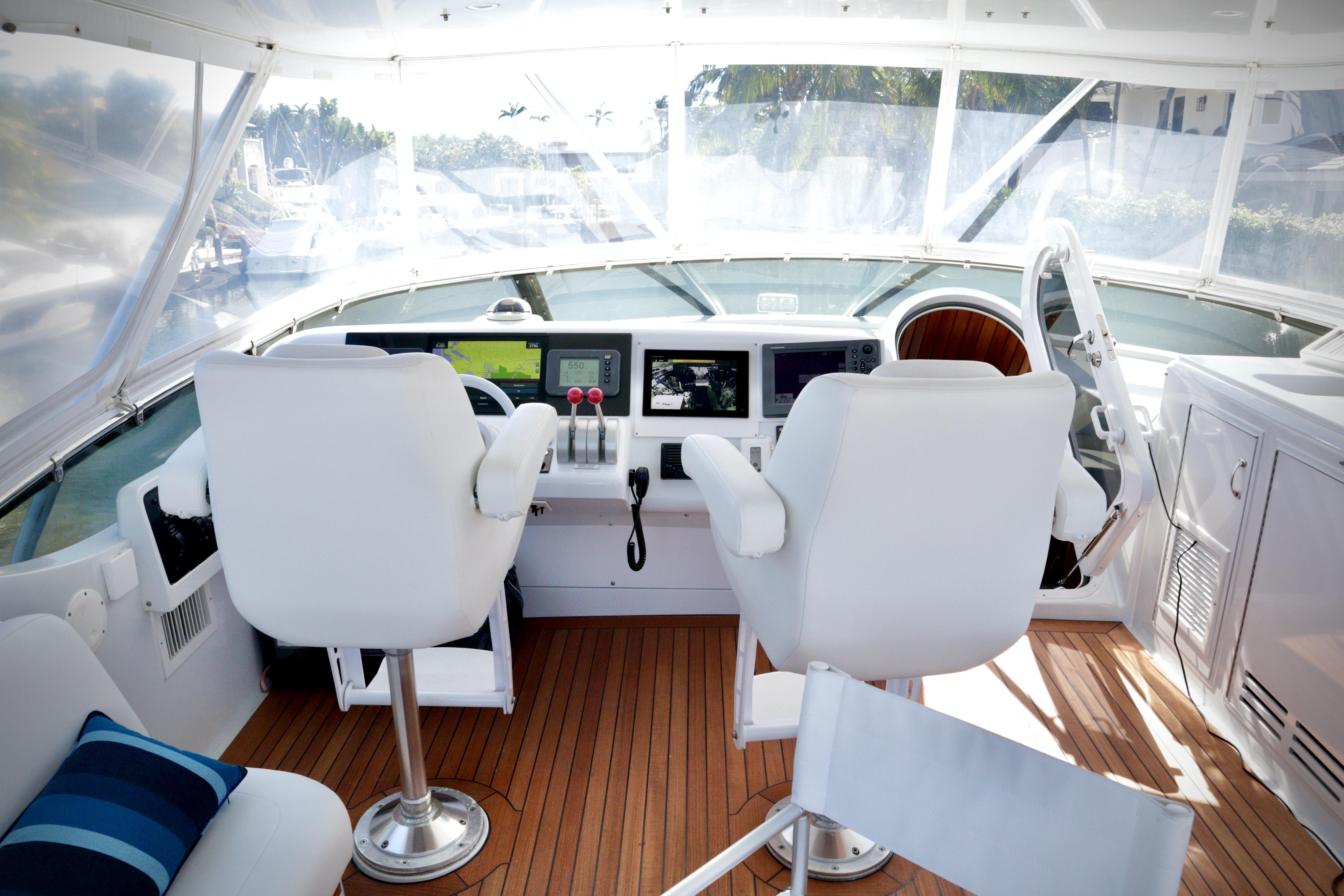 Incorporating a revolutionary hull design, the 6300 cruises effortlessly while still delivering the renowned Hatteras ride. Dock this beauty from the pilothouse - a 25-inch hydraulic bow thruster makes maneuvering a breeze. Note the semi-wraparound console - switches and engine readout displays are well placed for increased readability. The solid surface tabletop and L-shaped lounge provide ample room for dining. Like the rest of the 6300 the flybridge is amazingly spacious - twice as large as most yachts of this size. Entertaining from the upper deck is easy with a built-in wet bar and refrigerator/icemaker near the roomy L-shaped seating area. Lowering the dinghy is simple via a standard, fully hydraulic davit that is cleverly concealed behind the bench seat. Inside, the spacious salon opens to the galley and beyond to the pilothouse in a sweeping vista of roomy elegance and rich wood. Air conditioning is vented through linear slots in the fluted moldings, creating a comfortable airflow through the entire length of the salon and galley. Sink into the plush depths of the standard custom built sectional and enjoy the complete entertainment center and surround sound system. The galley features dual under counter refrigerator/freezers, dishwasher, garbage disposal, four burner cooktop and microwave/convection oven. The elegant master suite runs the entire width of the beam. Two dressers and twin nightstands provide a lavish 21 drawers and a cedar-liner hanging locker offers even more storage. An entertainment center houses the standard TV/VCR and stereo system. The master head features a unique tub and shower combination and large portlights. Every stateroom features its own climate control for individual settings. The bow stateroom boasts a queen-sized berth, adjoining private head, and an abundance of storage with a cedar lined hanging locker and overhead storage cabinets. To the starboard side of the bow is the twin berth stateroom.