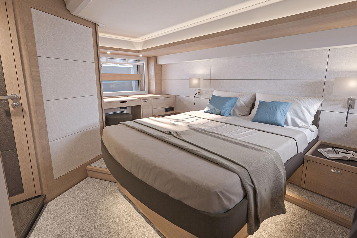 The visually stunning interior environment boasts a well-appointed galley with a raised passagemaker dinette, a large saloon and an attractive “architectural” flybridge stair. Built with six berths, with the option for an additional single crew berth, the layout is perfect for long family cruises. The separate shower cubicles feature Corian flooring with the addition of a rain shower in the ensuite of the full beam aft owner cabin.
