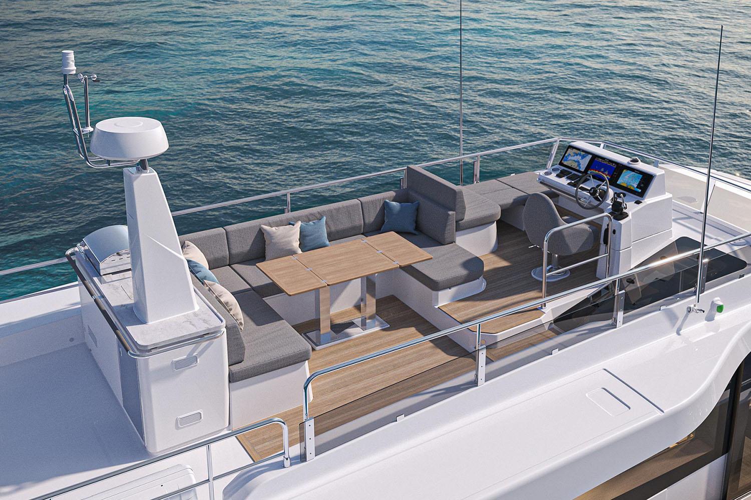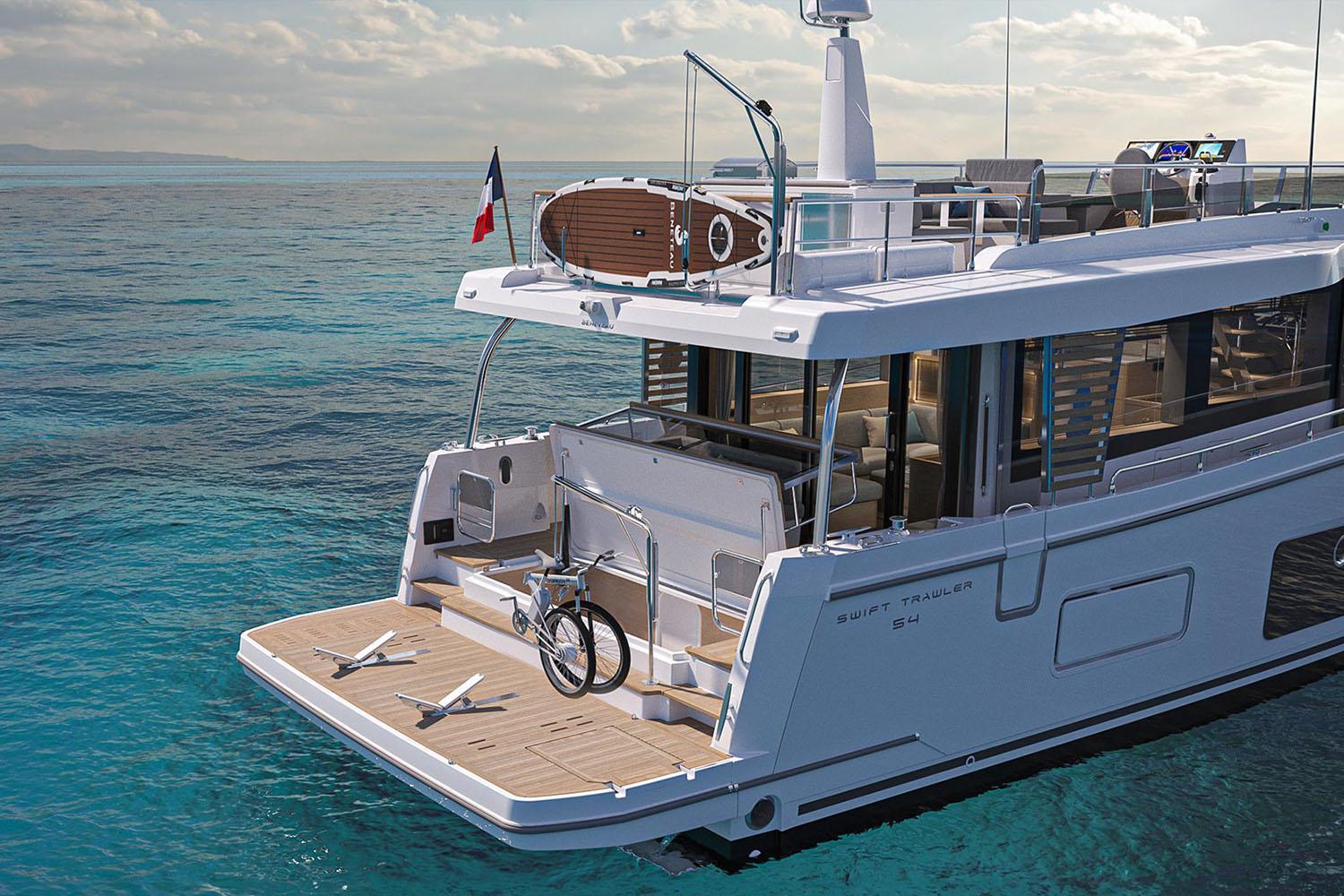 The innovative Swift Trawler 54 passagemaker includes a stunning cockpit and a spacious flybridge, all with soft seating and luxury touches. It offers a terrace to the sea. The stern boasts a 400 kg tender lift, ample storage for kayaks and paddleboards and a hydraulic swim platform with adaptive dinghy chocks. On the foredeck, the U-shaped seating area with an inset table easily converts into a huge sunpad, with dedicated fender stowage underneath. The gentle “S” sheerline line that rises towards the bow gives the hull a purposeful, timeless stance. The clean low profile flybridge above the continuous glass superstructure gives an overall lightness while retaining all the strength needed for a true passagemaker.
