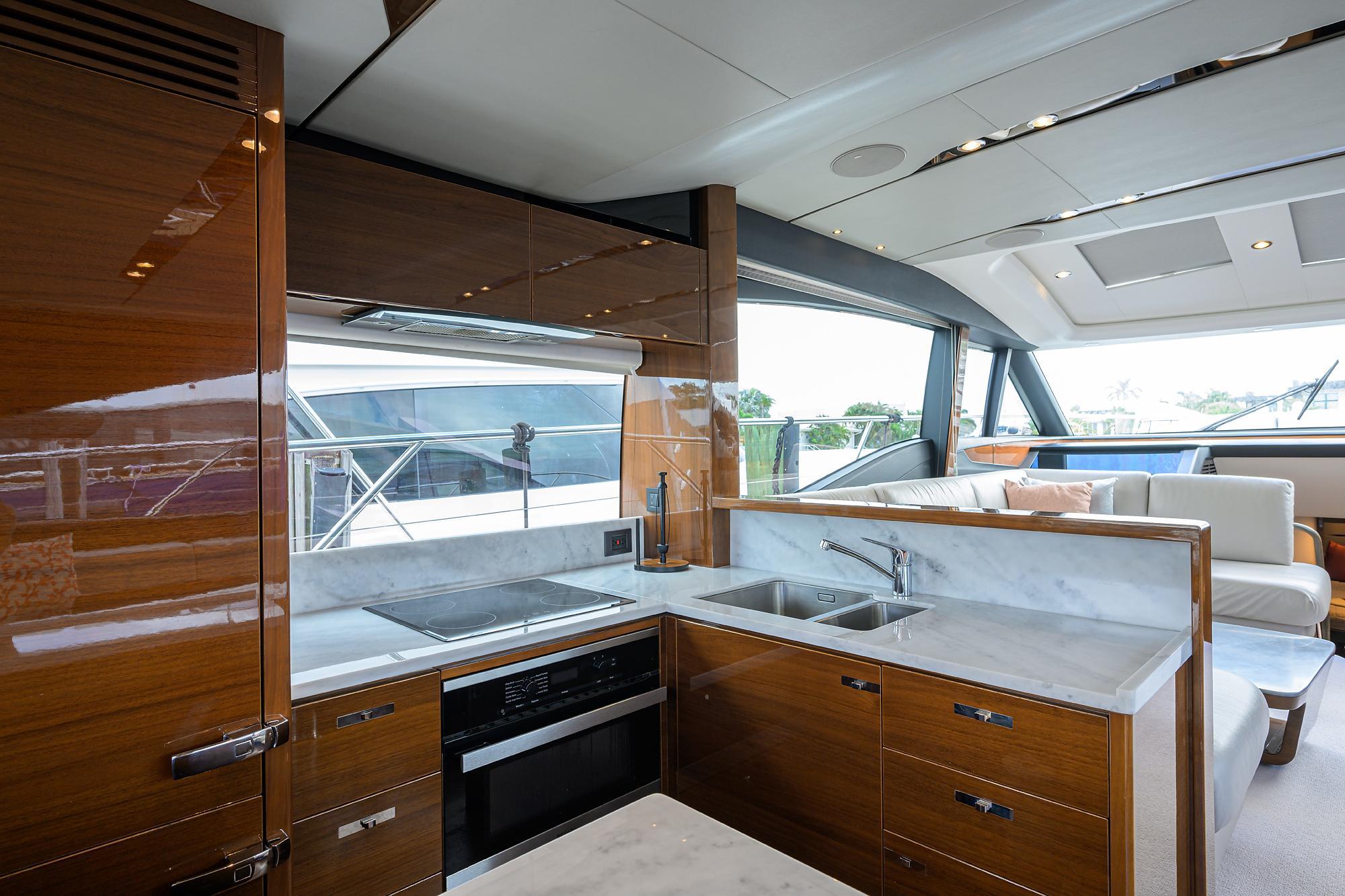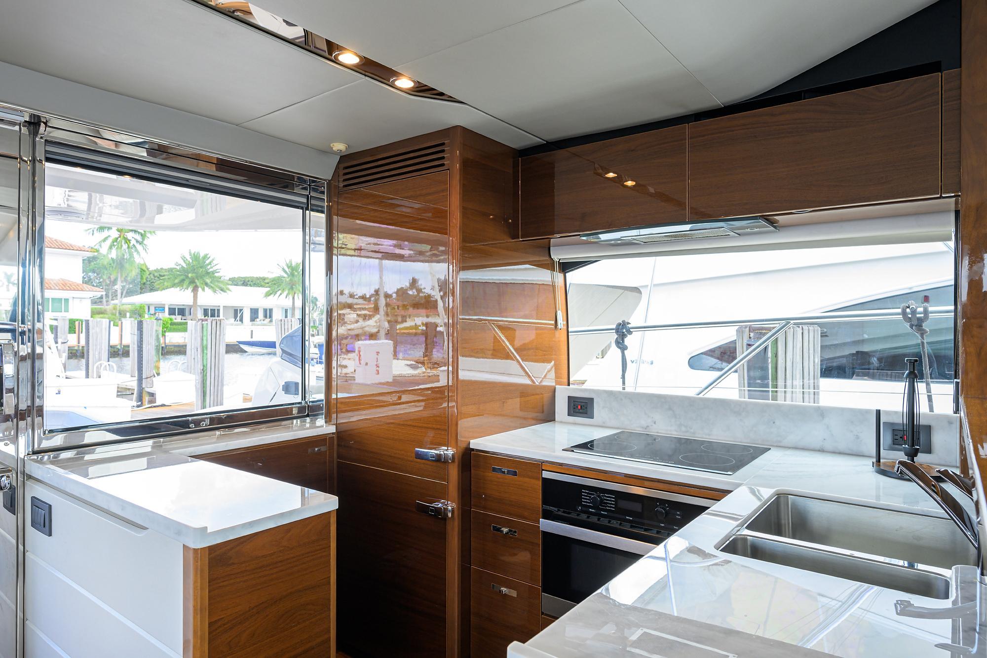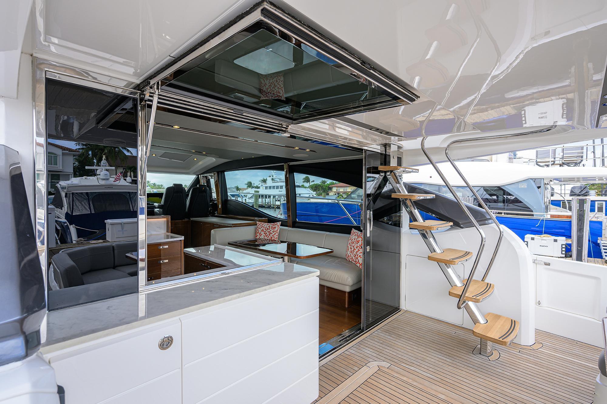 With its elegant exterior profile, the S65 seamlessly harmonizes dynamic design with exhilarating performance. On the main deck you will find an effortless transition from the outdoors to indoors, surrounded by expansive hull length windows, aft sliding doors, an electric sliding roof, and a sophisticated aft galley seamlessly connected to the cockpit.